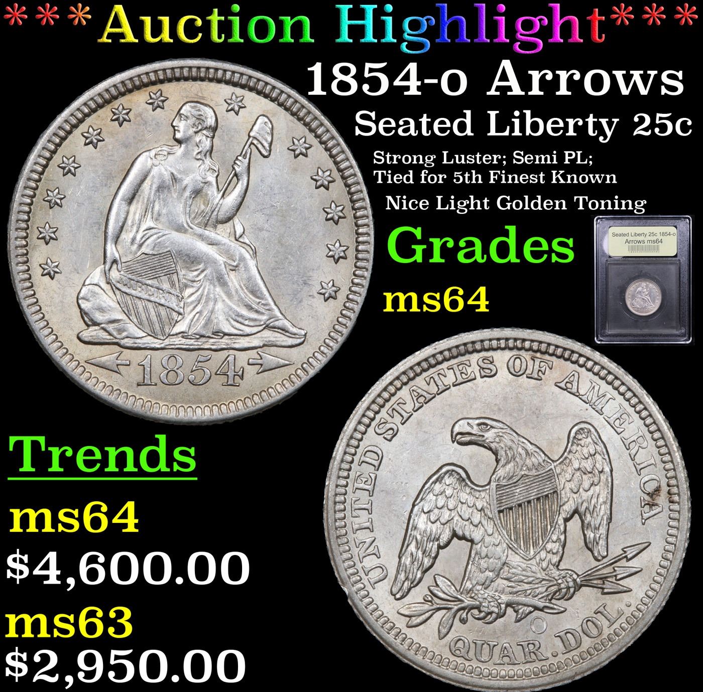 ***Auction Highlight*** 1854-o Arrows Seated Liberty Quarter 25c Graded Choice Unc By USCG. A radiant Choice example that will delight advanced type collectors and Liberty Seated quarter specialists alike. Both sides are highly lustrous with a vibrant, satiny texture to the finish. The surfaces are virtually brilliant, and present as such at most viewing angles, although upon closer inspection one will discern wisps of faint champagne-gold iridescence. The strike is uncommonly sharp by the standards of the issuing Mint, and the level of preservation is nothing short of remarkable in an 1854-O quarter. This is one of only two New Orleans Mint issues of the Arrows, No Motto Liberty Seated quarter type, and it is more plentiful than the 1855-O in all grades. On the other hand, the 1854-O is far rarer than the 1854, and it is also scarcer than the 1855. In Mint State the 1854-O is highly elusive, with such pieces rated as Rarity-6 by Larry Briggs in the 1991 reference The Comprehensive Encyclopedia of United States Liberty Seated Quarters. Among the finest certified, this delightful near-Gem is sure to catch the eye of astute bidders. A Corey's Pick, Bid to Win, Don't let it get Away, you might not find its equal Coin. I give this coin my highest recommendation
