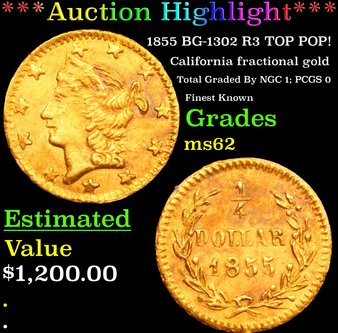 ***Auction Highlight*** 1855 BG-1302 R3 TOP POP! California fractional gold 25c Grades Select Unc (f