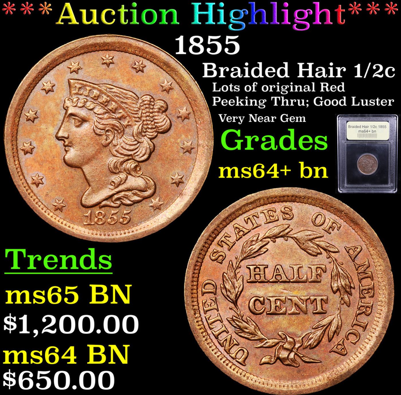 ***Auction Highlight*** 1855 Braided Hair Half Cent 1/2c Graded Choice+ Unc BN By USCG. Per Ron Guth of PCGS : The Braided Hair half cents boast some of the lowest mintages of any U.S. coin types and are among the best values, as well. Every date in this type boasts a low mintage. By way of comparison, the mintage of the any Braided hair Half Cent is almost a fraction of the mintage of the 1909-S VDB Lincoln Cent (a far more valuable coin), making this an excellent value.