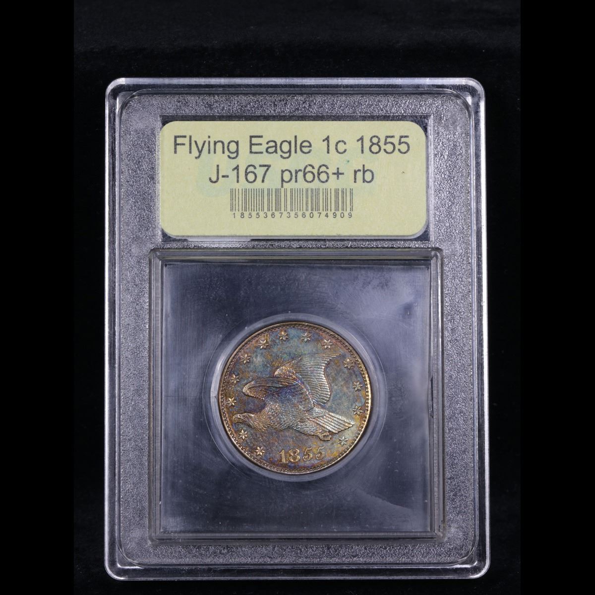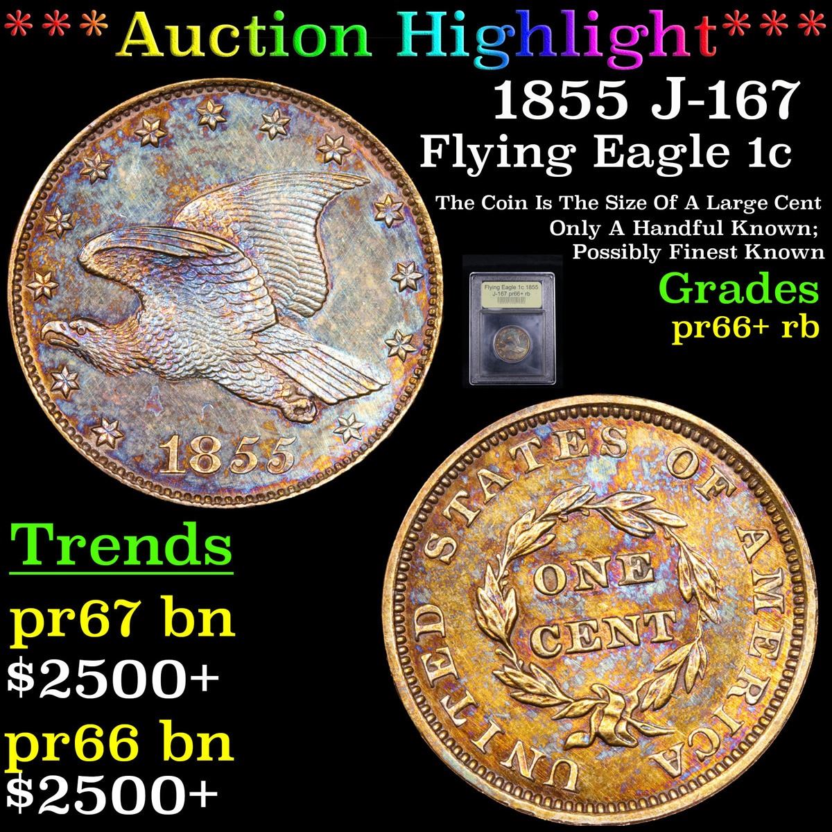 ***Auction Highlight*** 1855 J-167 The Coin Is The Size Of A Large Cent Only A Handful Known; Possibly Finest Known Flying Eagle Cent 1c Graded Gem++ Proof RB By USCG. Per Jamie Hernandez PCGS: In 1854 the Mint started experimenting by producing small pattern cents in order to replace the Large cent coins.