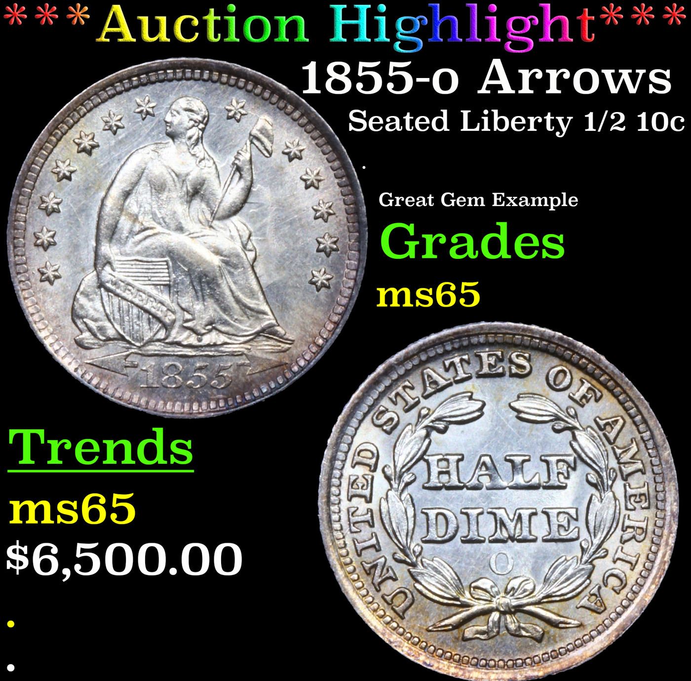 ***Auction Highlight*** 1855-o Arrows Seated Liberty Half Dime 1/2 10c Graded ms65 BY SEGS. A Key Date's Pick, Bid to Win, Don't let it get Away, you might not find its equal Coin