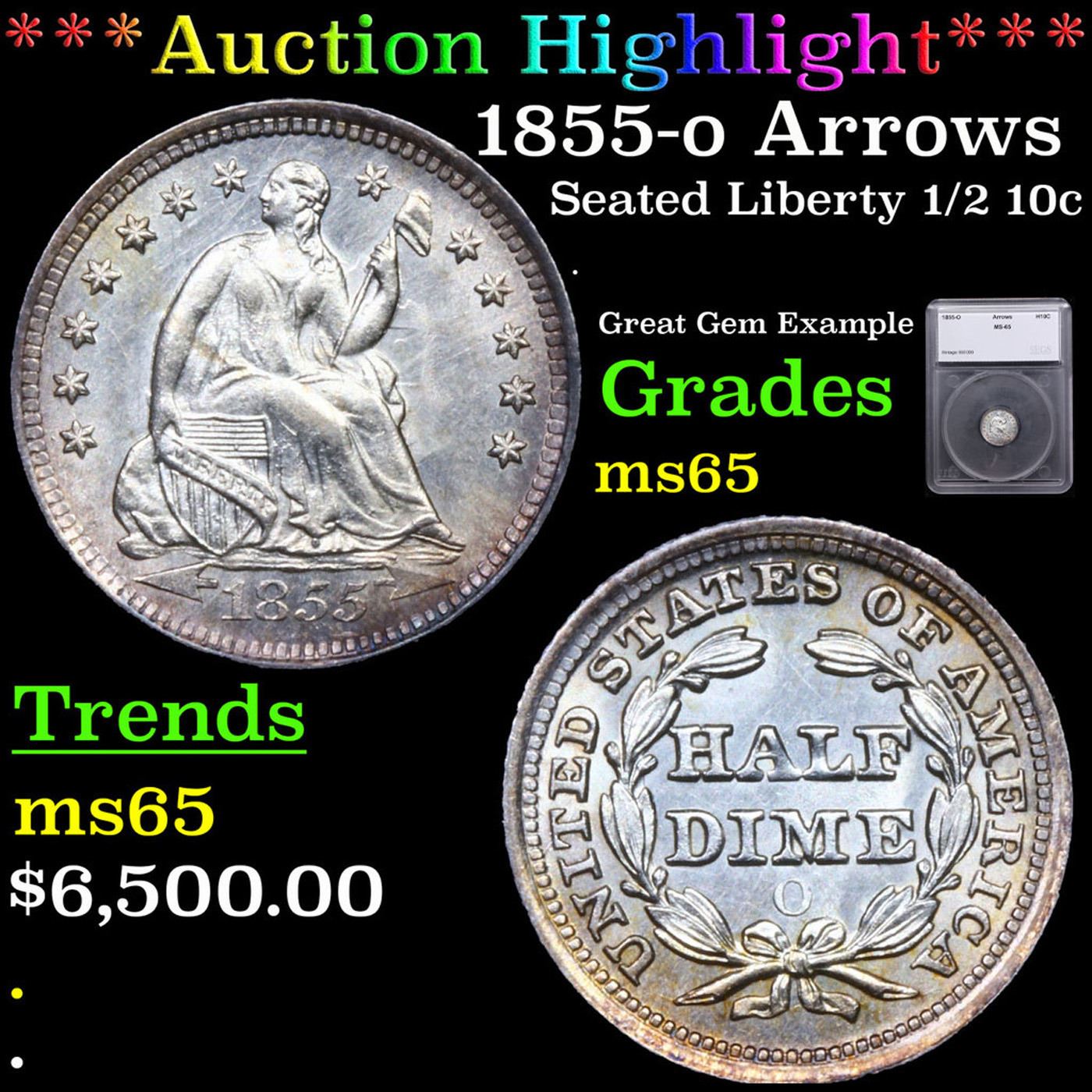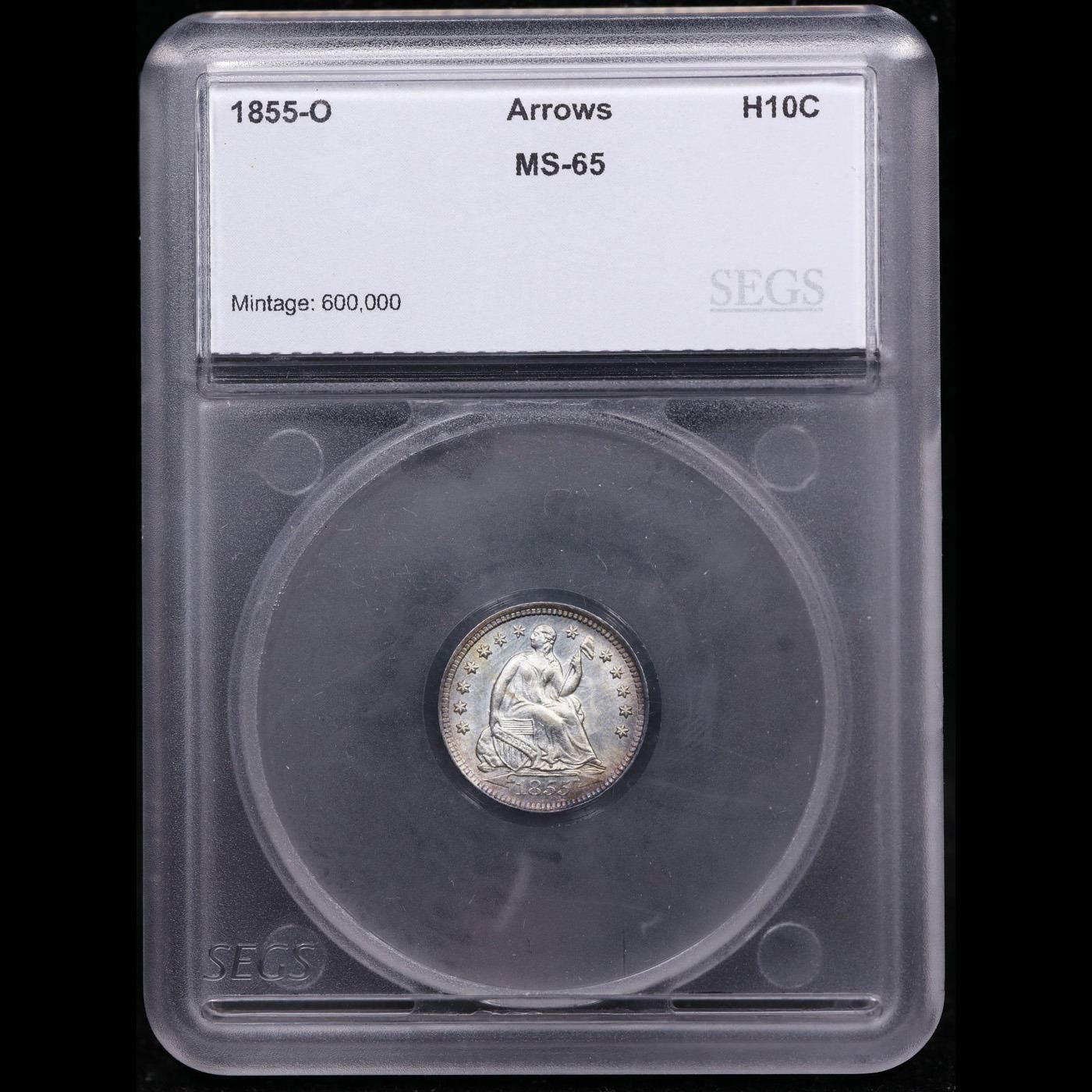 ***Auction Highlight*** 1855-o Arrows Seated Liberty Half Dime 1/2 10c Graded ms65 BY SEGS. A Key Date's Pick, Bid to Win, Don't let it get Away, you might not find its equal Coin