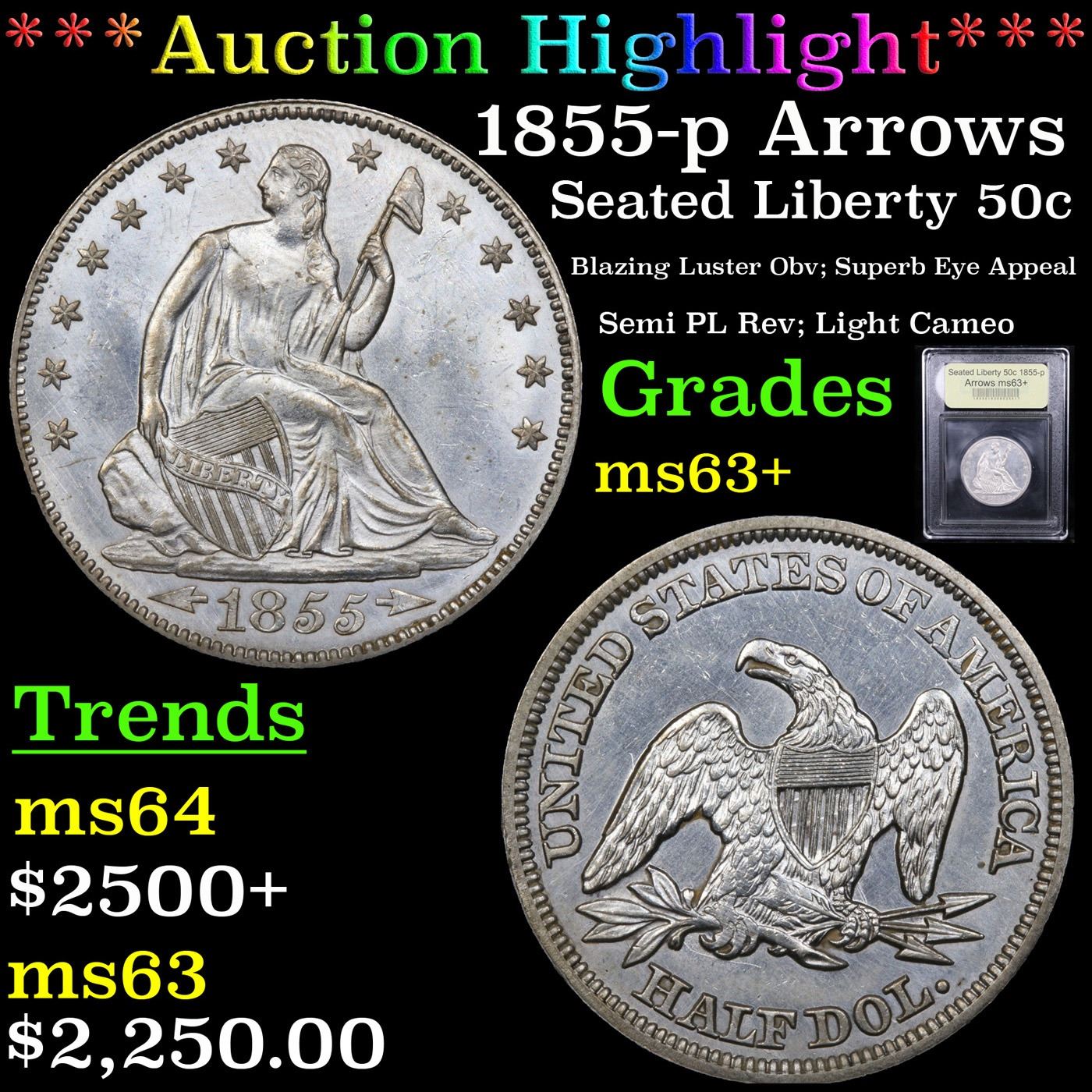 ***Auction Highlight*** 1855-p Arrows Seated Half Dollar 50c Graded Select+ Unc By USCG. The 1855 Arrows Seated Liberty half dollar claims a nominal business-strike mintage of 759,500 pieces and the issue is prized by date and type collectors alike. This piece exhibits the normal date characteristic of the WB-101 variety. Randy Wiley and Bill Bugert comment, "Scarce to very scarce in all grades. Commanding a premium about double the common type price." The present coin is a high-end Uncirculated example, one of the finest known surviving examples, likely near 20th finest. The design elements are sharply detailed and Vibrant mint luster shines on the obverse and a near Prooflike reverse with a great light cameo adorns the reverse. A Corey's Pick, Bid to Win, Don't let it get Away, you might not find its equal Coin