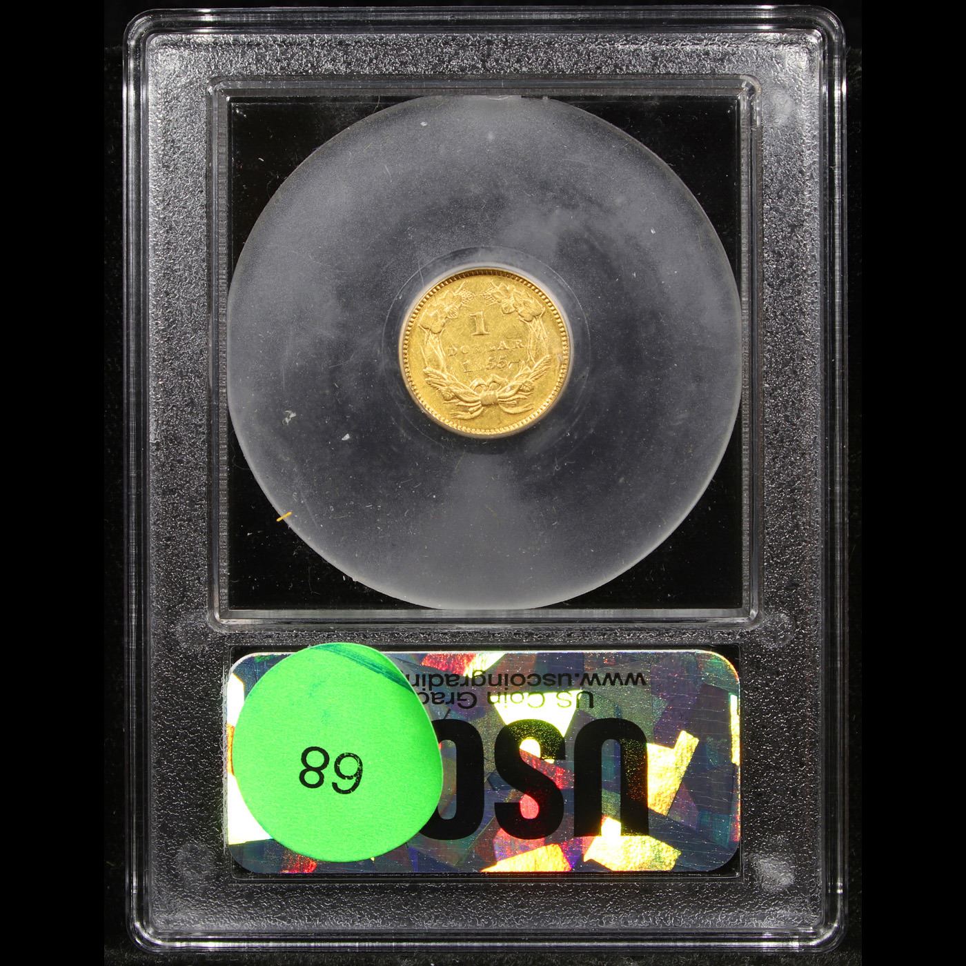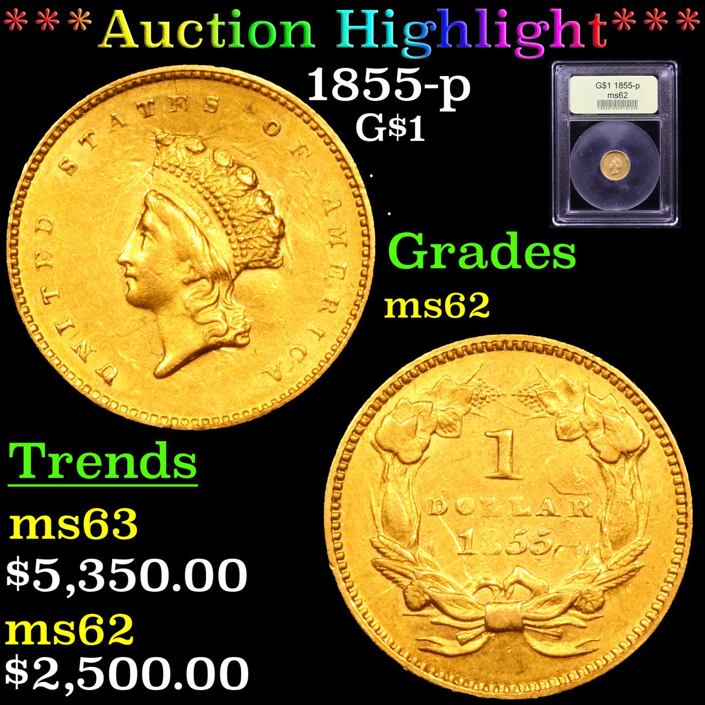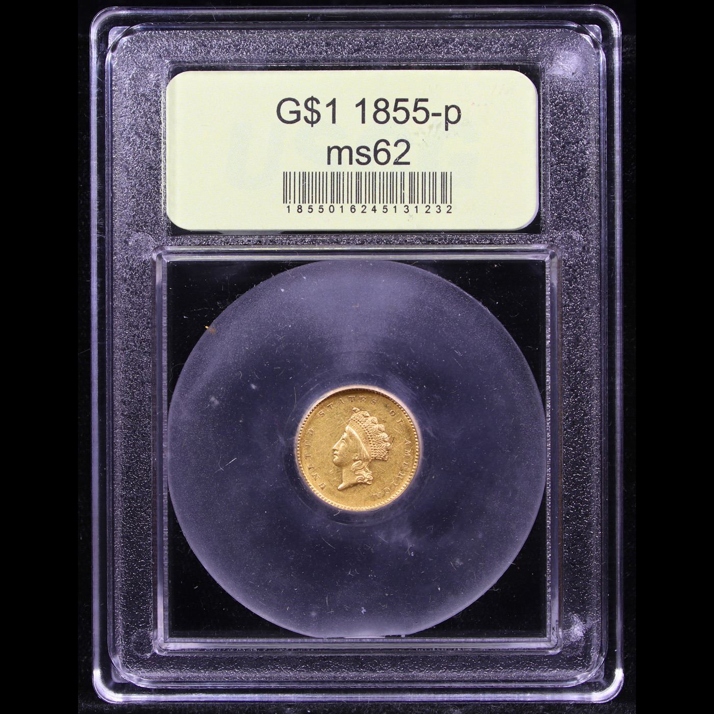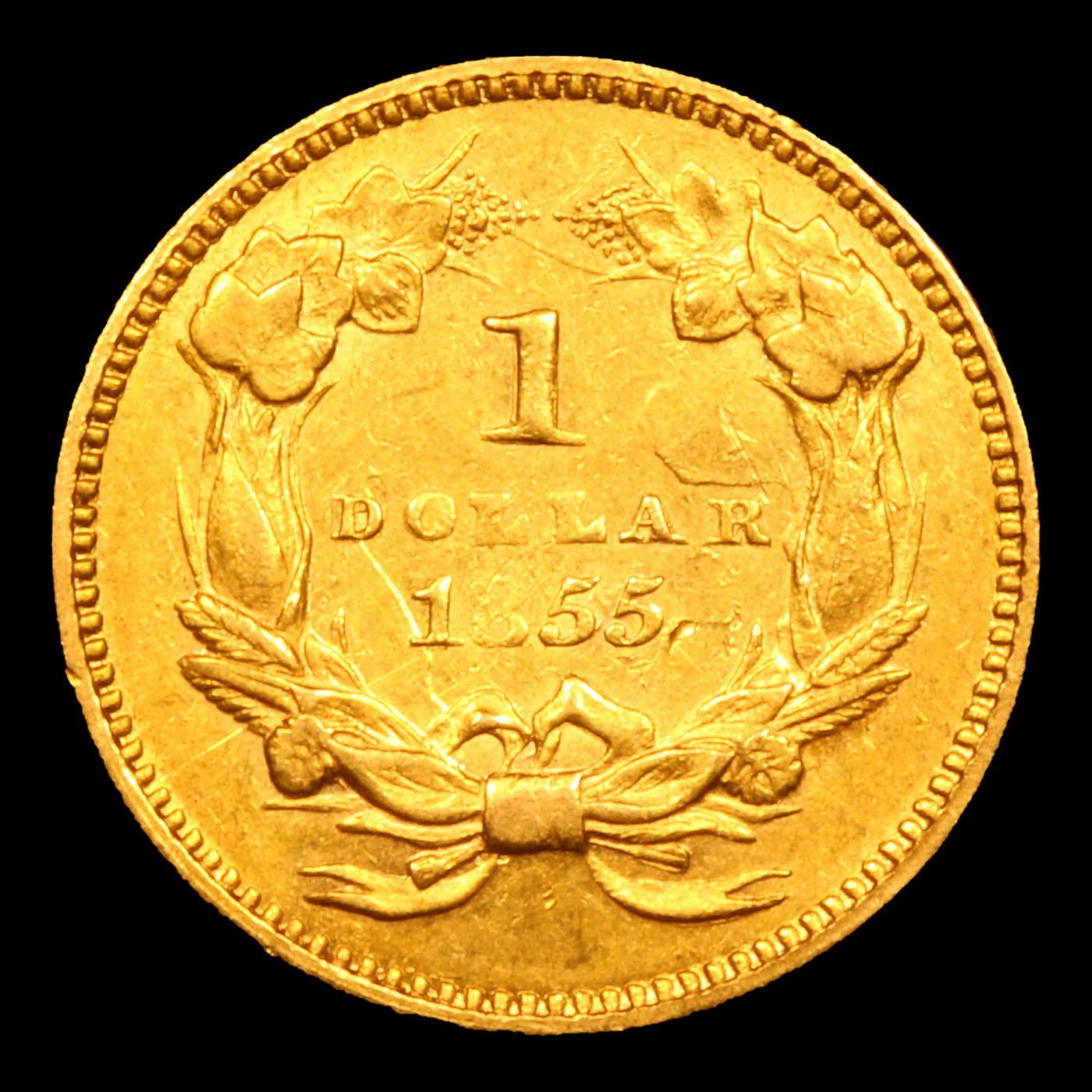 ***Auction Highlight*** 1855-p Gold Dollar $1 Graded Select Unc By USCG. The small 12.7 mm diameter of the Type I gold dollar brought about a few complaints of it being easy to lose, like the silver trime. To address this, Longacre enlarged the diameter to 14.3 mm, but he also completely revised the design, replacing it with an Indian design with a crown of feathers resembling his design on the newly introduced three-dollar gold piece. He also moved the inscription UNITED STATES OF AMERICA to the obverse from the reverse. The reverse laurel wreath was replaced with the cereal wreath Longacre employed on the three-dollar denomination and that was later adopted for the Flying Eagle cent. Even with these design changes, challenges faced Mint personnel when striking the coins. Because the weight of the denomination remained unchanged, the coins were made slightly thinner. The obverse Indian head bust of Liberty was in too high a relief for the thinner planchets, and most examples displayed poor definition in and around the centers. To further complicate matters, the dies often clashed early and frequently during press runs, and many survivors exhibit numerous pronounced clash marks. Bowers estimates 90% of all 1854 Type II dollars bear such clash marks on one or both sides. These striking deficiencies prompted the third and final redesign in 1856, enlarging the bust and flattening its relief profile.