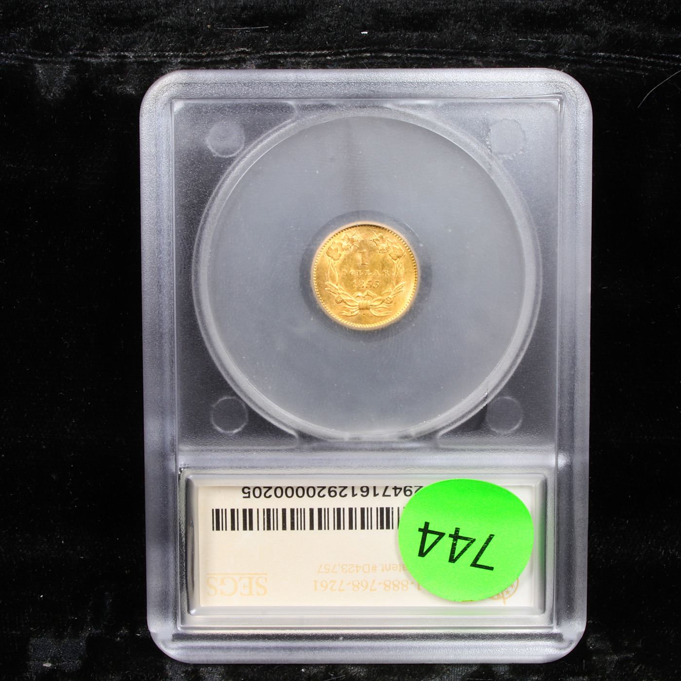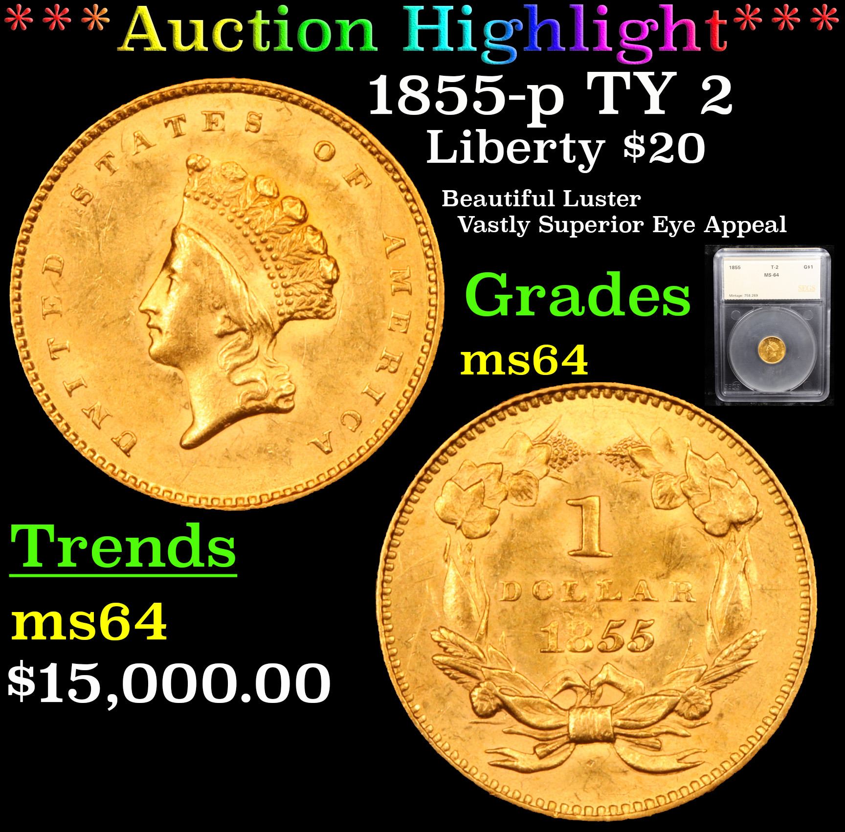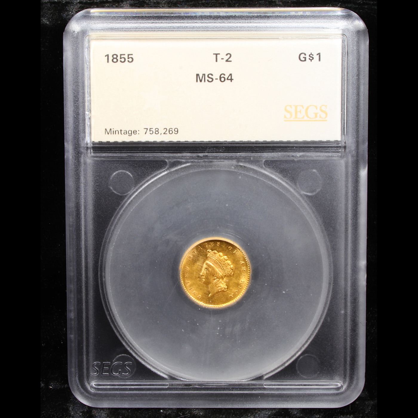 ***Auction Highlight*** 1855-p TY 2 Gold Dollar $1 Graded ms64 By SEGS.        TA generally sharp example for the type, this attractive near-Gem also sports full mint luster and pretty golden-rose patina. The brief Type II gold dollar series of 1854 to 1856 is among the more conditionally challenging in U.S. coinage history. The only realistic type candidates in the finer Mint State grades are the 1854 and 1855, both of which issues are still scarce when viewed in the wider context of the numismatic market. This is an attractive piece in all regards that comes highly recommended for inclusion in a high quality collection. A Corey's Pick, Bid to Win, Don't let it get Away, you might not find its equal Coin.  I give this coin my highest recommendation