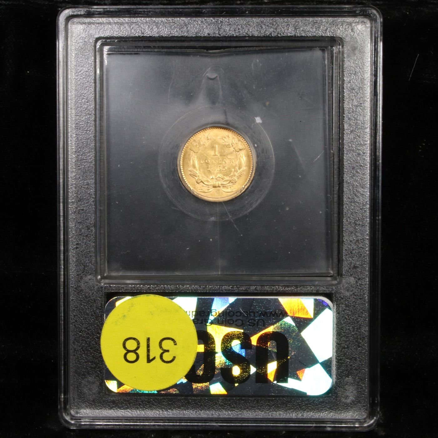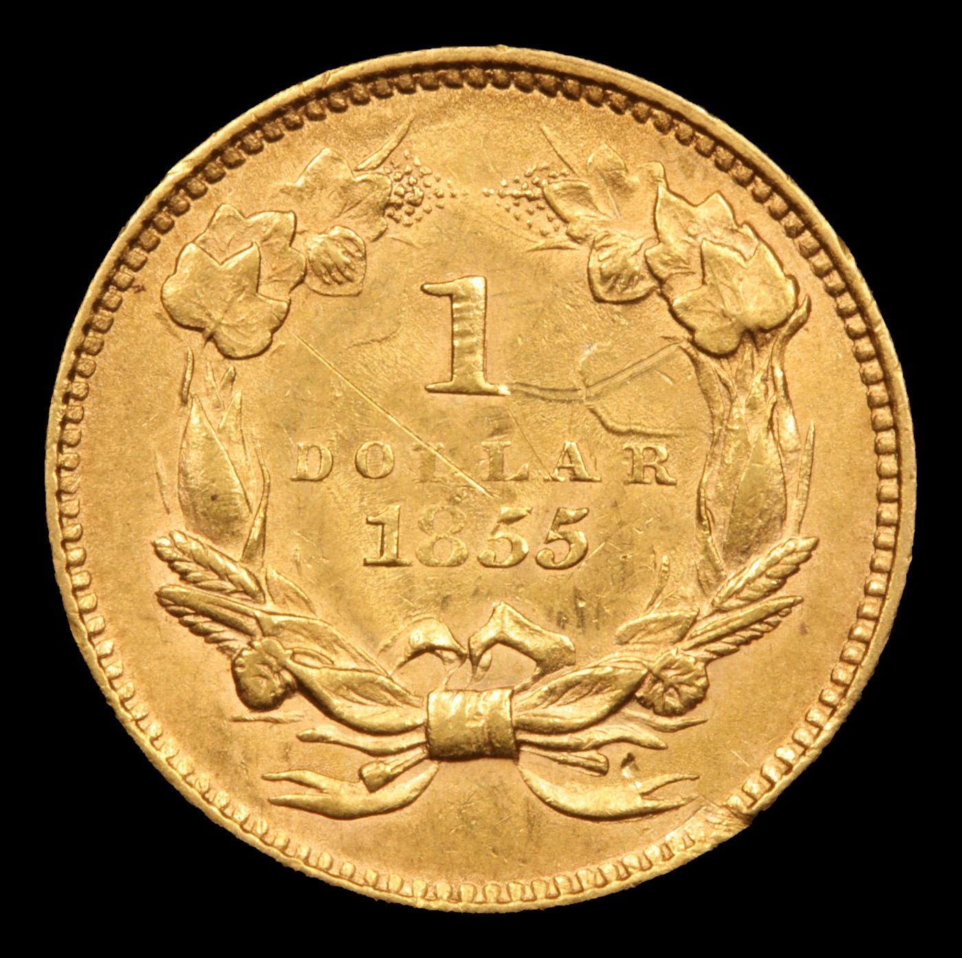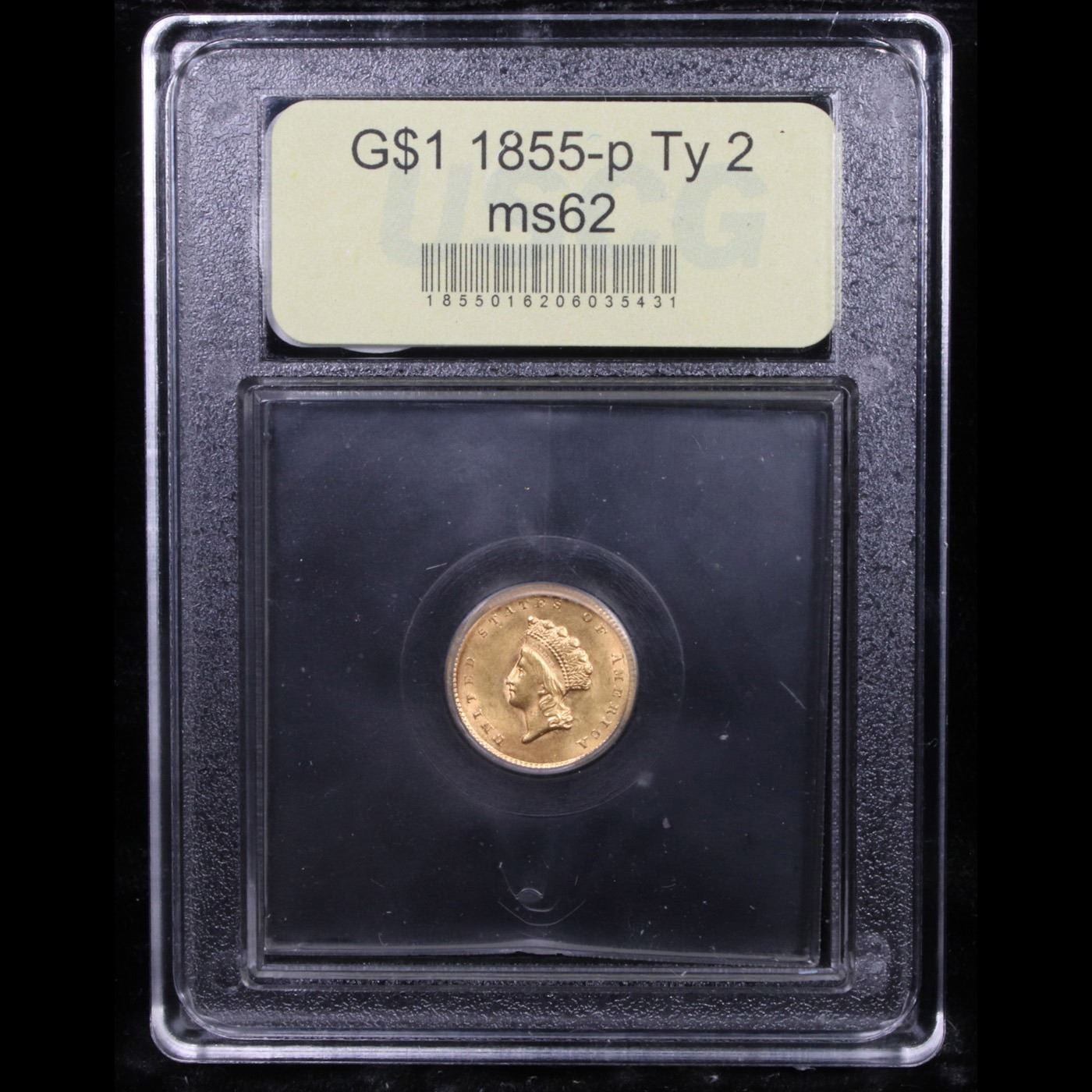 ***Auction Highlight*** 1855-p Ty 2 Gold Dollar $1 Graded Select Unc By USCG. The 1855 gold dollar usually trades as a type coin, like its even more available counterpart from the previous year. This high-end MS62 example exhibits well-detailed design elements, with the often-seen softness on the central reverse. The lustrous surfaces show only minor signs of contact, but some impressive clash marks are visible on both sides A Corey's Pick, Bid to Win, Don't let it get Away, you might not find its equal Coin. I give this coin my highest recommendation