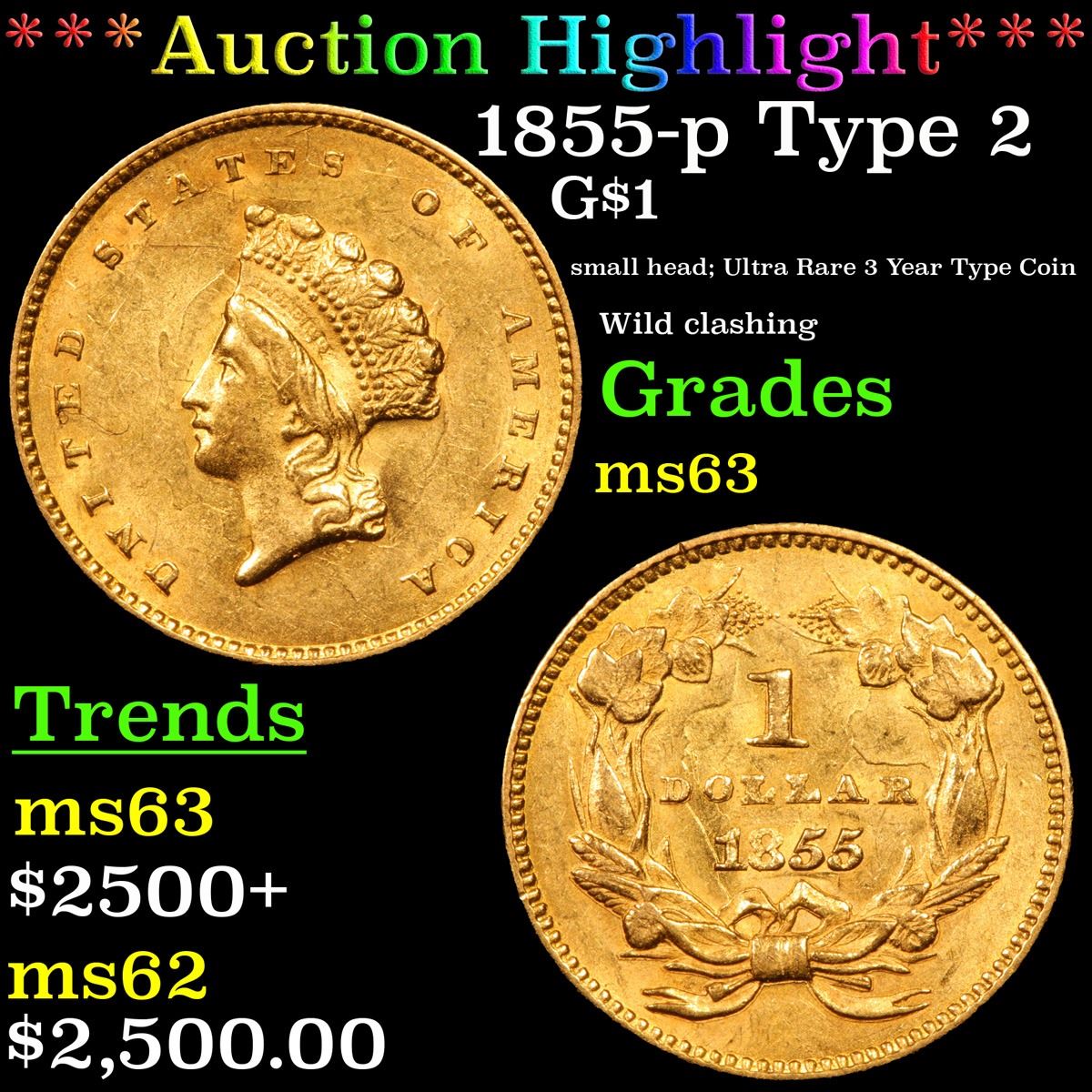 ***Auction Highlight*** 1855-p Type 2 Gold Dollar $1 Grades Select Unc. Heavy clash marks appear on both sides of this Select Mint State Type Two gold dollar that exhibits frosty mint luster and splendid yellow-gold surfaces. A glass reveals the few trivial marks that prevent a higher numerical grade. An outstanding representative of this short-lived design.