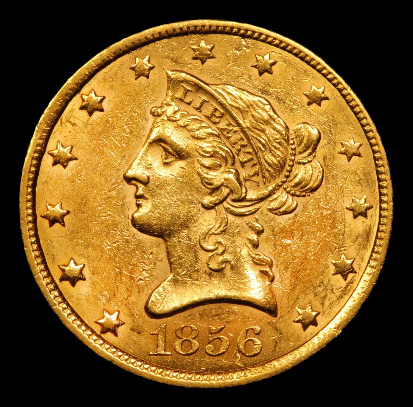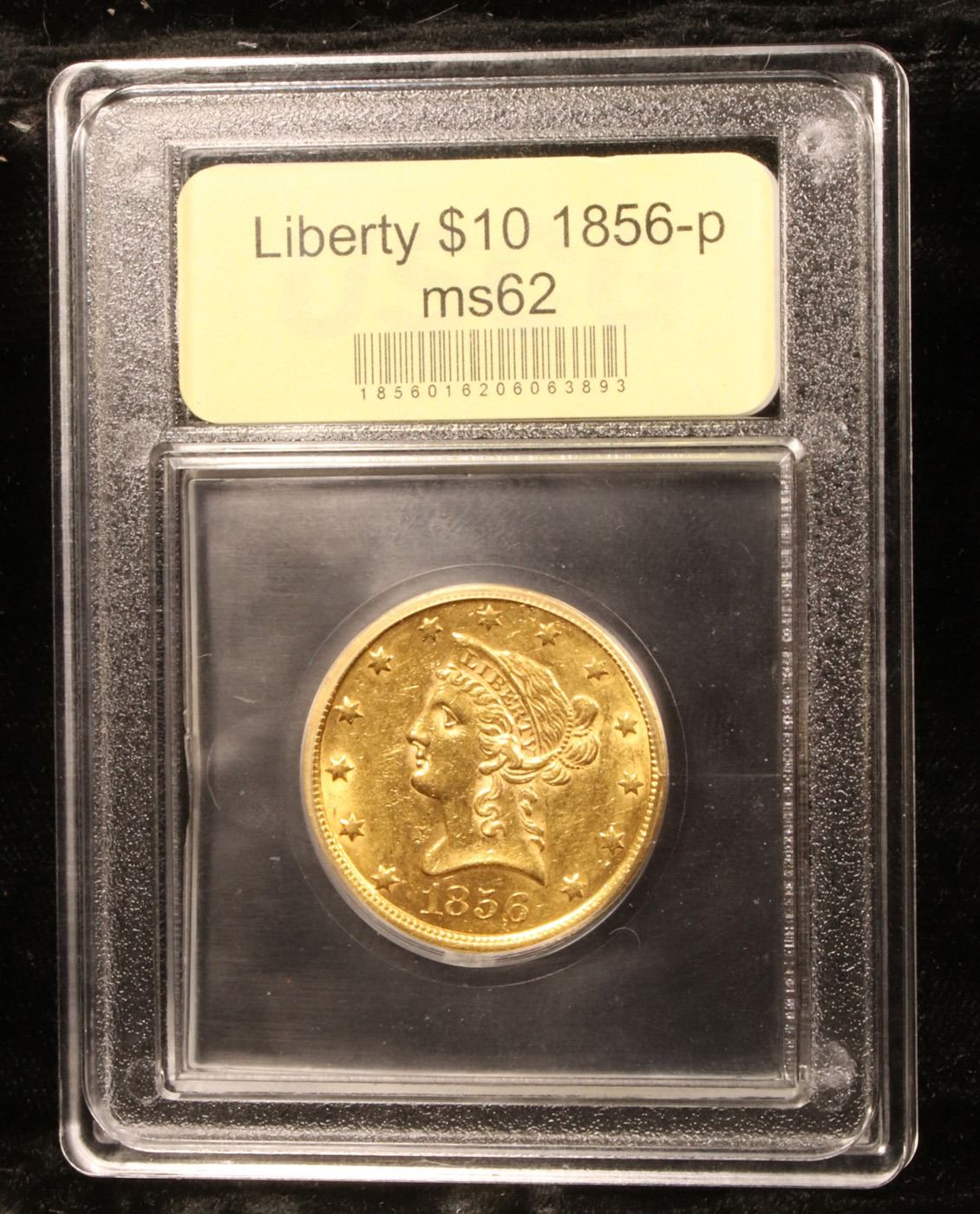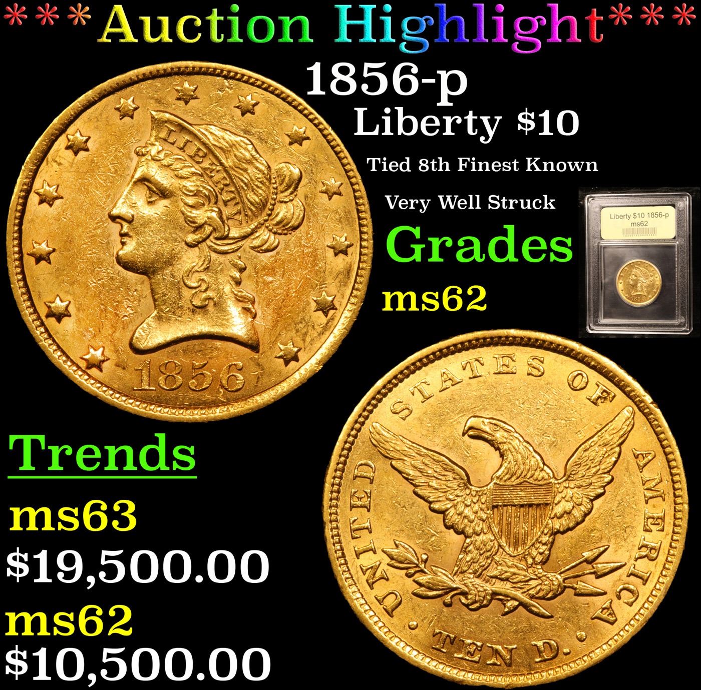 ***Auction Highlight*** 1856-p Gold Liberty Eagle $10 Graded Select Unc BY USCG. Difficult to find in any grade, this issue is a genuine condition rarity in Mint State. Since double eagles were the preferred gold denomination of bankers and exporters, the 1856 ten dollar mintage was only 60,490 pieces. Most of the several hundred survivors are in circulated grades. The present orange-gold example features a good strike and pleasing eye appeal. It is tied for 8th finest known, but that is likely an inflated figure due to resubmissions. Probably closer to 5th. A Corey's Pick, Bid to Win, Don't let it get Away, you might not find its equal Coin. I give this coin my highest recommendation