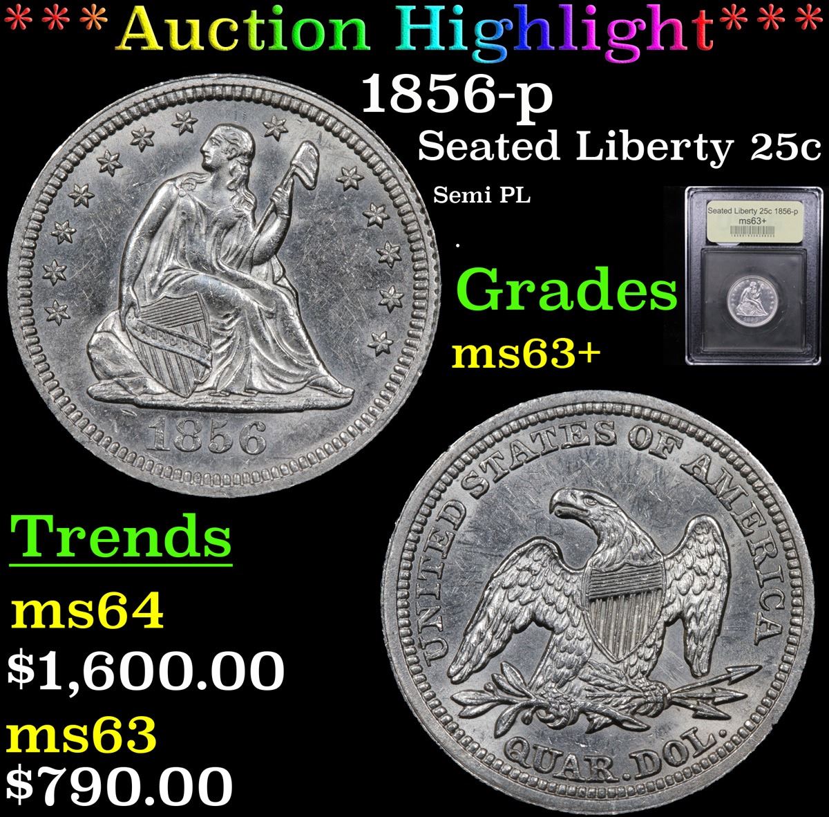 ***Auction Highlight*** 1856-p Seated Liberty Quarter 25c Graded Select+ Unc By USCG. 0