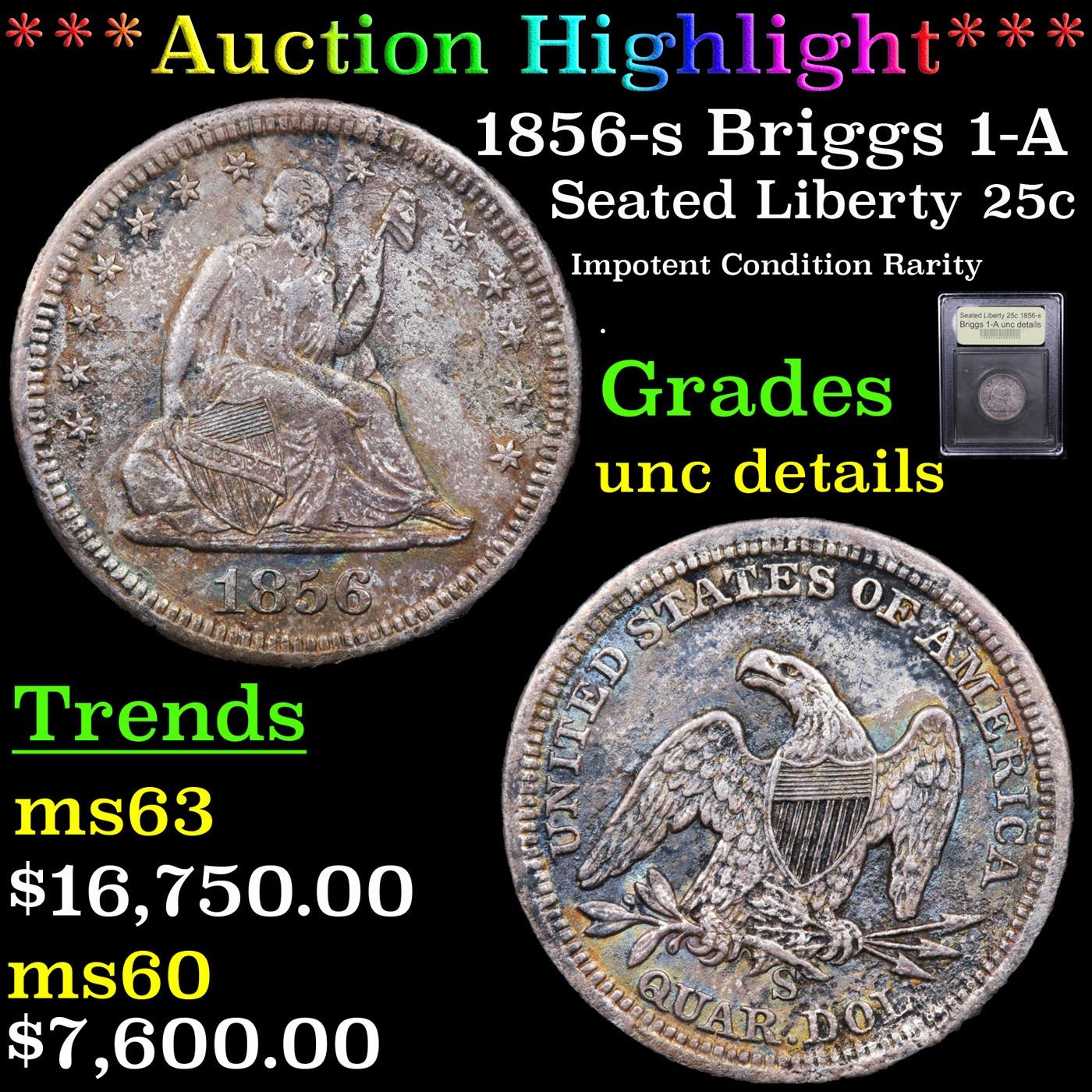 ***Auction Highlight*** 1856-s Briggs 1-A Seated Liberty Quarter 25c Graded Unc Details By USCG. 0 The pearl gray surfaces of this Mint State rarity are adorned by a rainbow of emerald, amber and magenta iridescence on both sides. A pleasing intricacy is expressed by the central motifs, which remain well defined for the assigned grade. This color also extends to the fields where a delightfully satisfying complexion dominates. An attractive unc details example with some surface porosity to represent this low mintage rarity. The 1856-S is highly elusive in all grades, especially those above VF. It's doubtful that as many as 20 Mint State examples can be accounted for. In cases such as this, the mintage figure (286,000 coins) provides no useful guidance when trying to formulate a bid; the most important information available is population data, and the caveat here is that some individual coins may have been certified multiple times. This is certainly a rare find for the advanced collector specializing in the challenging Liberty Seated quarter series.