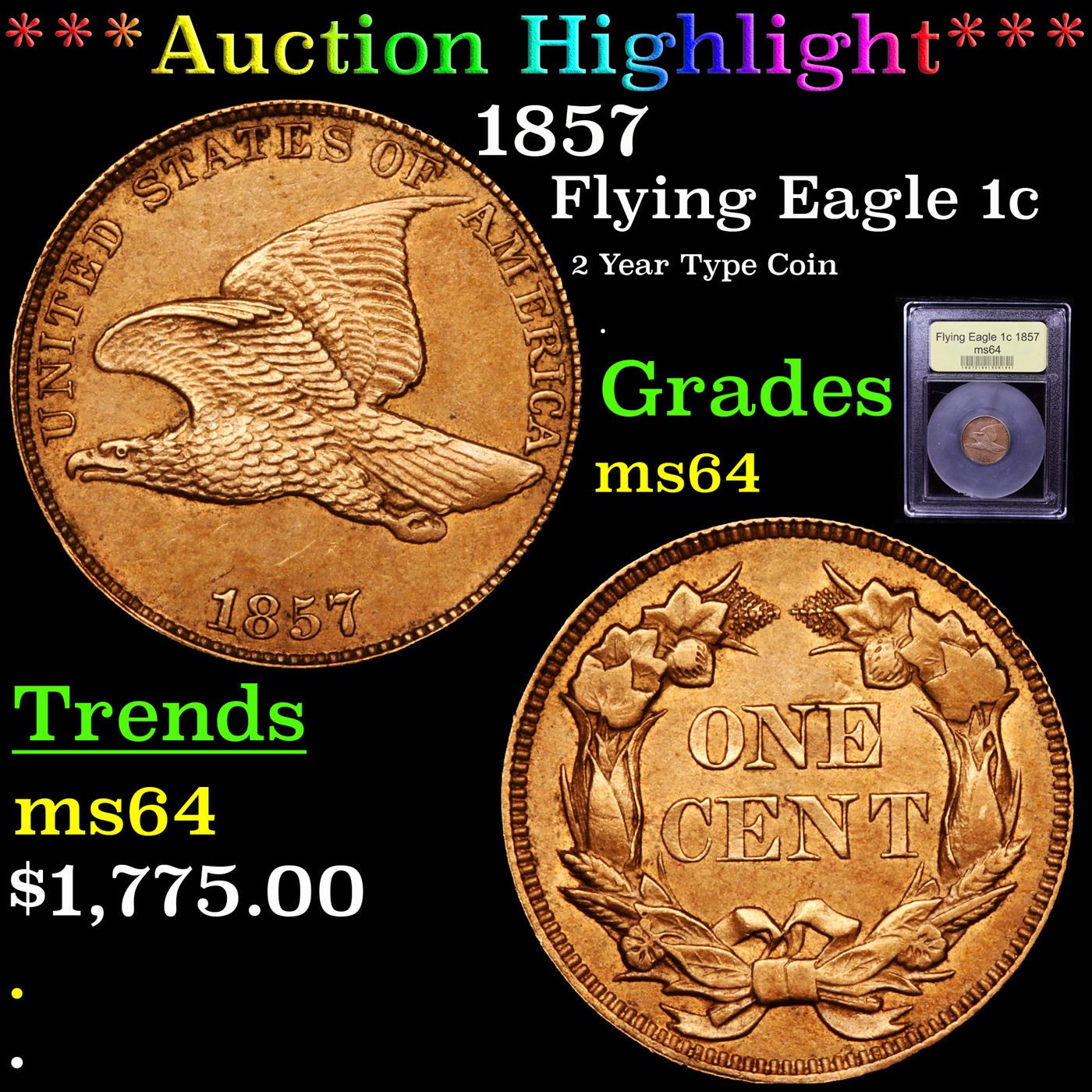***Auction Highlight*** 1857 Flying Eagle Cent 1c Graded Choice Unc By USCG. A Corey's Pick, Bid to Win Coin