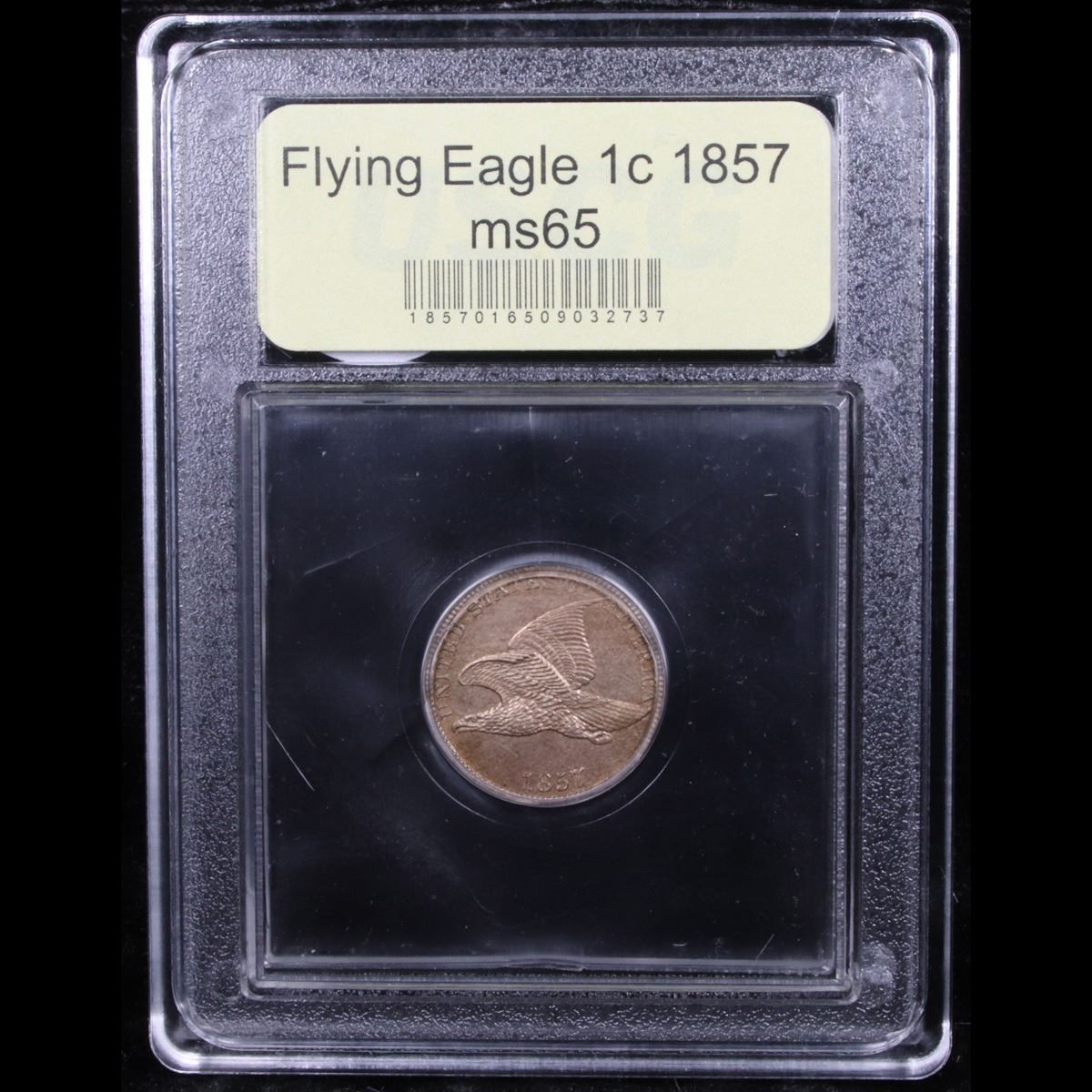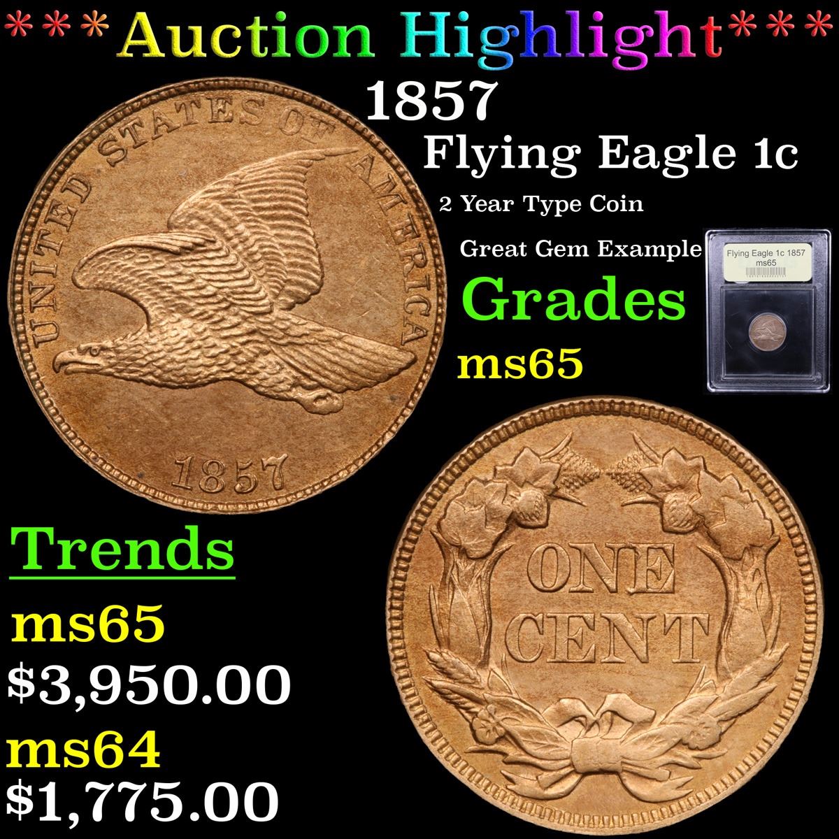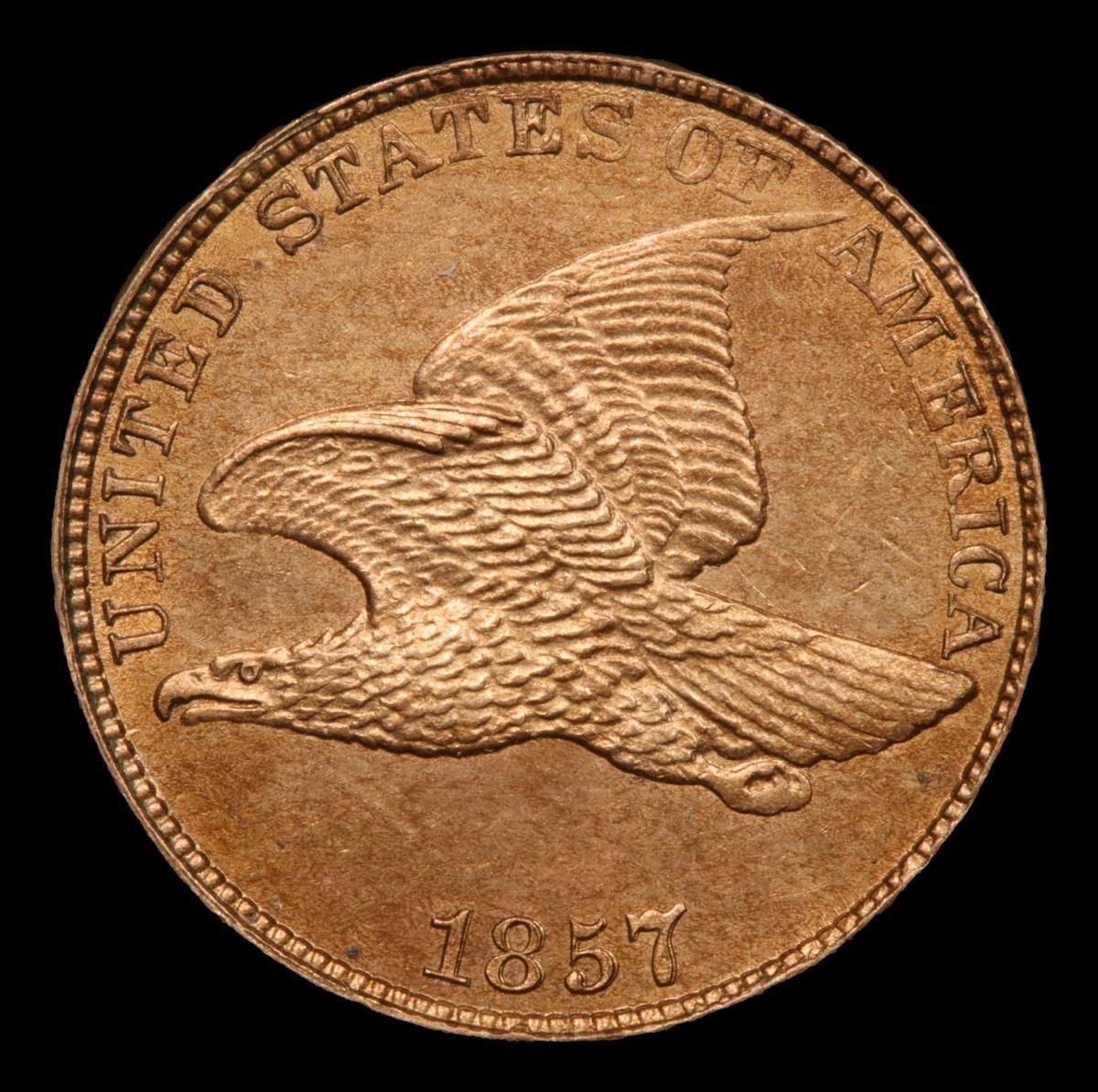 ***Auction Highlight*** 1857 Flying Eagle Cent 1c Graded GEM Unc BY uSCG. This is an exceptionally well preserved, highly attractive example of the brief and conditionally challenging Flying Eagle cent series of 1856 to 1858. Razor sharp striking detail, softly frosted luster and pretty pinkish-tan patina greet the viewer from both sides. Silky smooth in appearance with eye appeal to spare. The first examples of this issue were released to the public on May 25, 1857, amid much excitement. At the Philadelphia Mint two facilities were set up in the yard to distribute them, and long lines formed as citizens sought the new pieces. Over 17.4 million examples were eventually struck, and the current piece ranks among the finest survivors from that mintage. A Corey's Pick, Bid to Win, Don't let it get Away, you might not find its equal Coin