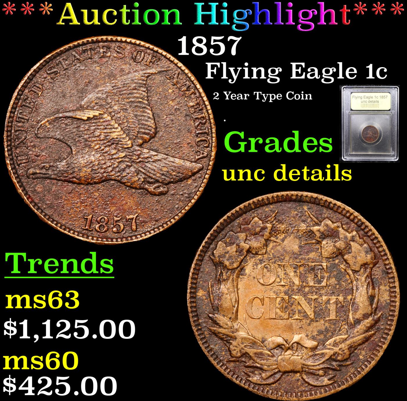***Auction Highlight*** 1857 Flying Eagle Cent 1c Graded Unc Details By USCG.