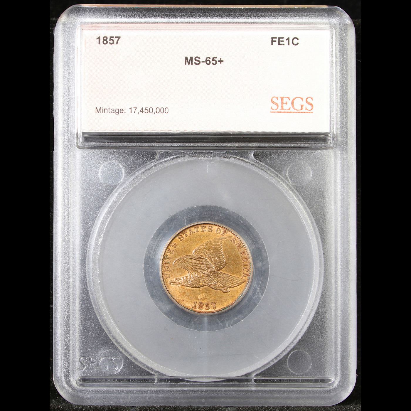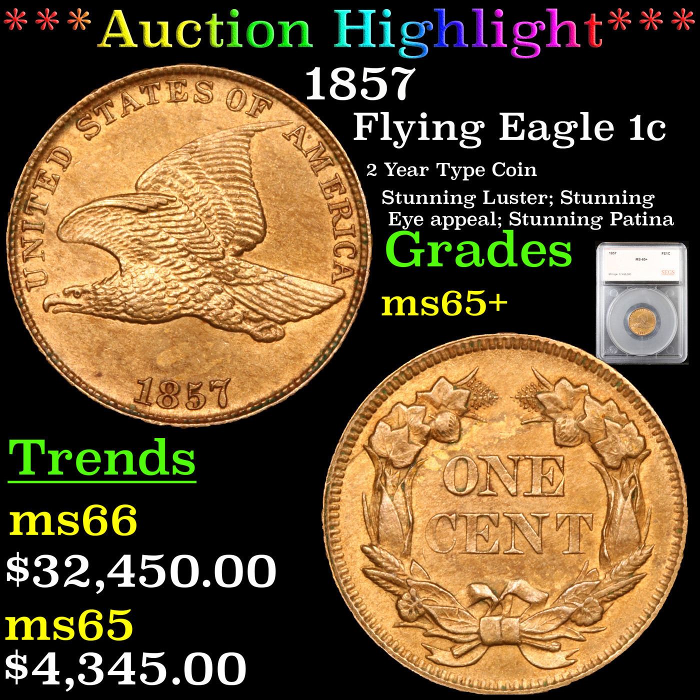 ***Auction Highlight*** 1857 Flying Eagle Cent 1c Graded ms65+ By SEGS. A Corey's Pick, Bid to Win, Don't let it get Away Coin