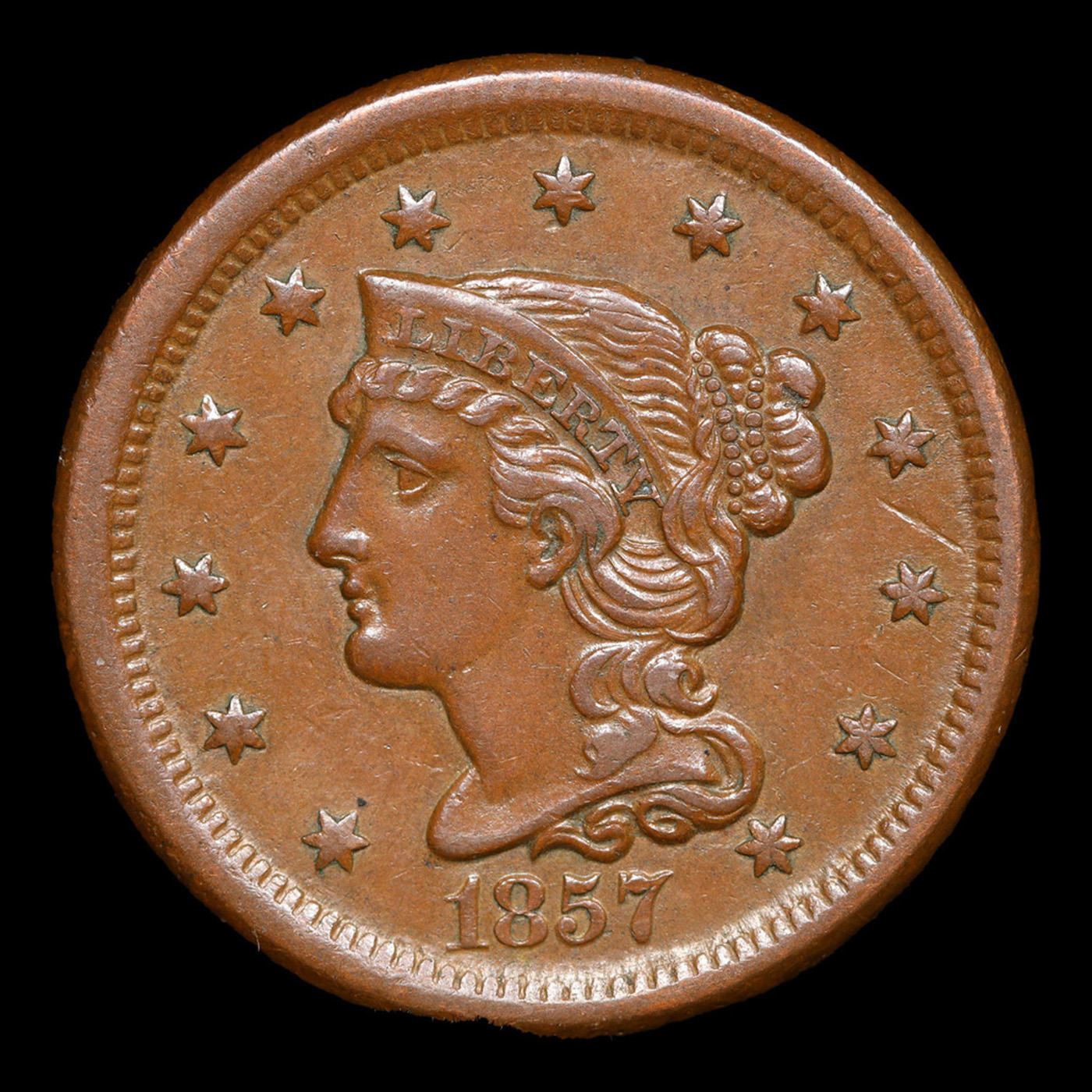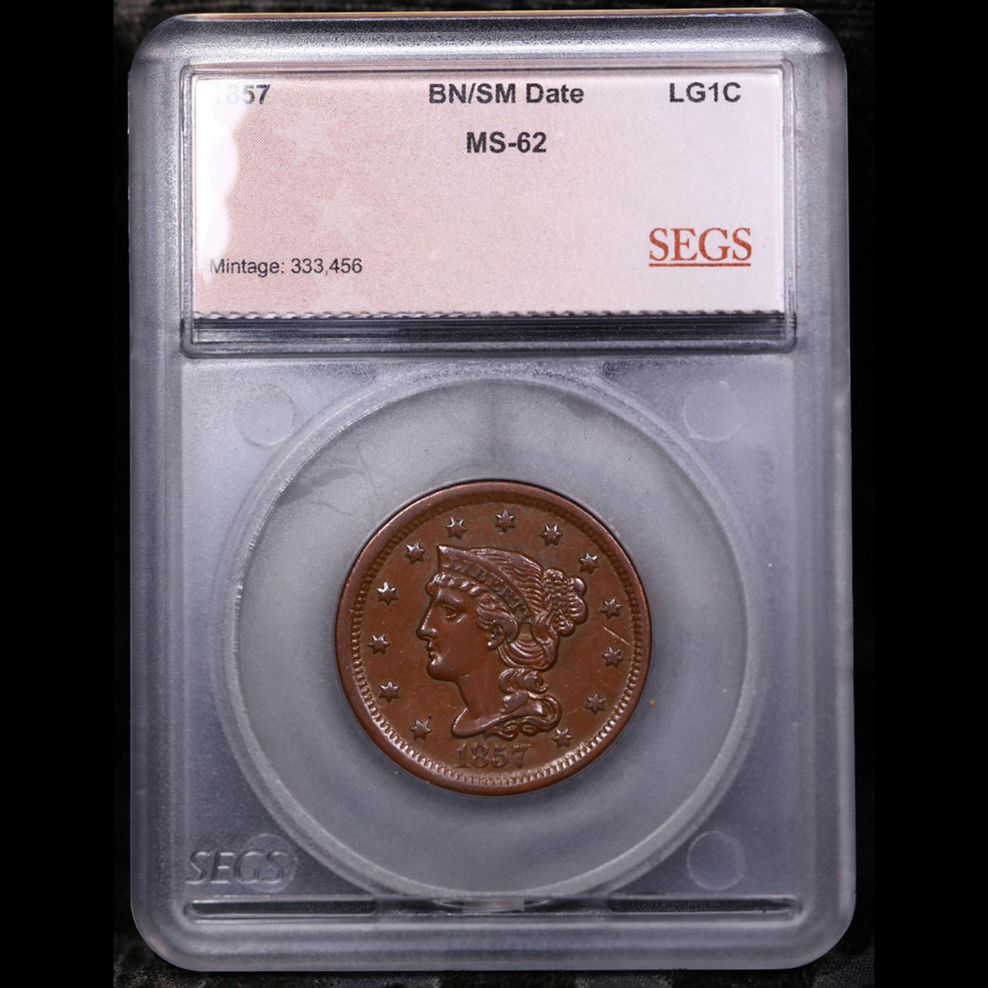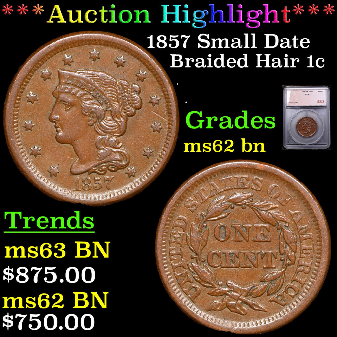 ***Auction Highlight*** 1857 Small Date Braided Hair Large Cent 1c Graded ms62 bn By SEGS. A Corey's Pick, Bid to Win Coin