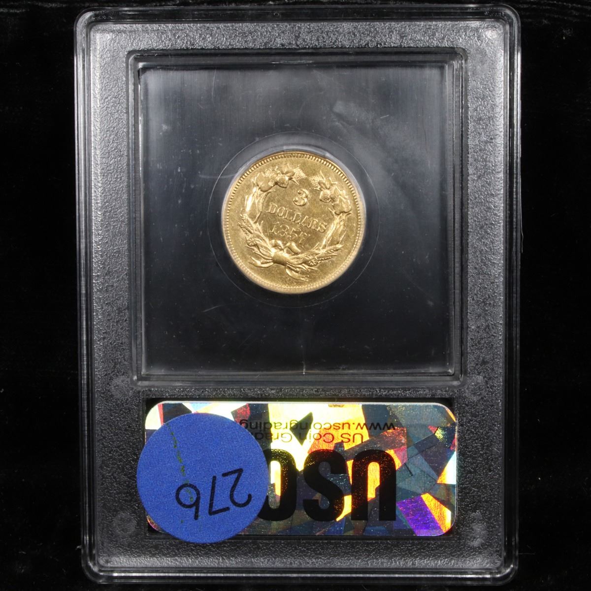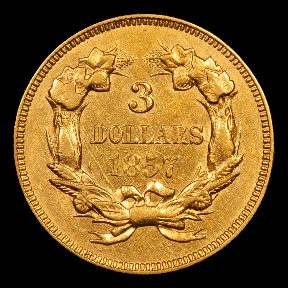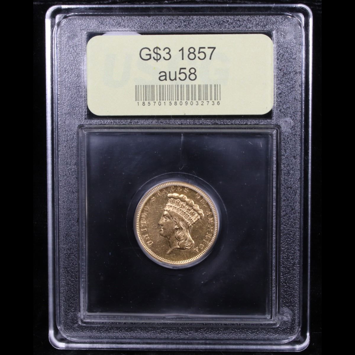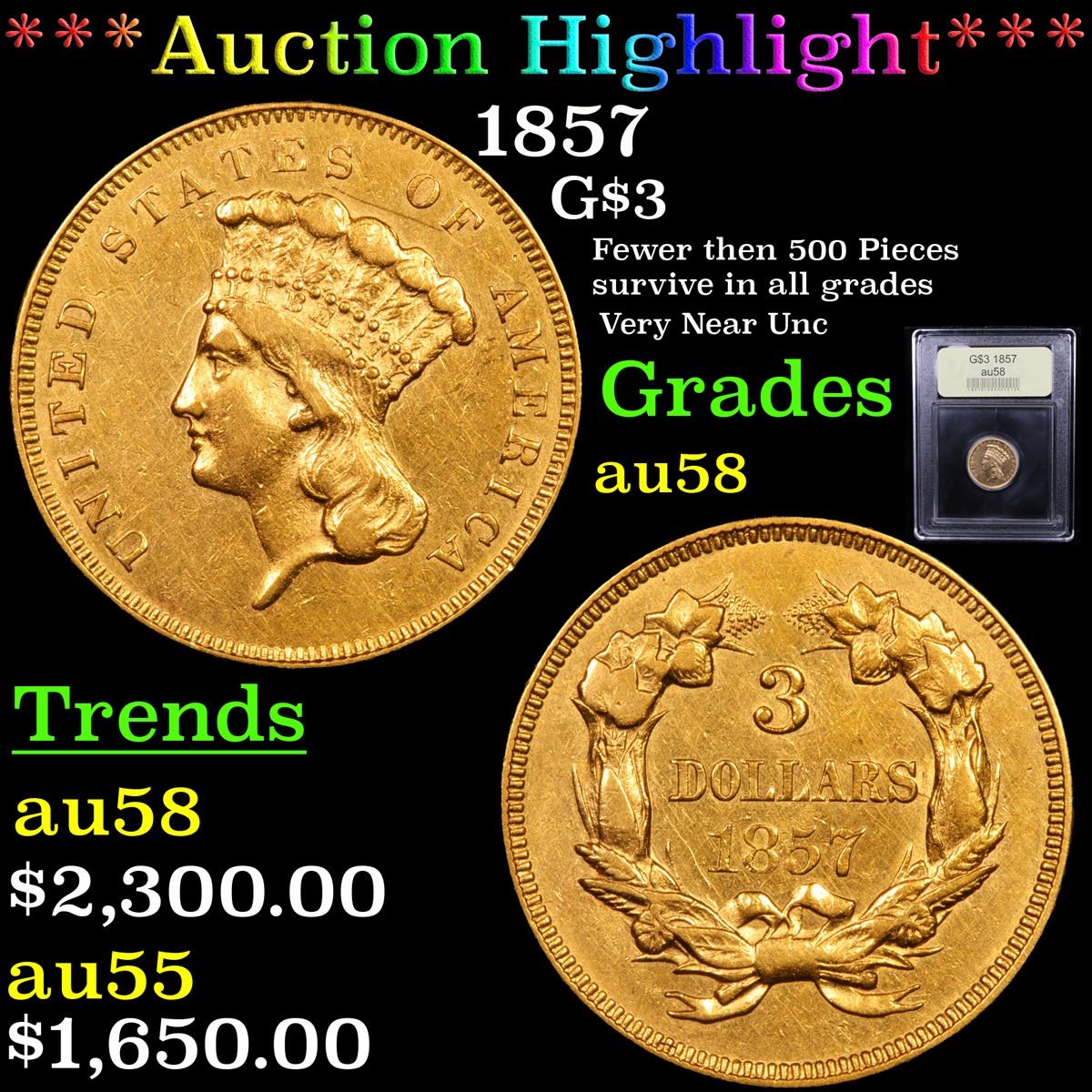 ***Auction Highlight*** 1857 Three Dollar Gold 3 Graded Choice AU/BU Slider By USCG. A sharply defined, overall satiny example with blended orange-gold and deep rose patina to both sides. The 1857 is among the scarcer early date Philadelphia Mint issues in the three-dollar gold series. Fewer than 500 coins are believed extant from a limited mintage of 20,891 pieces, the vast majority of which are in grades lower than that offered here A Corey's Pick, Bid to Win, Don't let it get Away Coin