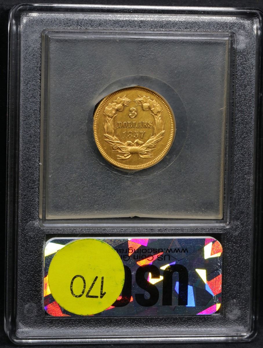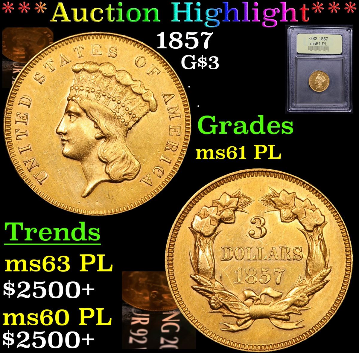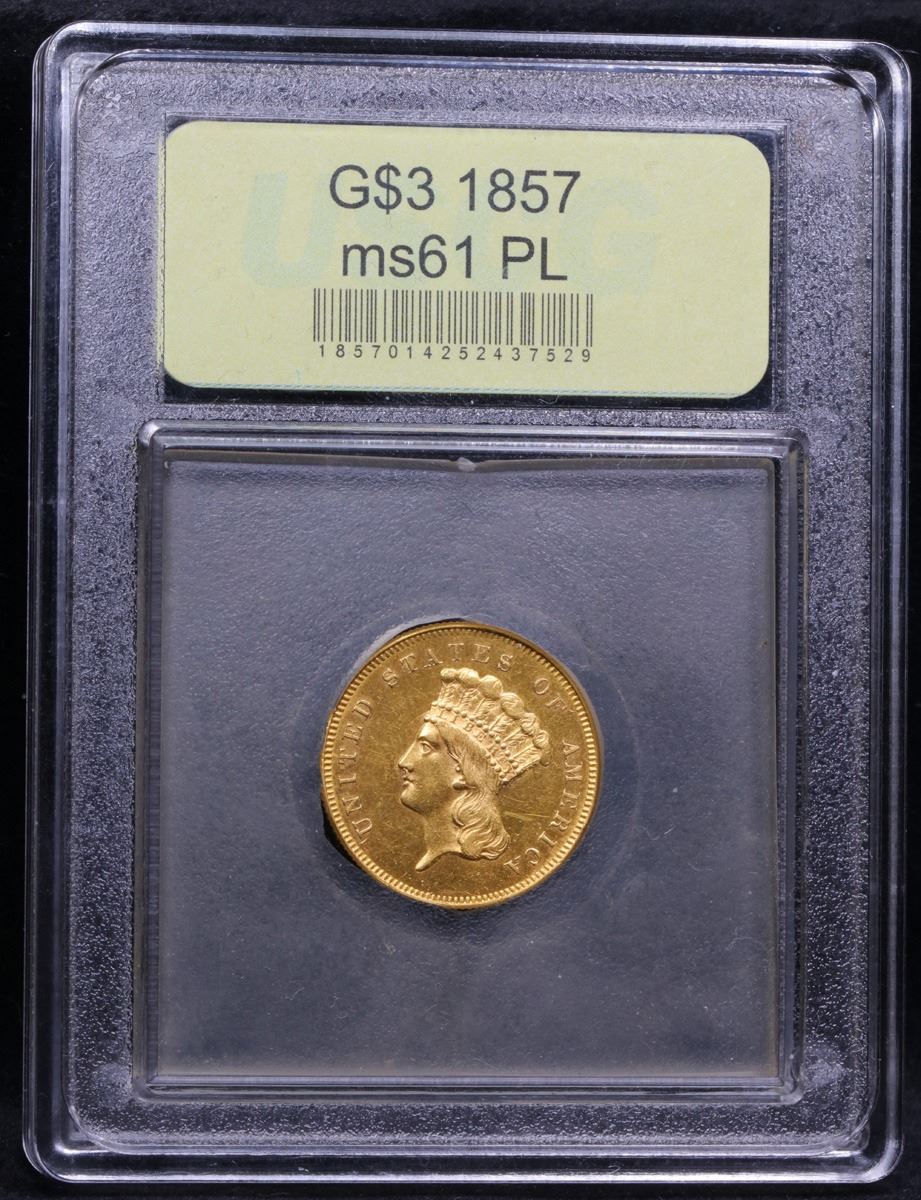 ***Auction Highlight*** 1857 . . Three Dollar Gold .$3 Graded Unc+ PL By USCG. A Corey's Pick, Bid to Win, Don't let it get Away Coin