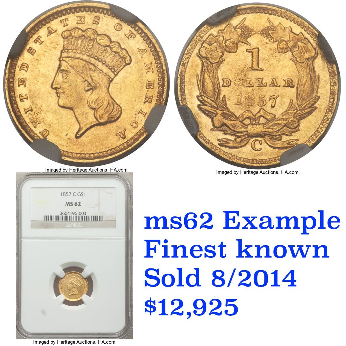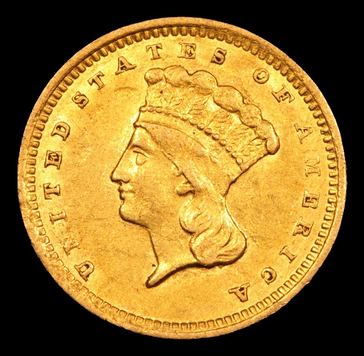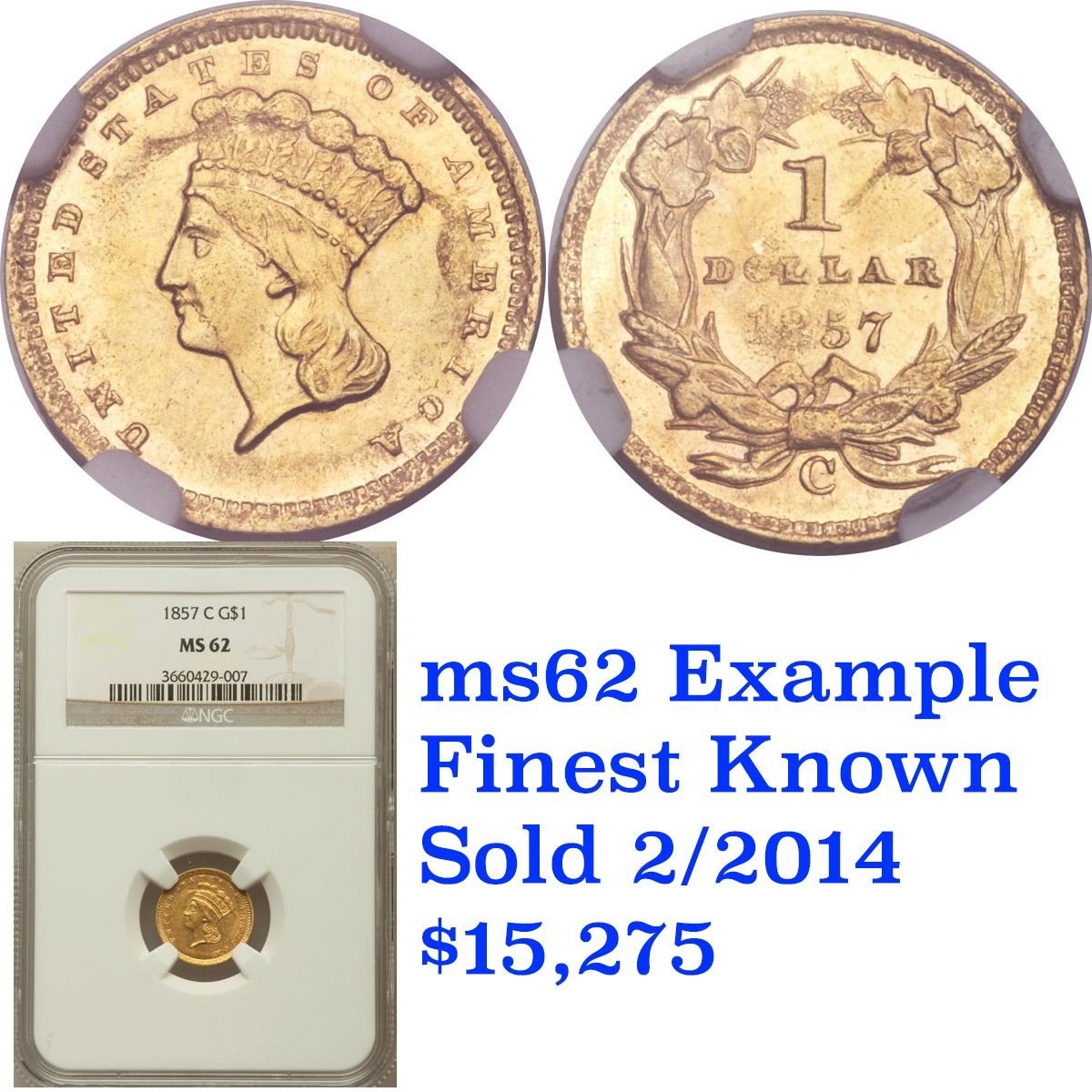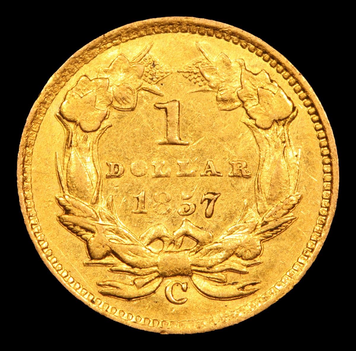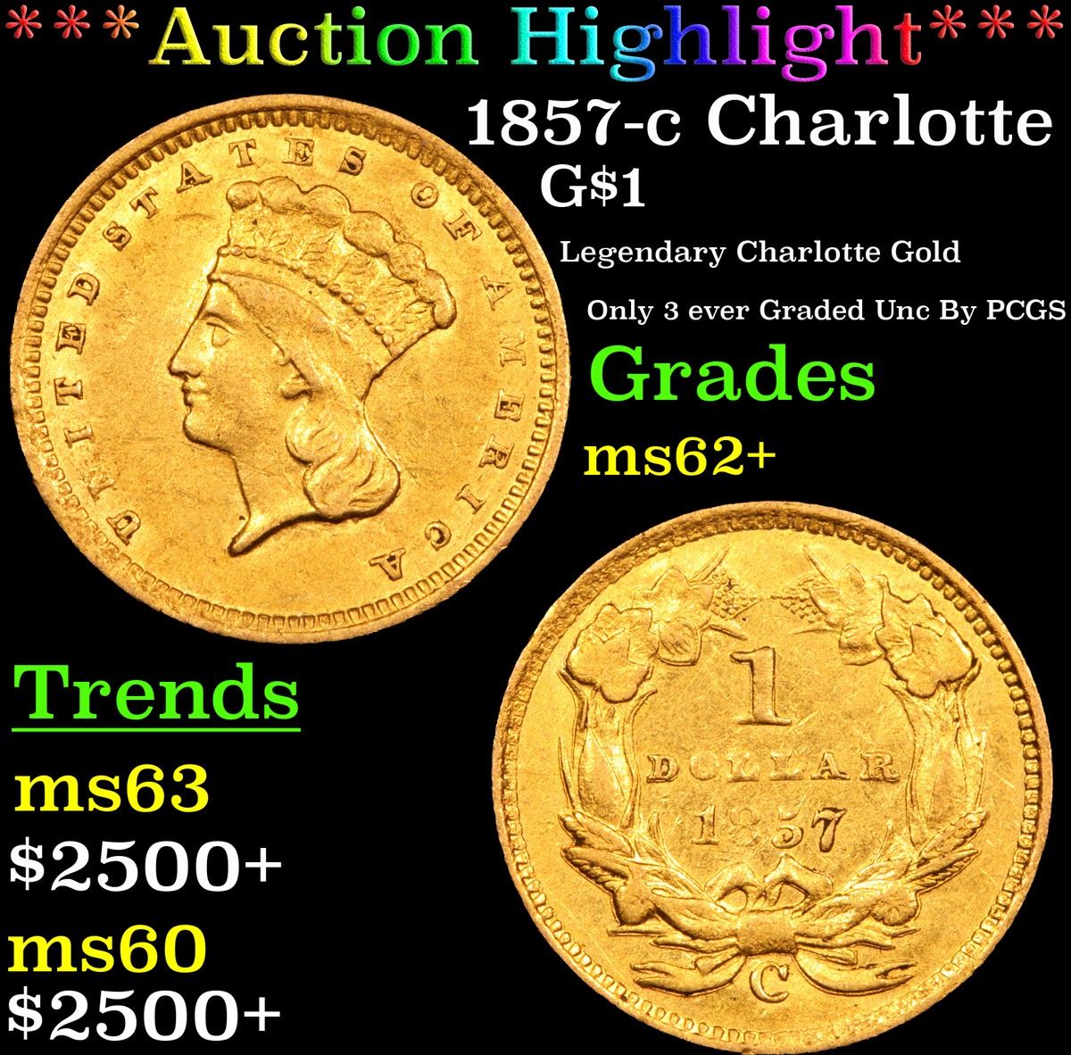 ***Auction Highlight*** 1857-c Charlotte Gold Dollar $1 Grades Select Unc. Up for auction is a Numismatic Rarity and a treasured find. An 1857 Charlotte $1 Gold Princess in Uncirculated Condition.. The 1857-c is generally not found in the best of conditions. To quote David Akers and Doug Winter of PCGS �The 1857-C is typically seen in Very Fine and Extremely Fine grades. It is a very scarce issue in properly graded About Uncirculated with most examples grading no better than AU50 to AU53. The 1857-C is rare in AU55 and very rare in properly graded AU58. In Mint State, It is among the rarest Charlotte gold dollars. I am aware of only two or three that I consider to be legitimately Mint State and none of these are especially choice.� and �STRIKE: The 1857-C gold dollar generally shows a very poor strike. The hair is quite weak with many areas showing no definition whatsoever. The plumes are very faint while the feathers are sharper than one might expect. The border shows weakness on the denticles but most are present. On the reverse, the wreath shows better detail at the top at the bottom. The bow knot tends to be particularly weak and this is often mistaken for wear. The date is usually weak on the 85 while the OL in DOLLAR is blurry. The denticles are less defined than on the obverse and they may show noticeable areas of die rust. I have never seen an example that I considered to be sharply struck. SURFACES: This issue is almost always found with severe mint-made planchet defects. The obverse fields have an irregular almost �wavy� look while the reverse is frequently very rough at the center. I have seen many 1857-C gold dollars with what appear to be �strips� of roughness around the head of Liberty. There are a few known with reasonably choice surfaces and these are very rare.� and finally �The planchets used for striking 1857-C gold dollars were downright atrocious, as was the quality of minting. Even the best available specimens look terrible, and are very difficult to grade. Once again, one must look at the quality of the surfaces and the mint luster rather than at the typical grading points that one would examine on say an 1857� The example at hand has nice luster and is typical for the grade. Per PCGS, only 3 examples are known in Unc, and only 175 survive in all grades. I wish you luck in obtaining this uncirculated 1857-c, and in becoming one of less than 5 people that own such. I have included pictures of two ms62 examples. I believe ours is superior, and is�.The Finest Known. Trends for this ultra rarity are ms62 $20,000, ms61 $15,0000, ms60 $11,0000 A Corey's Pick, Bid to Win, Don't let it get Away, you might not find its equal Coin