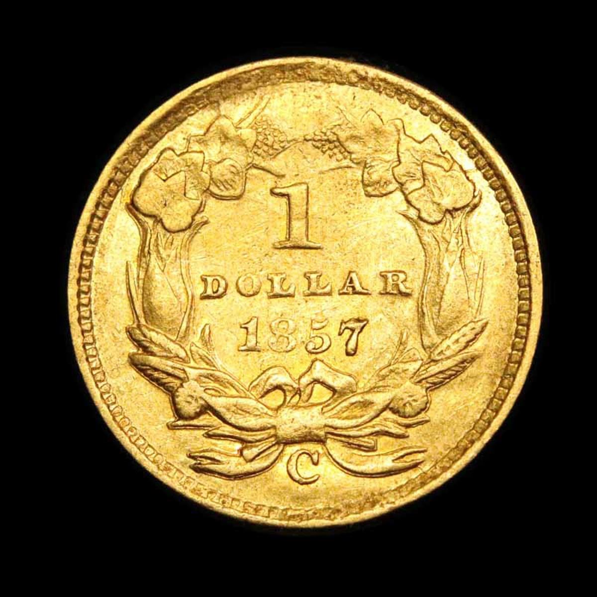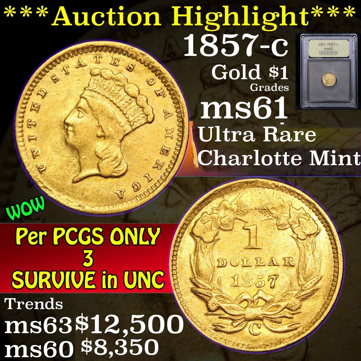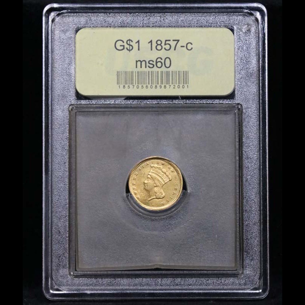***Auction Highlight*** 1857-c . . Gold Dollar $1 Graded BU By USCG. Incredibly Rare Charlotte Minted Gold! An Uncircualted example of a True Numismatic Rarity. Per David Akers of PCGS "The planchets used for striking 1857-C gold dollars were downright attrocious, as was the quality of minting. Even the best available specimens look terrible, and are very difficult to grade. Once again, one must look at the quality of the surfaces and the mint lustre rather than at the typical grading points that one would examine on say an 185 A Corey's Pick, Bid to Win, Don't let it get Away, you might not find its equal Coin. I give this coin my highest recommendation