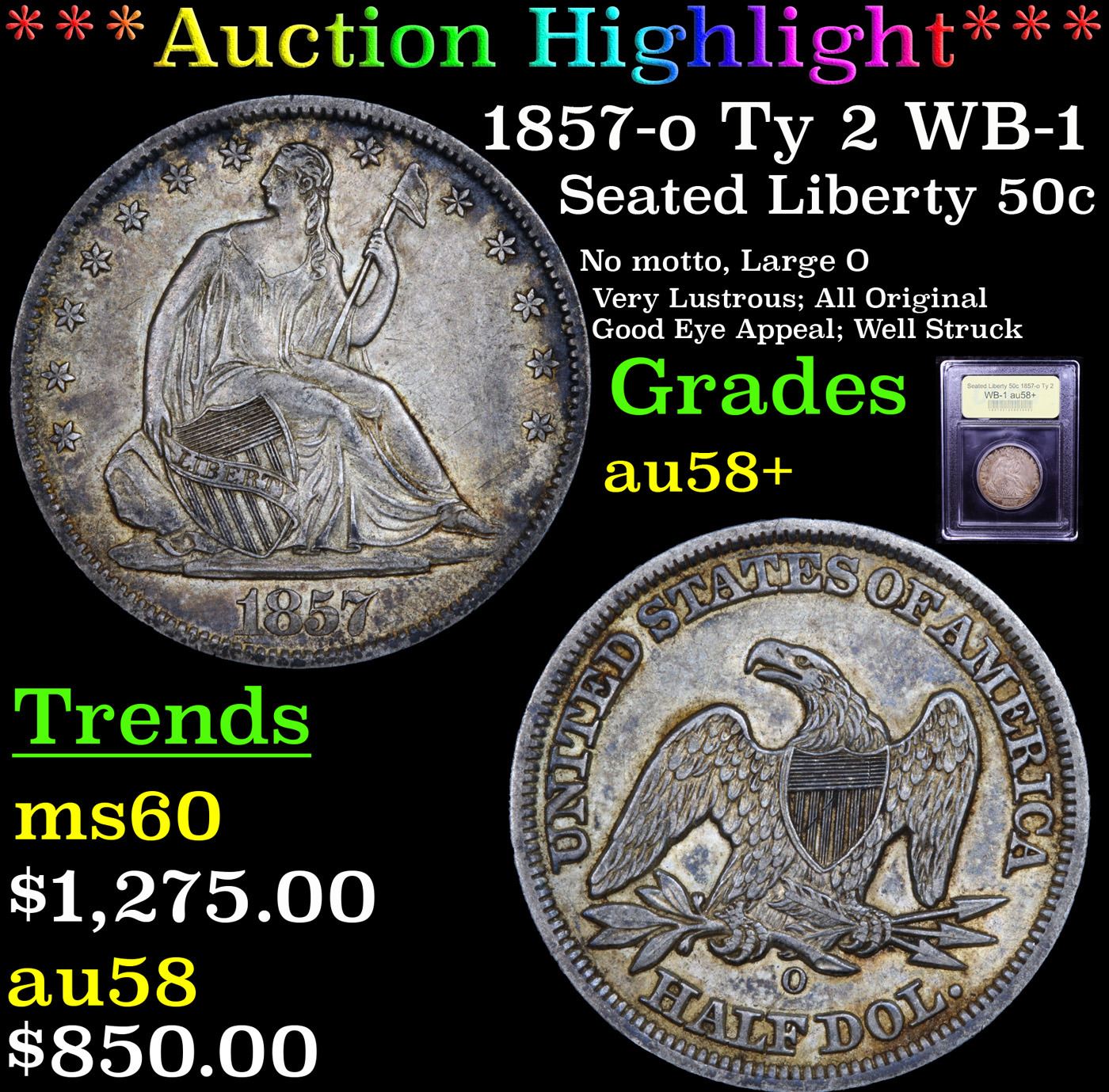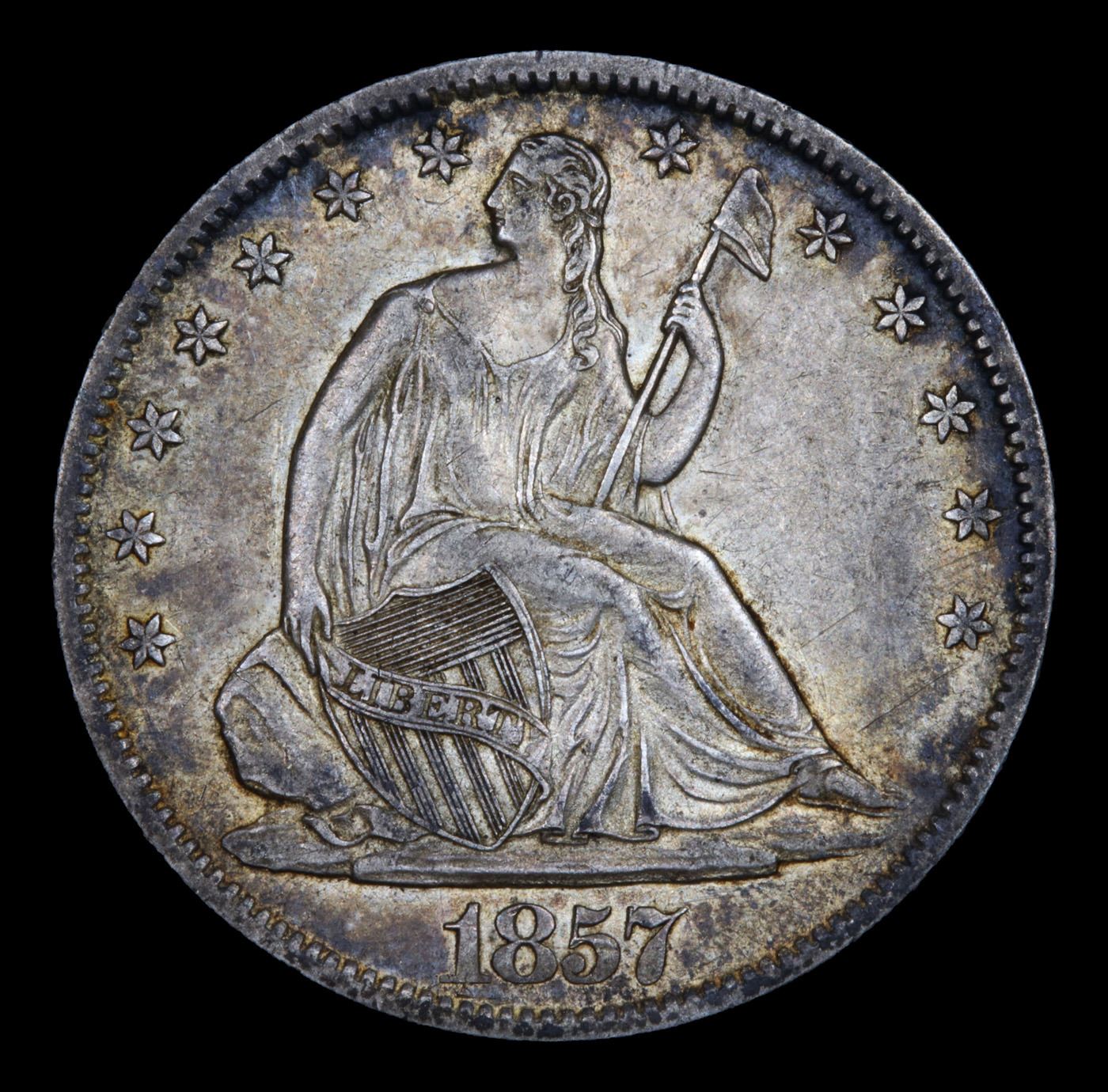 ***Auction Highlight*** 1857-o Ty 2 WB-1 Seated Half Dollar 50c Graded Choice AU/BU Slider+ BY USCG. A Corey's Pick, Bid to Win Coin