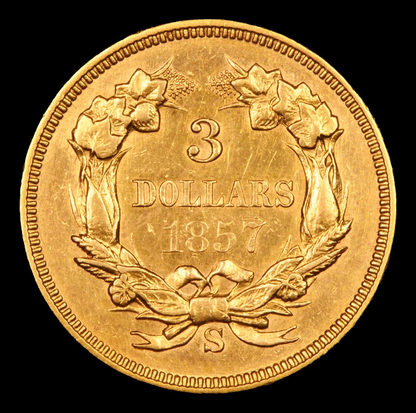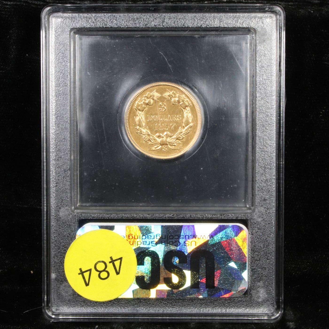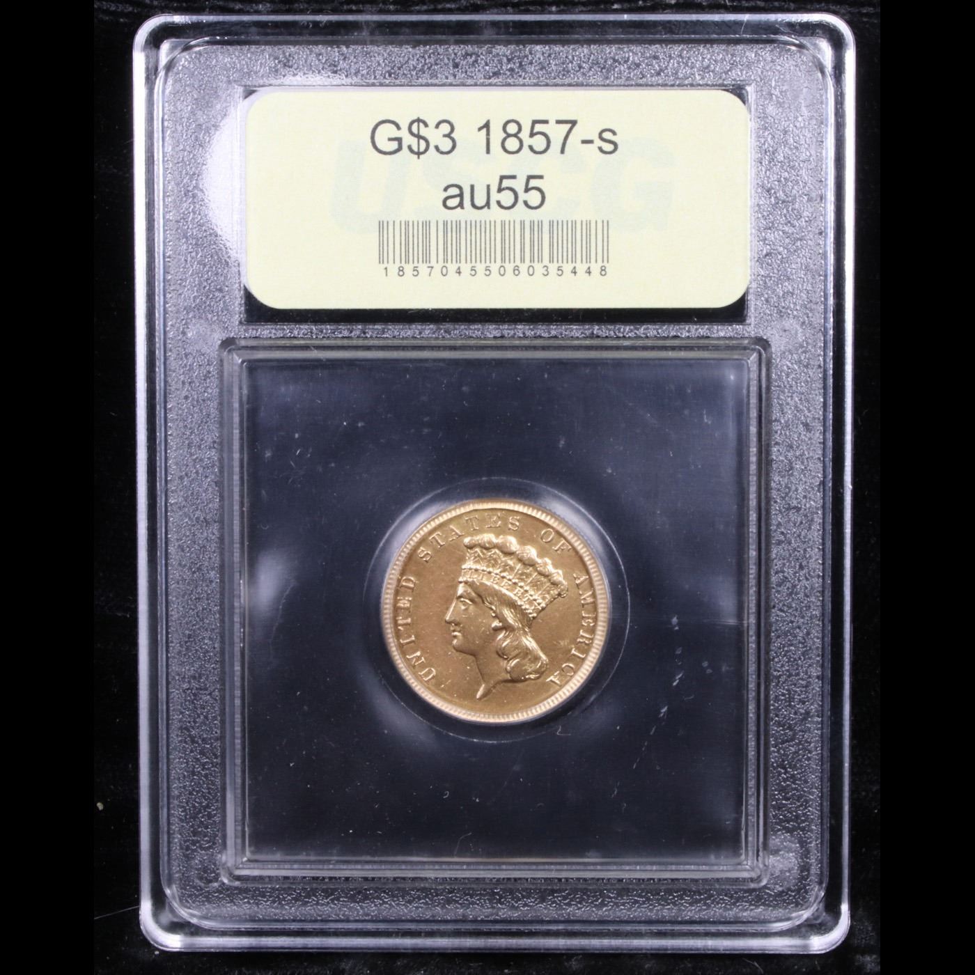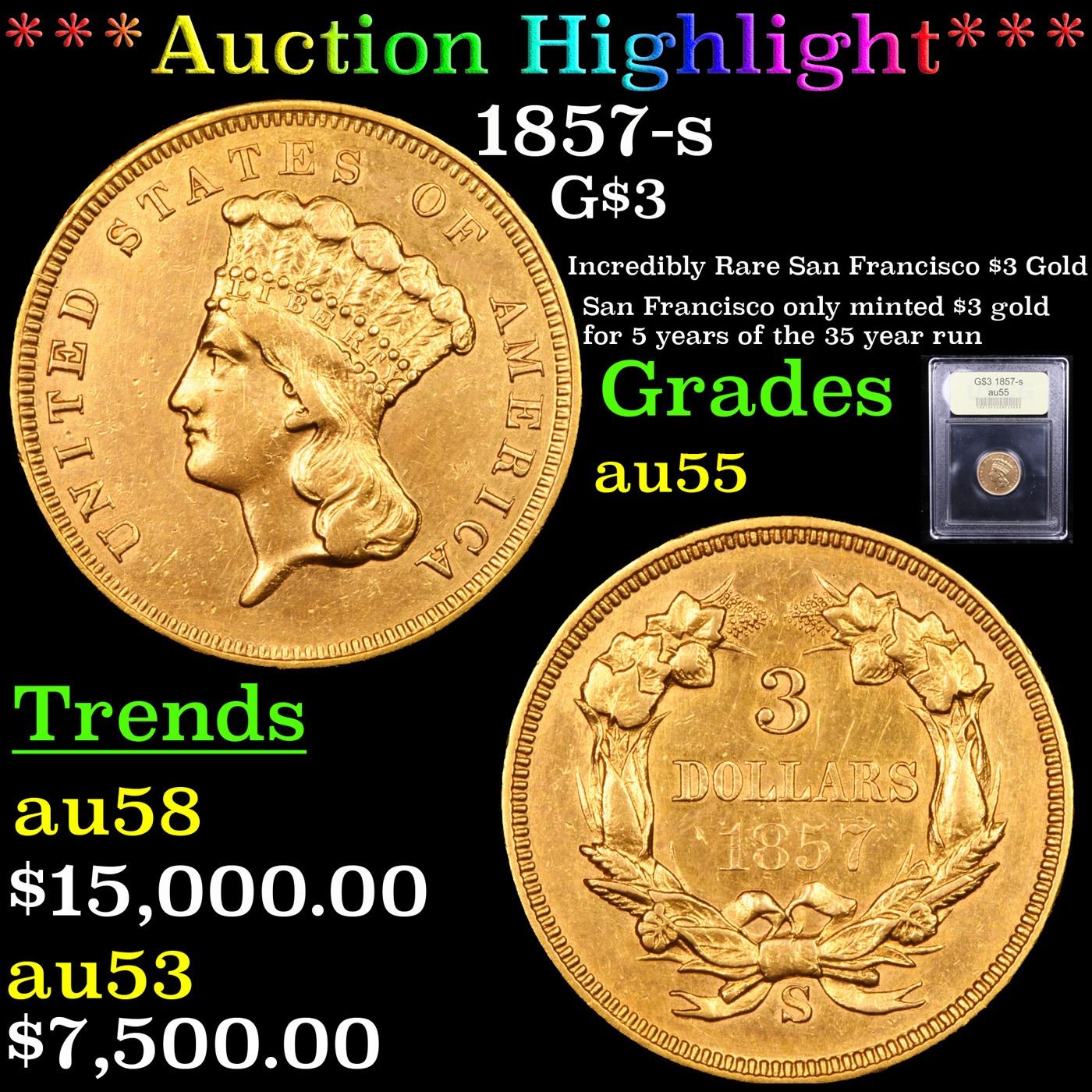 ***Auction Highlight*** 1857-s Three Dollar Gold 3 Graded Choice AU By USCG. Lovely and rare near-Mint quality for this elusive, conditionally challenging early San Francisco Mint issue. Pretty golden-orange patina on both sides. The strike is sharp throughout, although the date is weak as always seen; it was impressed lightly into the die from left to right with the 7 the heaviest of the numerals. Ample luster remains, the surfaces pleasingly smooth for the assigned grade with superior eye appeal that will please even the most discerning three-dollar gold enthusiast. Of the 14,250 struck, nearly every piece experienced some degree of circulation in the hustle-bustle California economy. Indeed, an estimated 160 to 225 survive, usually VF to EF, with AU examples such as this considered rare. It is estimated that fewer than a half dozen true Mint State examples of the 1857-S can be accounted for today, which fact further confirms the significance of this attractive AU-55.\ A Corey's Pick, Bid to Win, Don't let it get Away, you might not find its equal Coin. I give this coin my highest recommendation