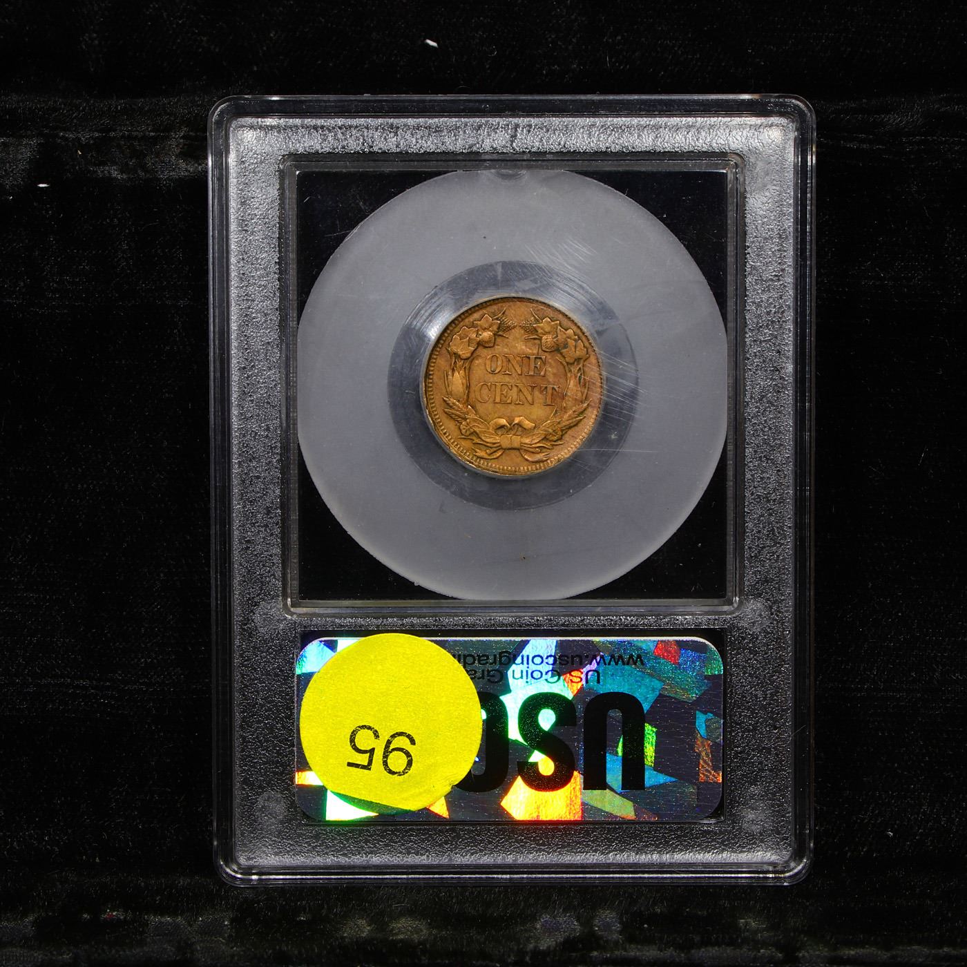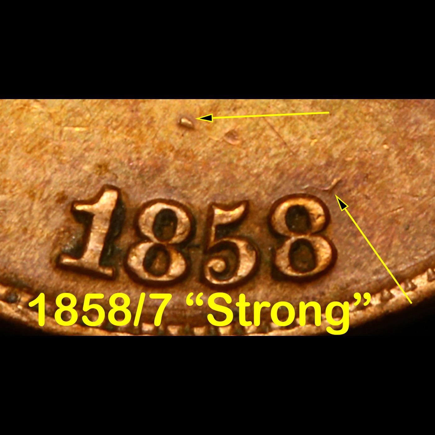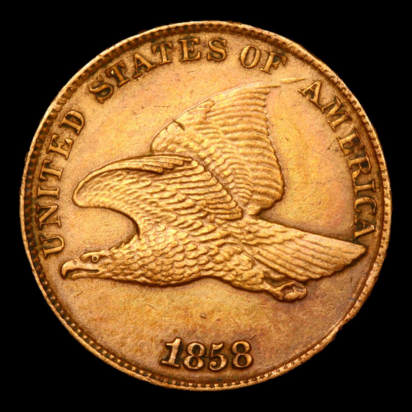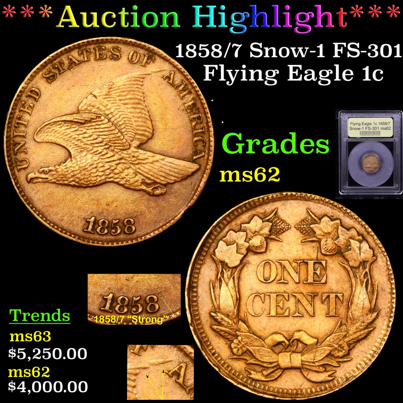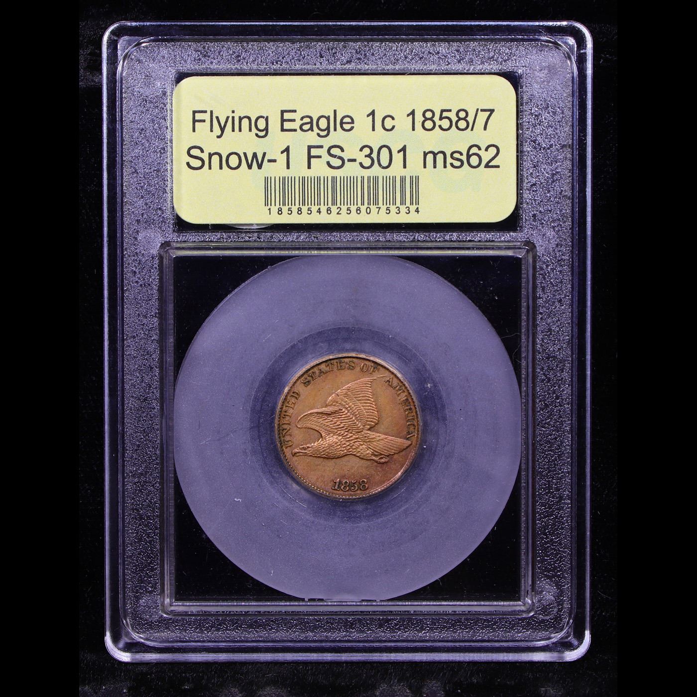 ***Auction Highlight*** 1858/7 Snow-1 FS-301 Flying Eagle Cent 1c Graded Select Unc By USCG. 1858/7 1C Large Letters. Snow-1, FS-301. The top of the 7 is clearly visible above the final 8 on this attractive Flying Eagle overdate. The broken wing tip and the die chip high above the first 8 are diagnostic for this variety. Central striking detail is sharp, and the in hand appearance is uncommonly smooth for the assigned grade. We do note the typical (for the variety) softness of detail at the end of the eagle's tail and throughout the right half of the wreath. All known 1858/7 cents are weakly defined in these areas due to having been struck from skewed dies. The most significant variety in the brief Flying Eagle series of 1856 to 1858, the 1858/7 Snow-1 has its own listing in the popular Guide Book and is often collected as an integral part of a complete set of this small cent type. Snow Die Stage A, offered here, is the most desirable of the three known die states since it retains the most prominent remnants of the 7 under digit. Indeed, a loupe reveals a nearly complete upper right corner of the 7 under digit above and to the right of the second digit 8 in the date. An additional diagnostic of this variety is what appears to be a small die chip in the field above the space between the digits 85 in the date. Some numismatic scholars believe that this die chip is the remnant of the base of an errant 1. If so, the 1858/7 Snow-1 variety could be classified not only as an overdate, but also as a misplaced date. This variety is elusive in all Mint State grades, the present bidding opportunity worthy of serious consideration.