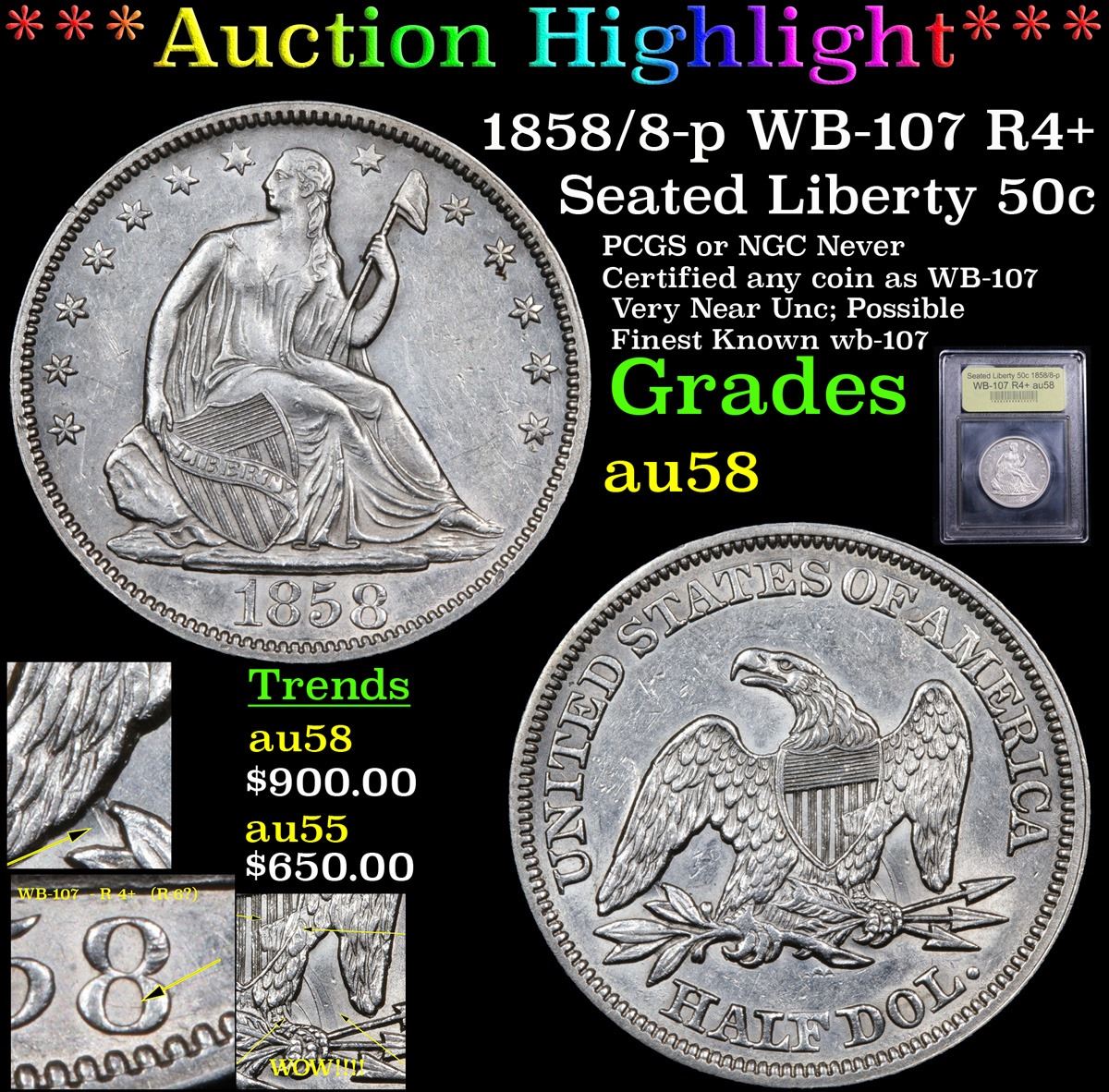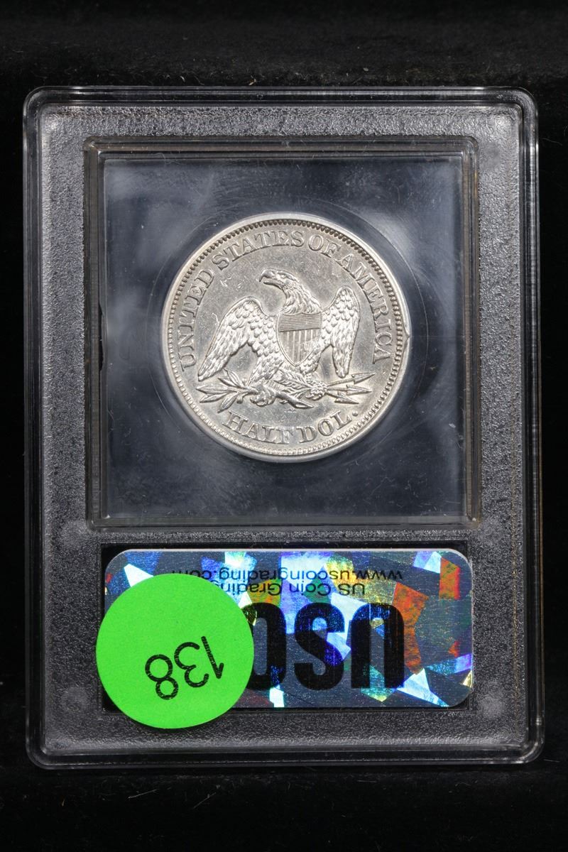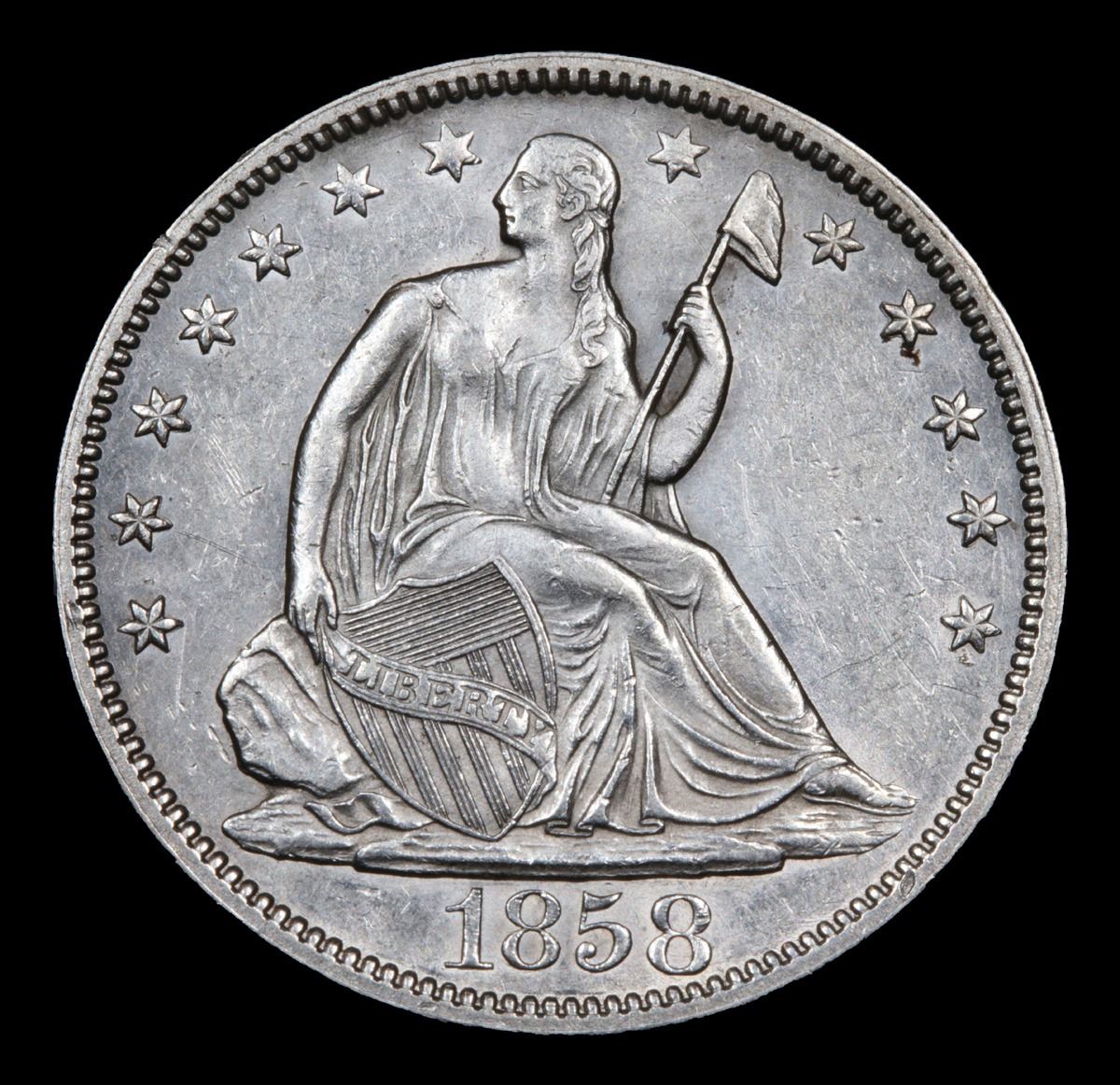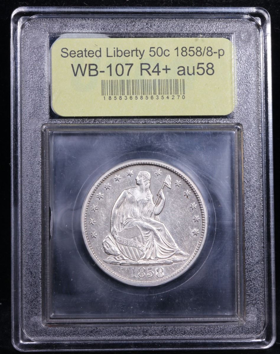 ***Auction Highlight*** 1858/8-p WB-107 R4+ Seated Half Dollar 50c Graded Choice AU/BU Slider By USCG.