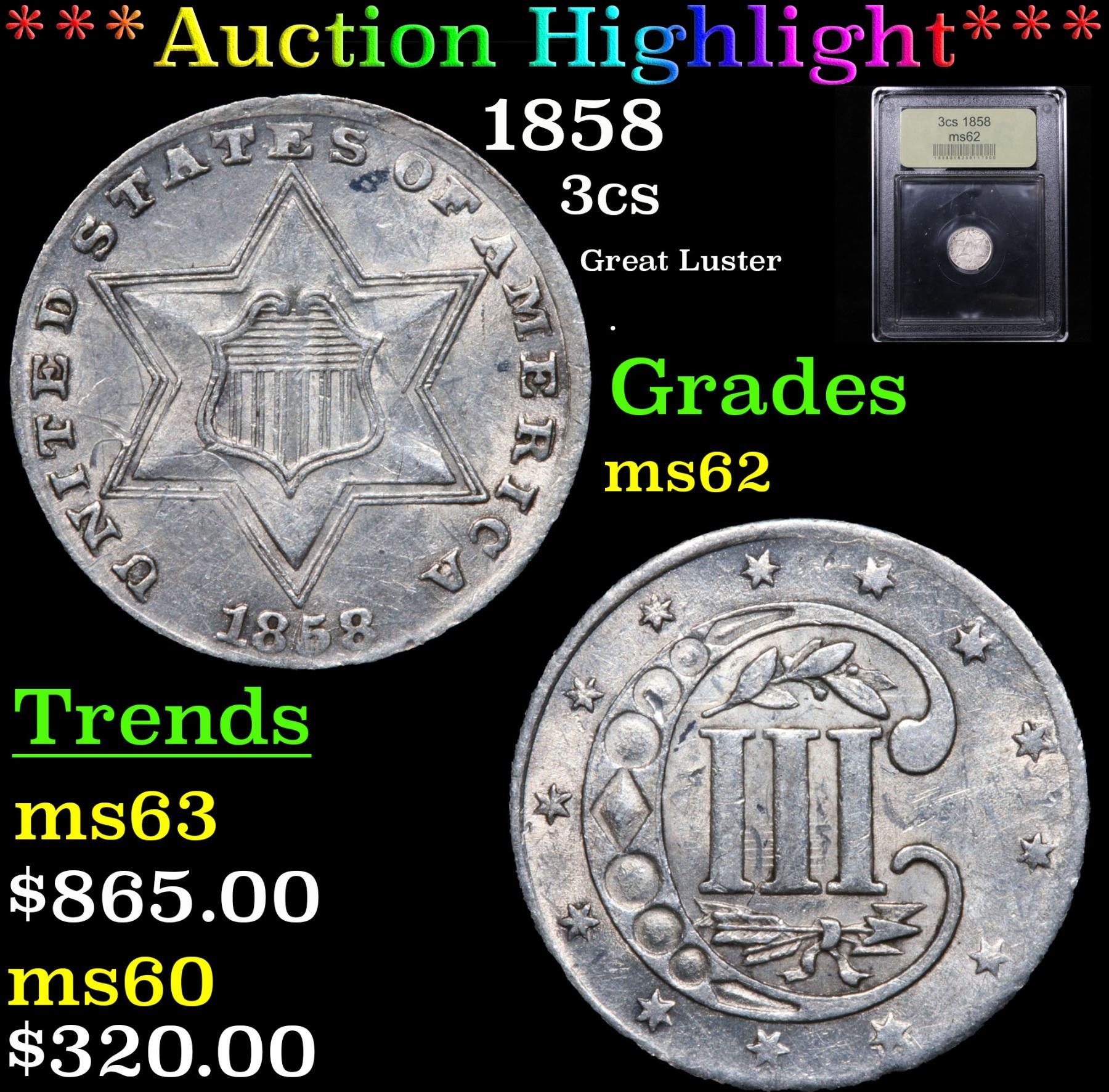 ***Auction Highlight*** 1858 Great Luster . Three Cent Silver 3cs Graded Select Unc By USCG. A Corey's Pick, Bid to Win Coin