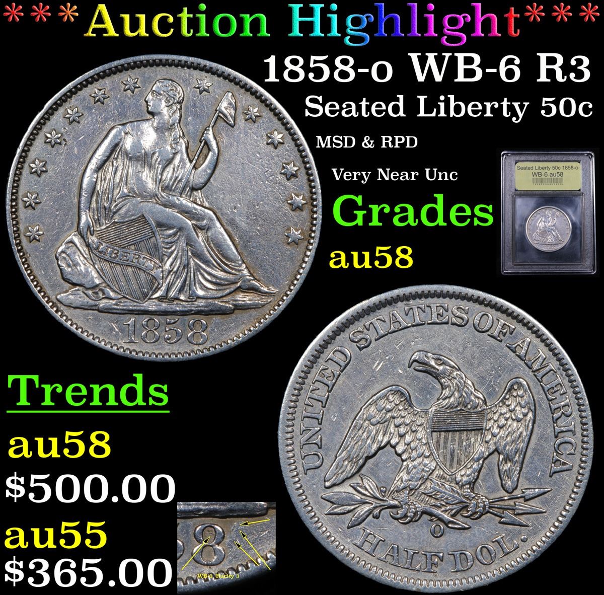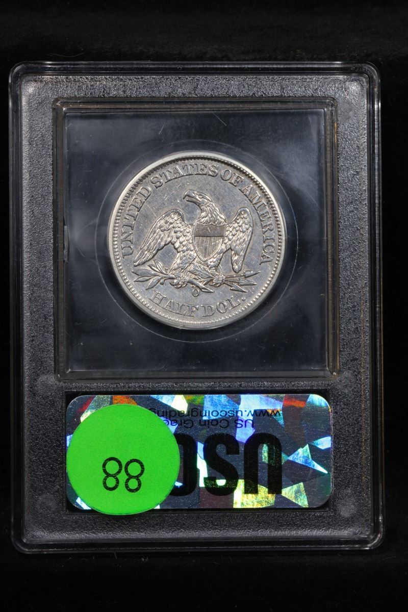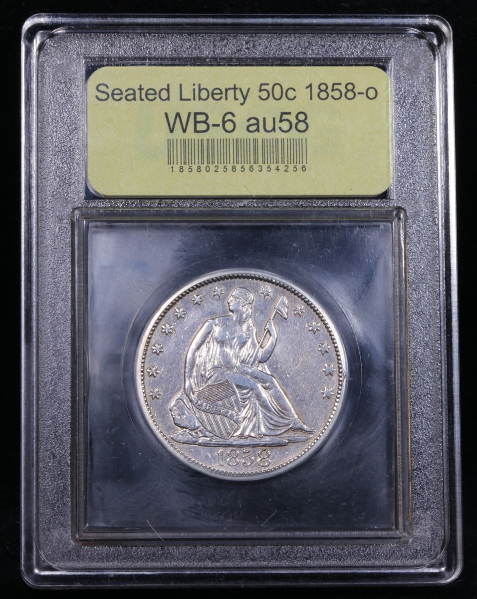 ***Auction Highlight*** 1858-o WB-6 R3 Seated Half Dollar 50c Graded Choice AU/BU Slider By USCG. Very cool coin. It is the WB-6, A MPD & RPD Rarity 3. The second 8 was punched no less than four times into this die; in the rock support, in the field, and in in the upper loop of the 8