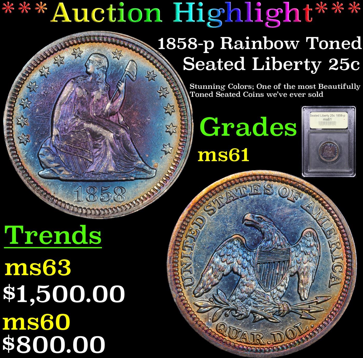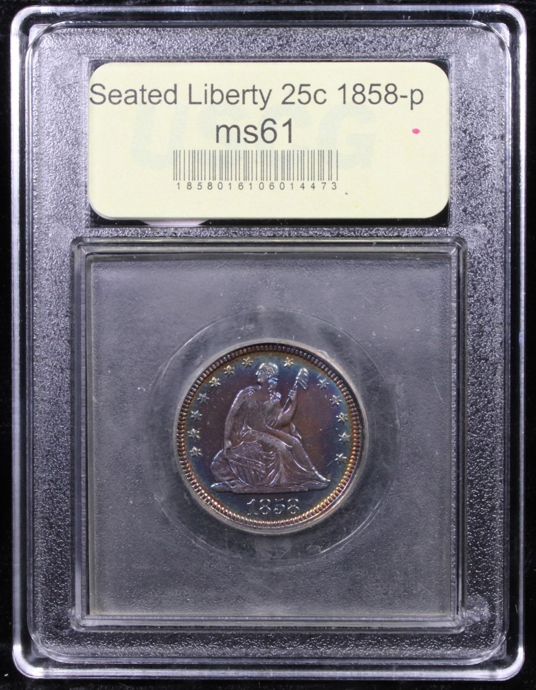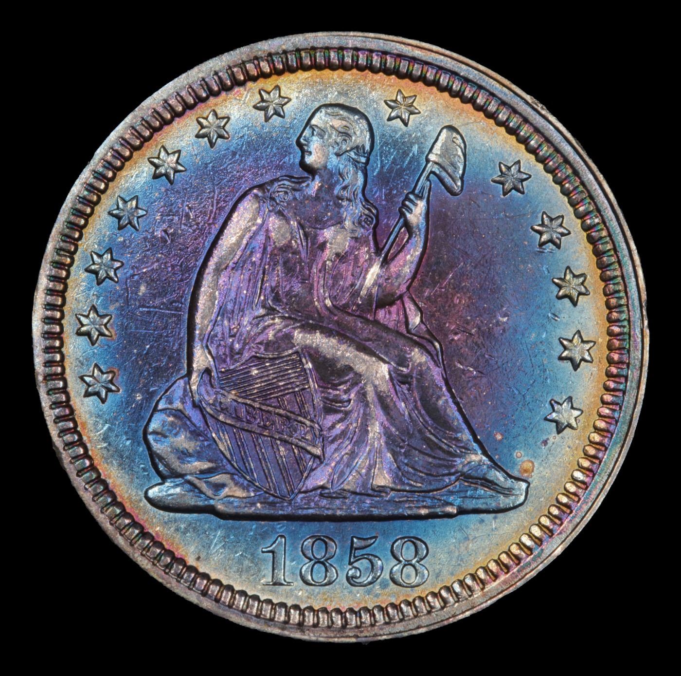 ***Auction Highlight*** 1858-p Rainbow Toned Seated Liberty Quarter 25c Graded BU+ By USCG (fc)
