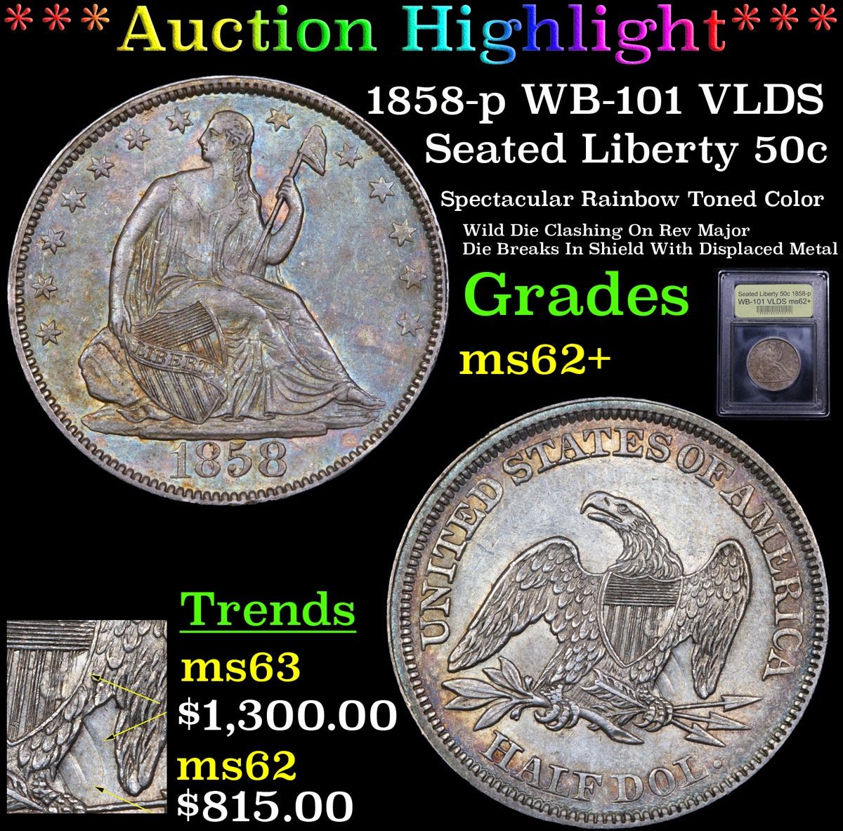 ***Auction Highlight*** 1858-p WB-101 VLDS Seated Half Dollar 50c Graded Select Unc By USCG (fc)