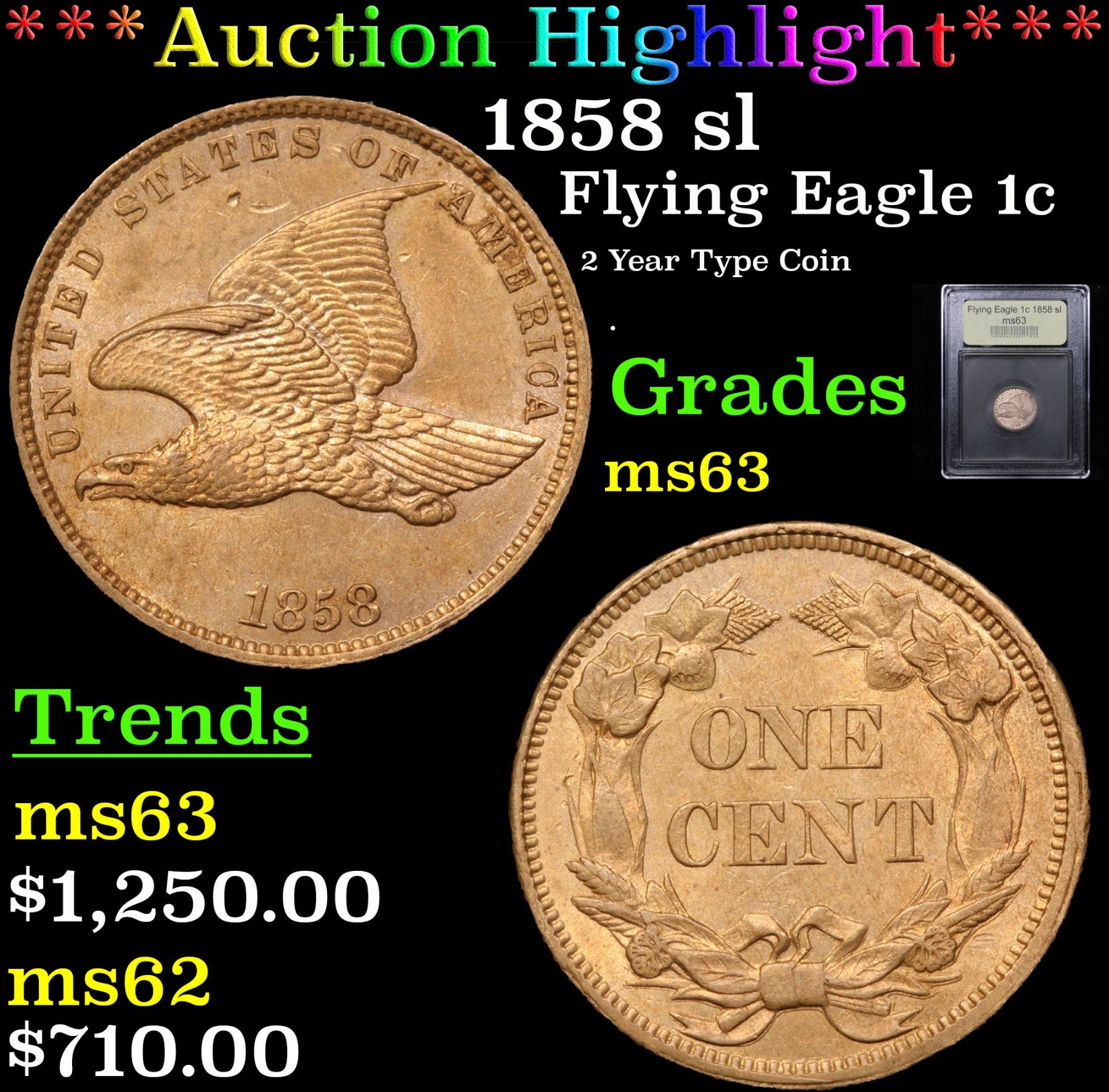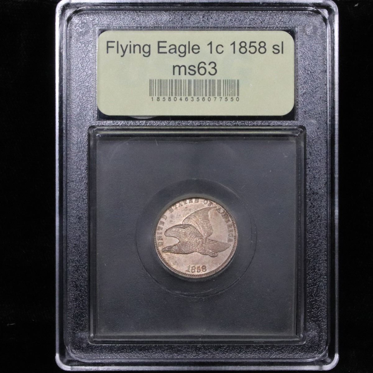 ***Auction Highlight*** 1858 sl 2 Year Type Coin . Flying Eagle Cent 1c Graded Select Unc By USCG. The picture does not do justice to the super Flying Eagle. The surfaces are very reflective, and lustrous. I had thought it might be a proof, but it turns out to be a super Semi Proof Like example. A Corey's Pick, Bid to Win, Don't let it get Away Coin