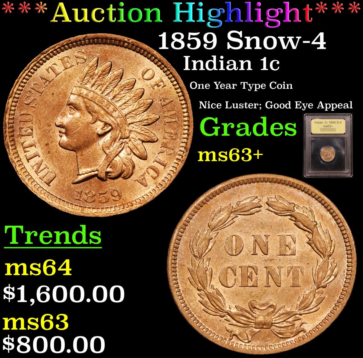 ***Auction Highlight*** 1859 Snow-4 Indian Cent 1c Graded Select+ Unc By USCG. A Corey's Pick, Bid to Win, Don't let it get Away Coin
