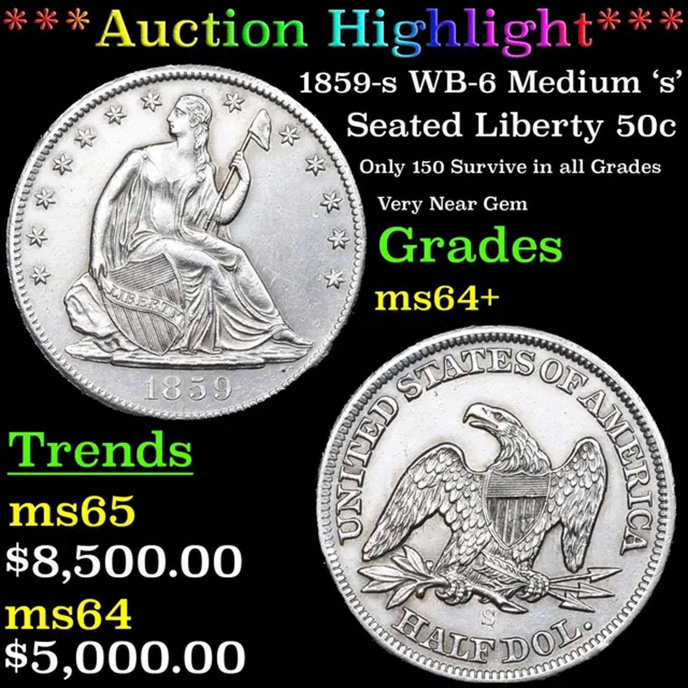 ***Auction Highlight*** 1859-s WB-6 Medium 's' Seated Half Dollar 50c Grades Choice+ Unc. A Key Date's Pick, Bid to Win, Don't let it get Away, you might not find its equal Coin