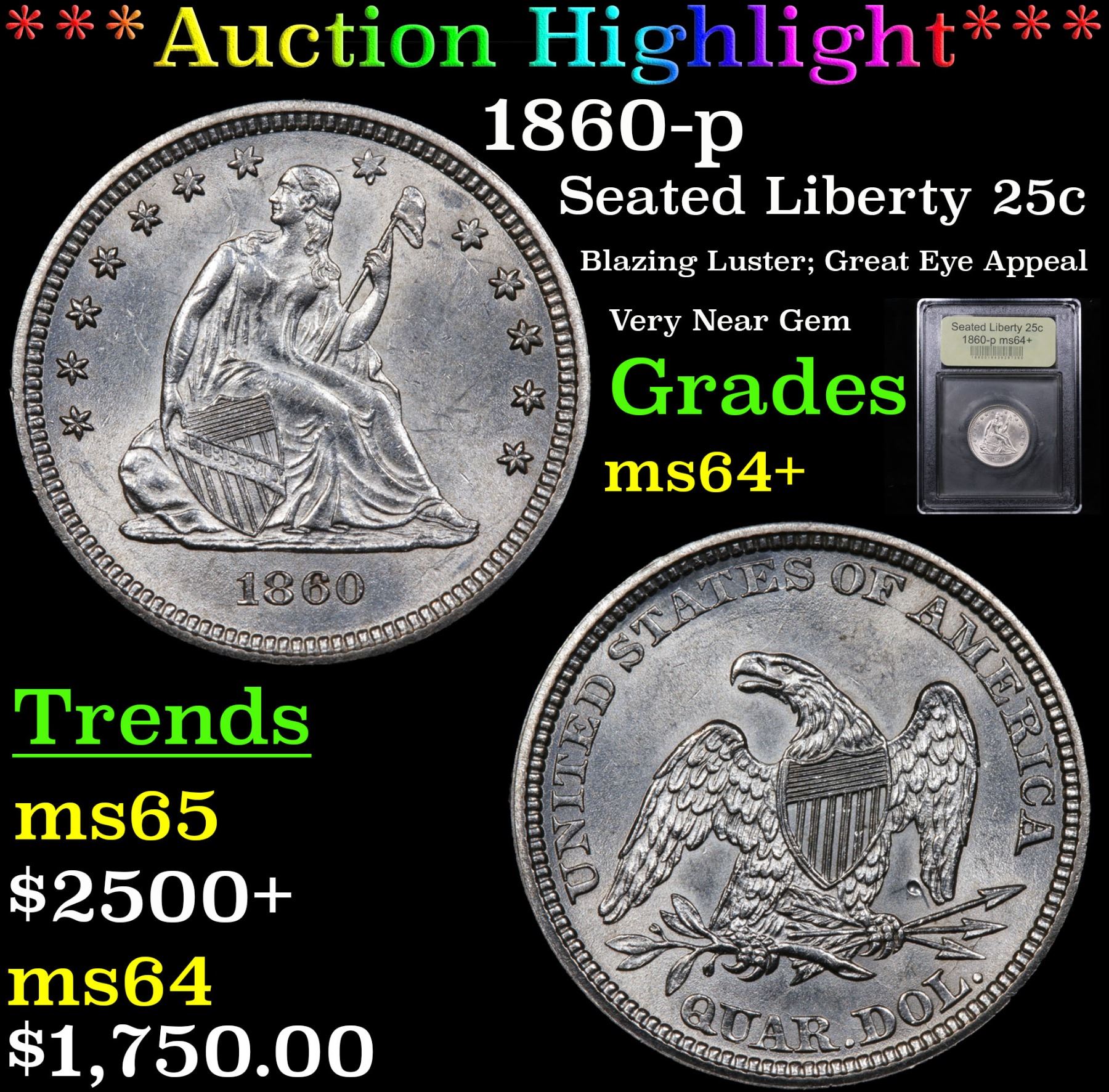 ***Auction Highlight*** 1860-p Blazing Luster; Great Eye Appeal Very Near Gem Seated Liberty Quarter 25c Graded Choice+ Unc By USCG. A Corey's Pick, Bid to Win, Don't let it get Away Coin