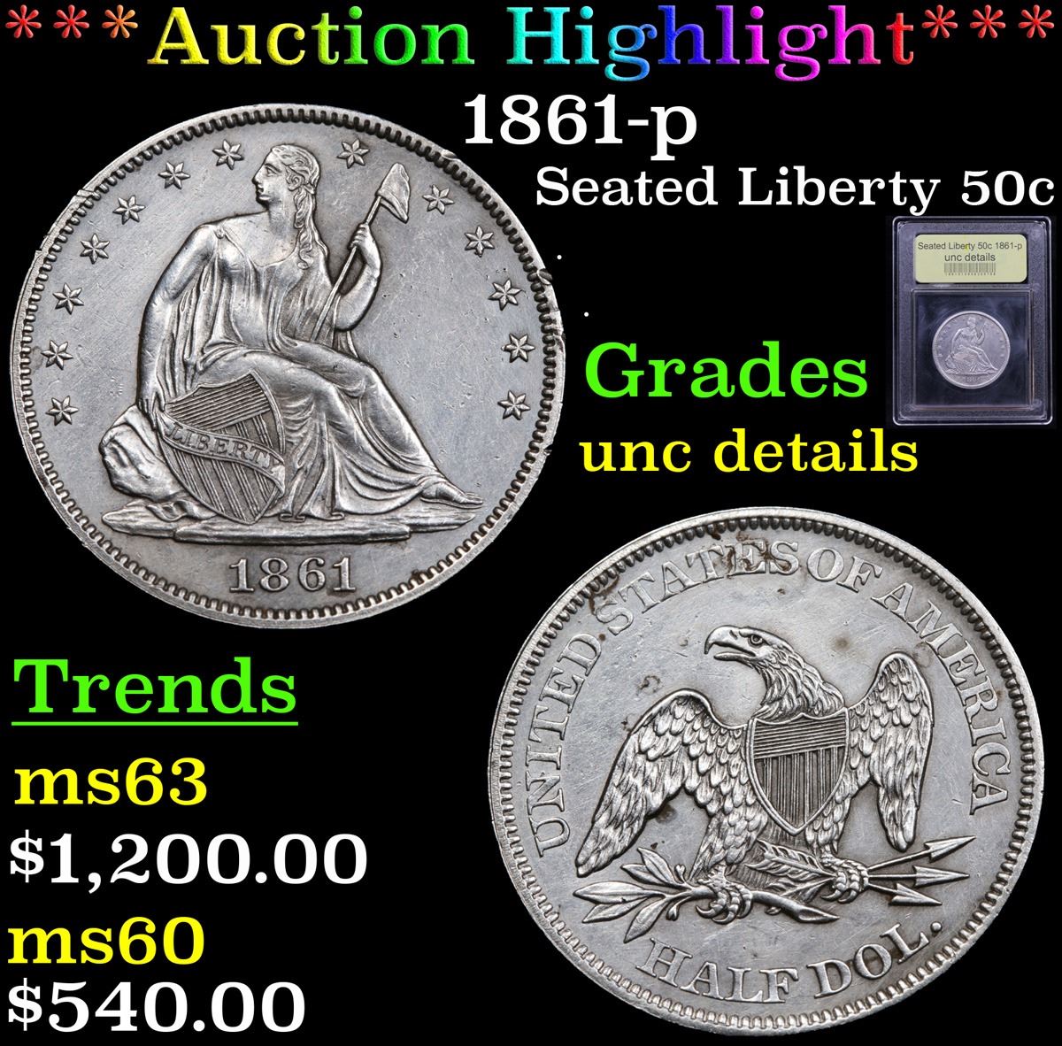 ***Auction Highlight*** 1861-p Seated Half Dollar 50c Graded Unc Details By USCG.