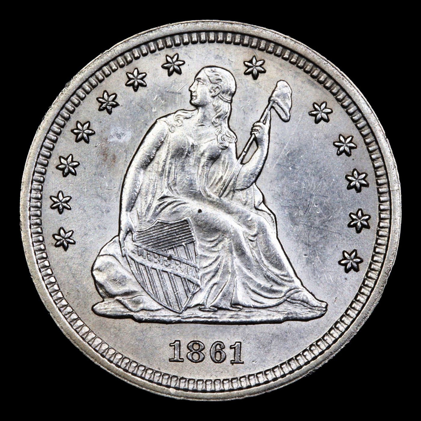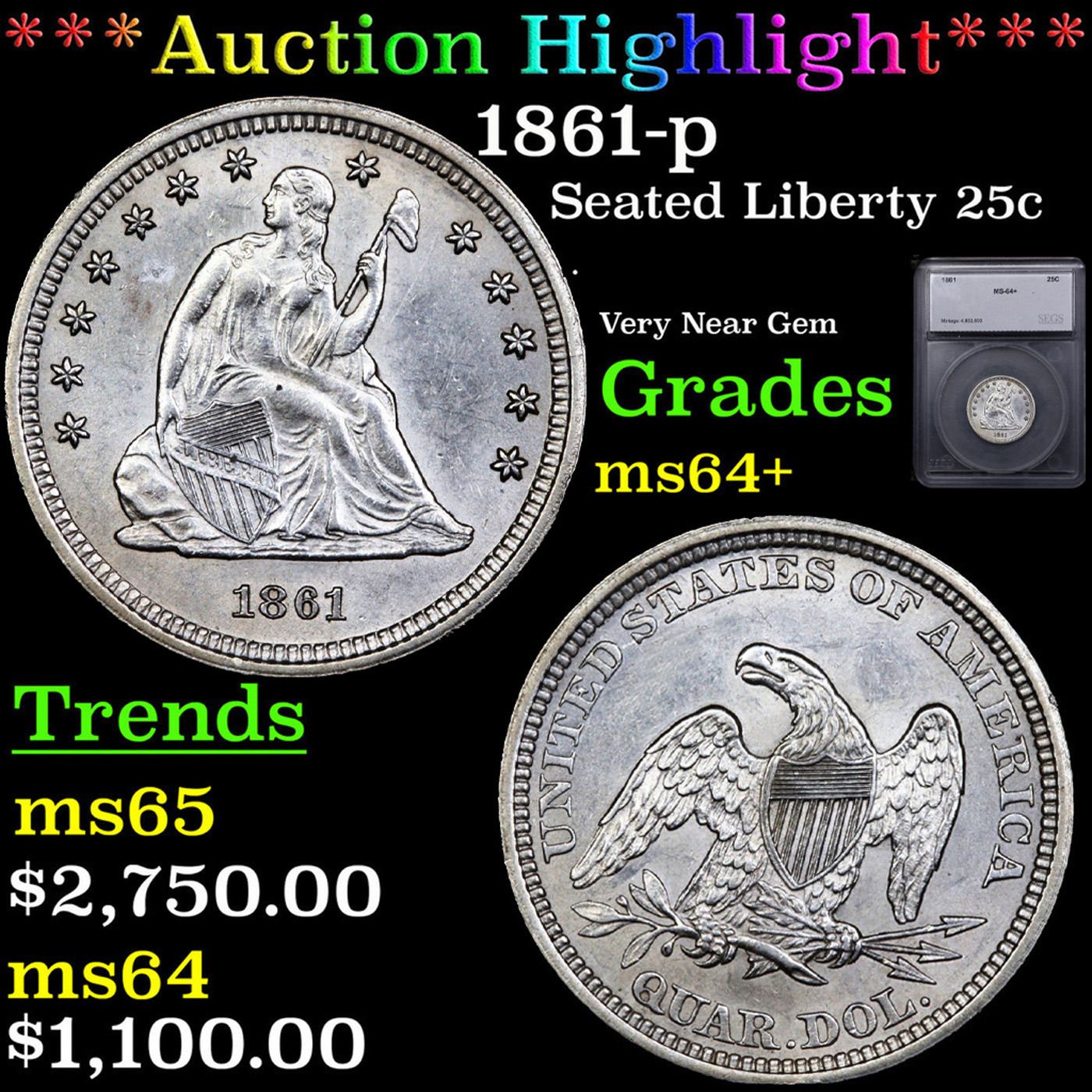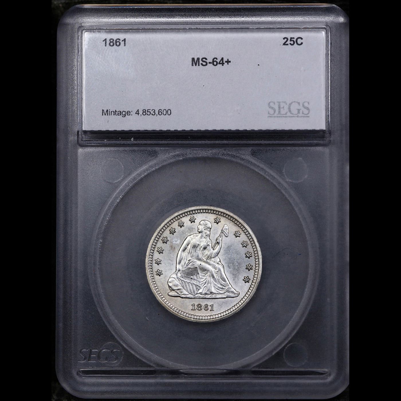 ***Auction Highlight*** 1861-p Seated Liberty Quarter 25c Graded ms64+ BY SEGS. A Corey's Pick, Bid to Win Coin
