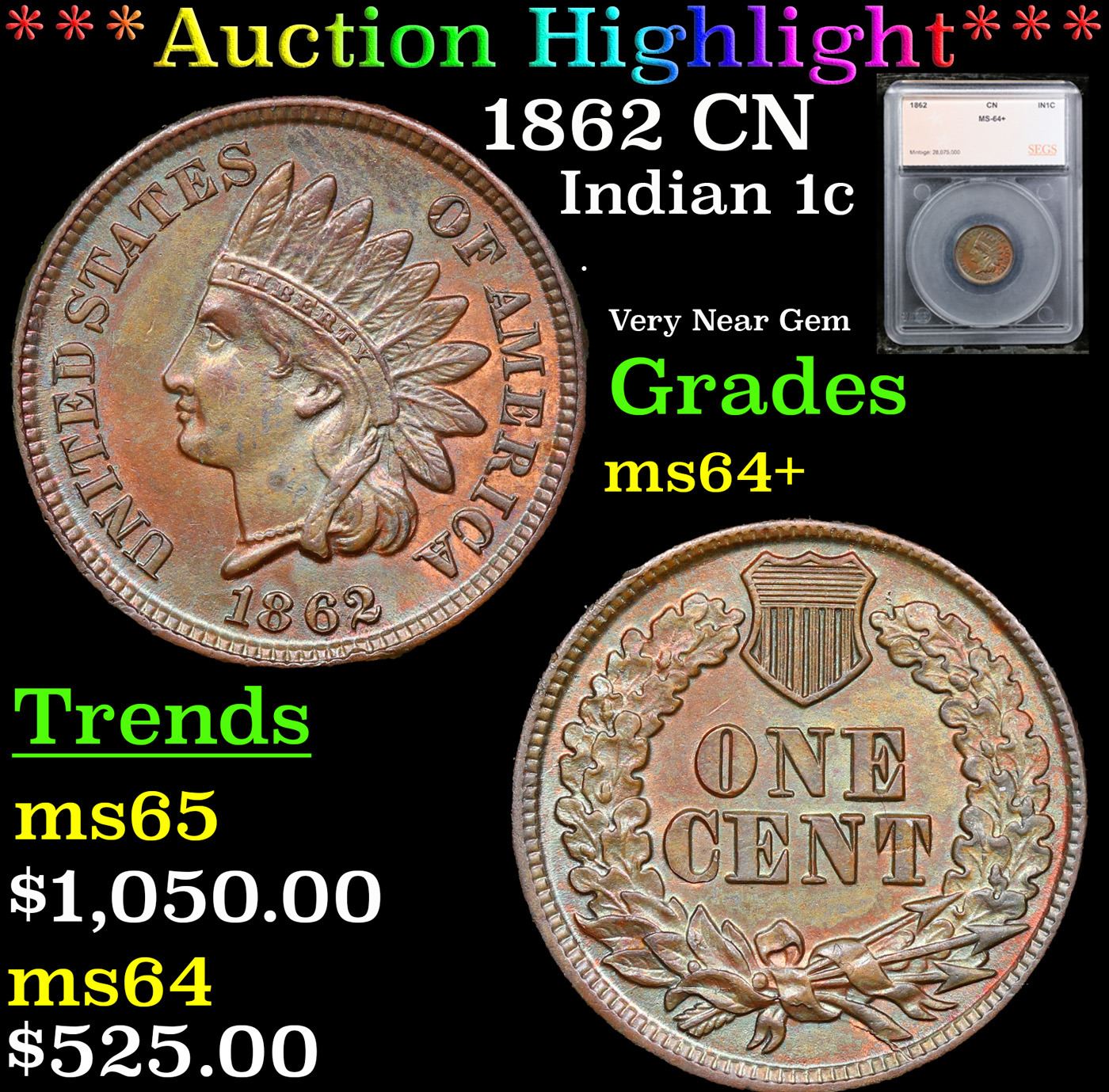 ***Auction Highlight*** 1862 Indian Cent 1c Grades Choice+ Unc By SEGS.