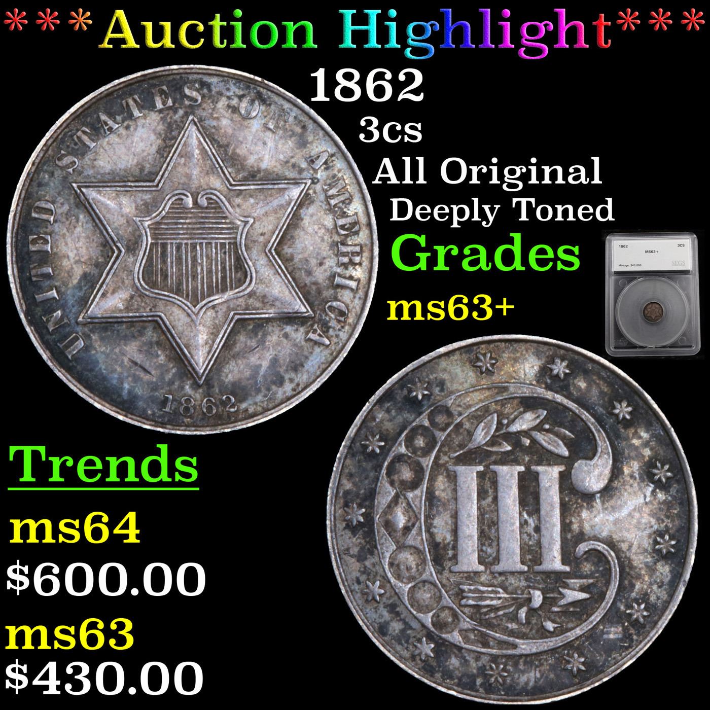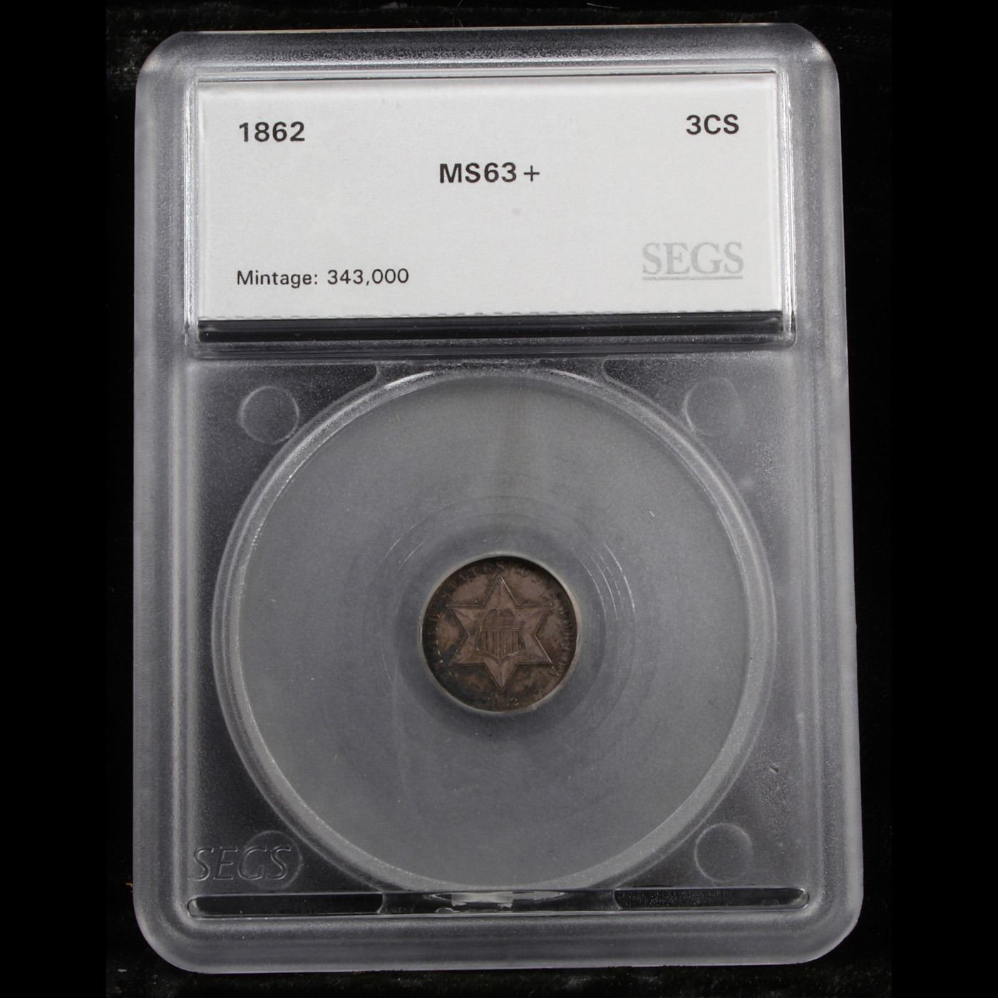 ***Auction Highlight*** 1862 Three Cent Silver 3cs Graded ms63+ By SEGS. A Corey's Pick, Bid to Win Coin