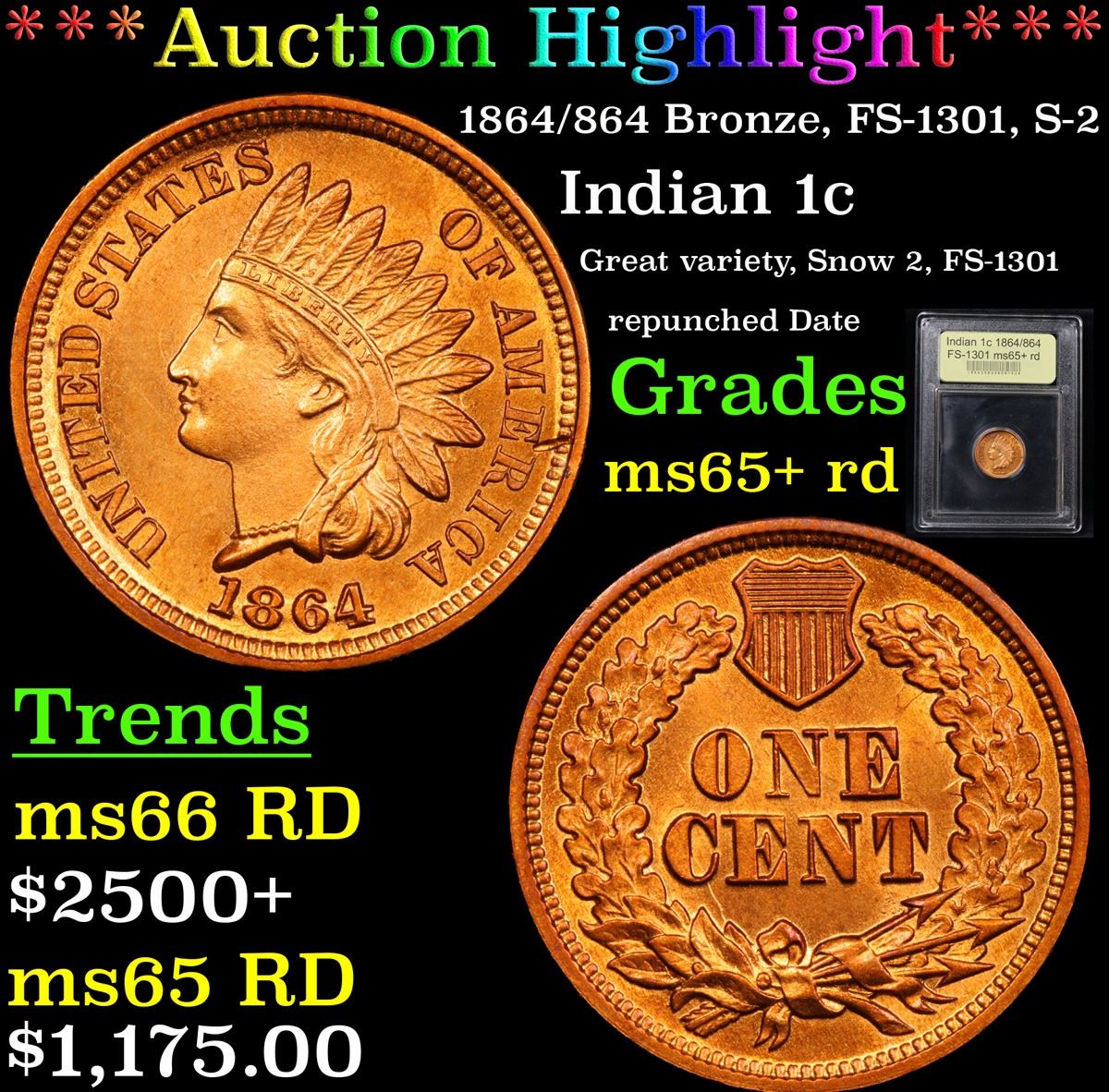 ***Auction Highlight*** 1864/864 Bronze, FS-1301, S-2 Great variety, Snow 2, FS-1301 repunched Date Indian Cent 1c Graded Gem+ Unc RD By USCG. PCGS has only ever graded 1 coin as red and FS-1301!!!!! A Corey's Pick, Bid to Win, Don't let it get Away, you might not find its equal Coin. I give this coin my highest recommendation