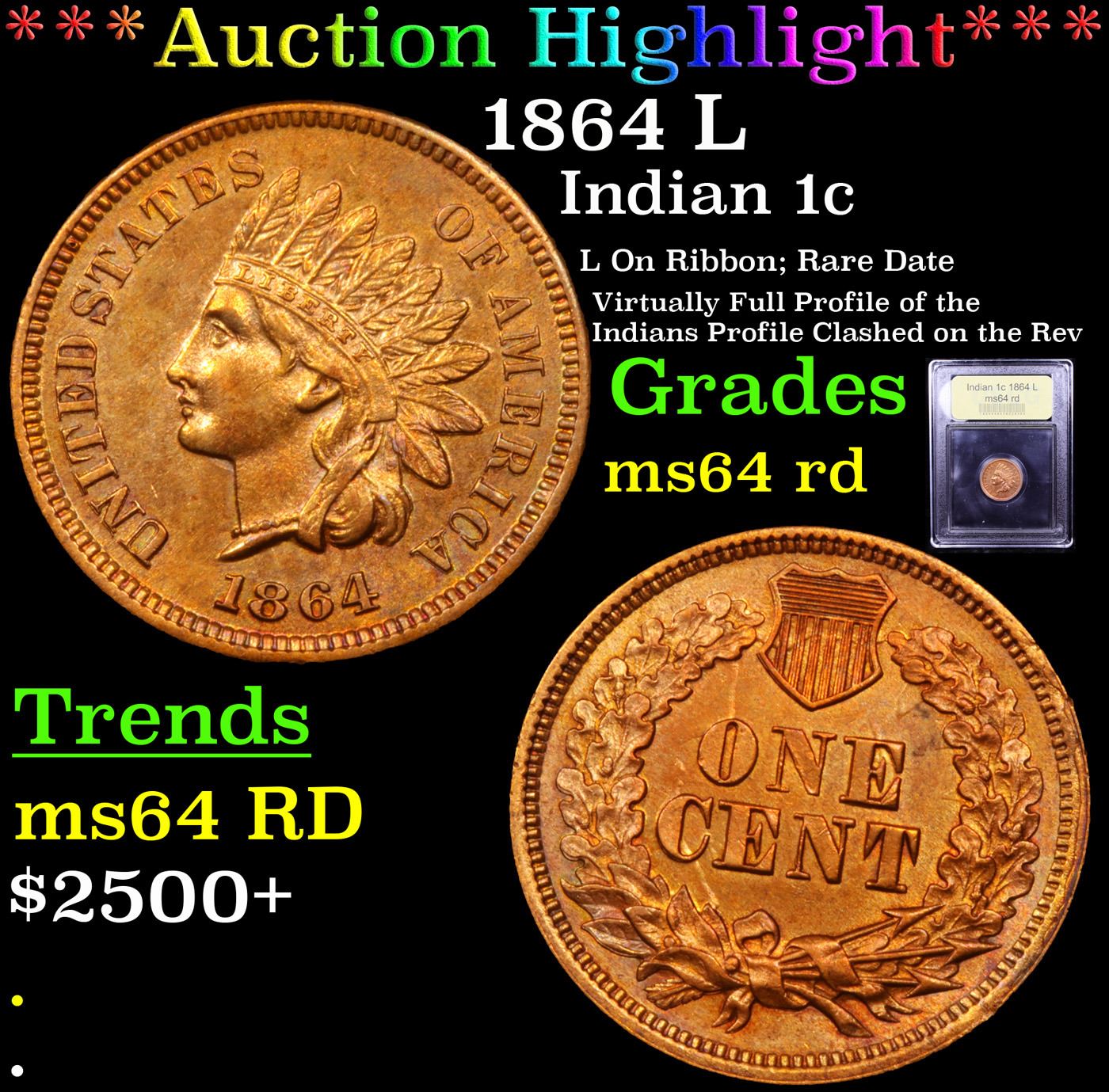 ***Auction Highlight*** 1864 L Indian Cent 1c Graded Choice Unc RD By USCG. Very scarce 1864 L on ribbon Indian cent variety. According to David Hall, “The 1864-L is scarce in circulated grades and very scarce in mint state. However, its price has as much to do with its popularity and importance to collectors as it does with its scarcity. All 1864-L Indian cents have a pointed bust on Ms. Liberty, while the no L’s have a rounded bust. So sometimes low grades are designated (correctly) as L’s even if you can't really see the L. The L on Ribbon variety is much scarcer than its bronze or No L copper-nickel predecessors. This lustrous, butter-gold Gem is devoid of marks. The strike is bold aside from incompleteness on STATES. Coined from clashed dies. A Corey's Pick, Bid to Win, Don't let it get Away Coin