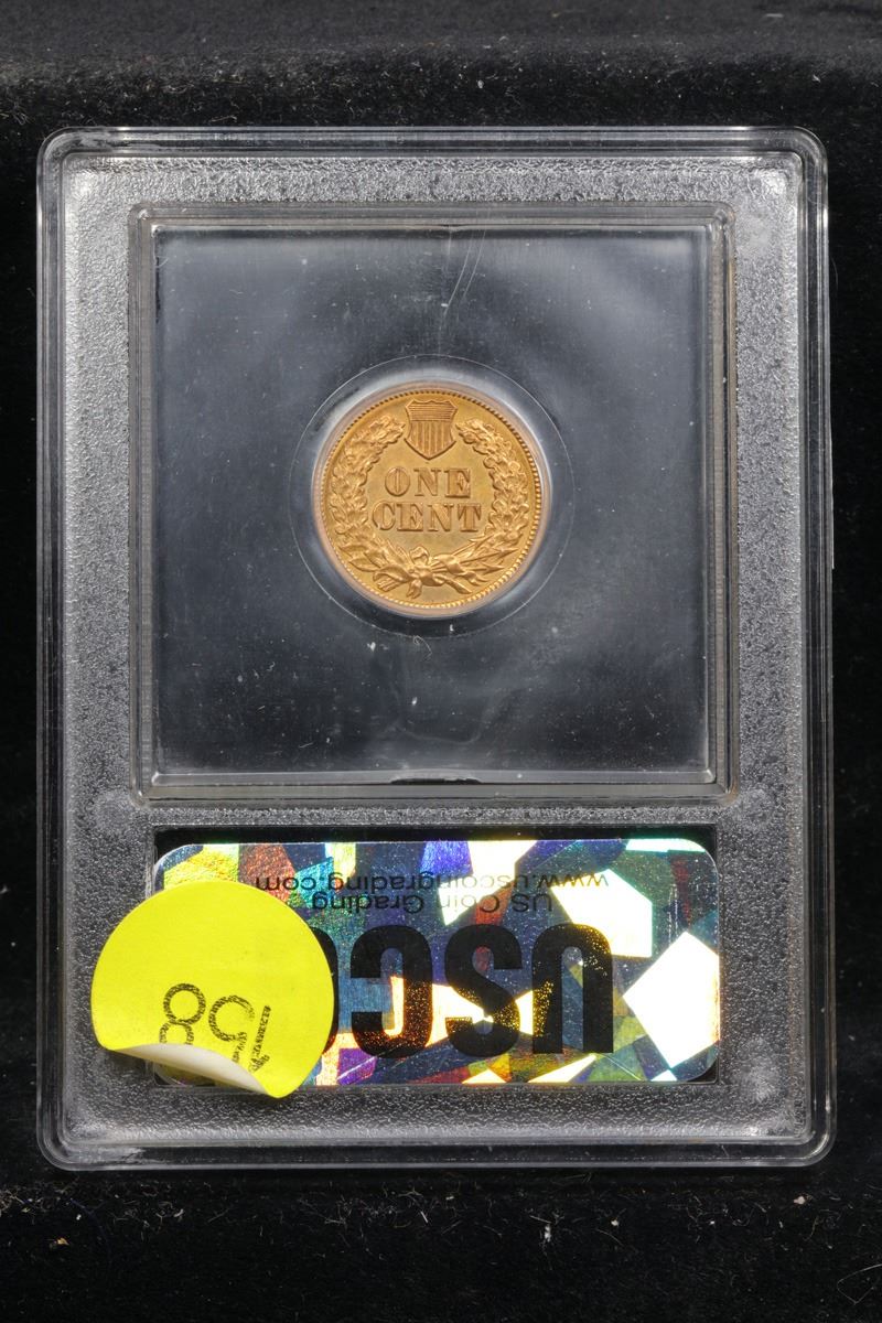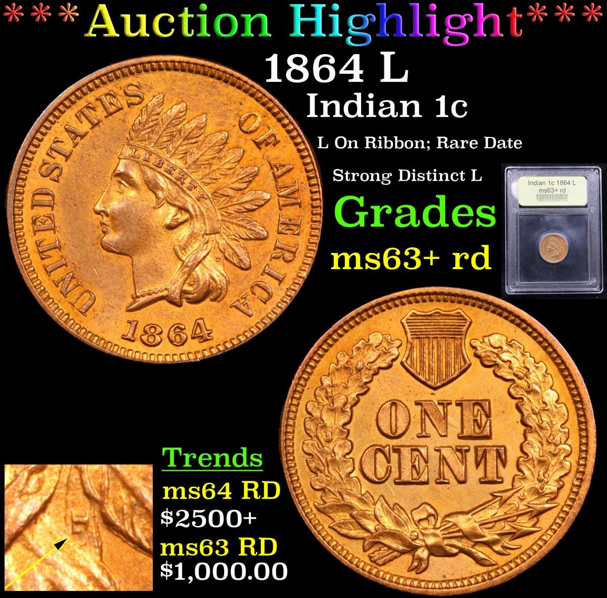 ***Auction Highlight*** 1864 L Indian Cent 1c Graded Select+ Unc RD By USCG. Very scarce 1864 L on ribbon Indian cent variety. According to David Hall, �The 1864-L is scarce in circulated grades and very scarce in mint state. However, its price has as much to do with its popularity and importance to collectors as it does with its scarcity. All 1864-L Indian cents have a pointed bust on Ms. Liberty, while the no L�s have a rounded bust. So sometimes low grades are designated (correctly) as L�s even if you can't really see the L. A Corey's Pick, Bid to Win Coin