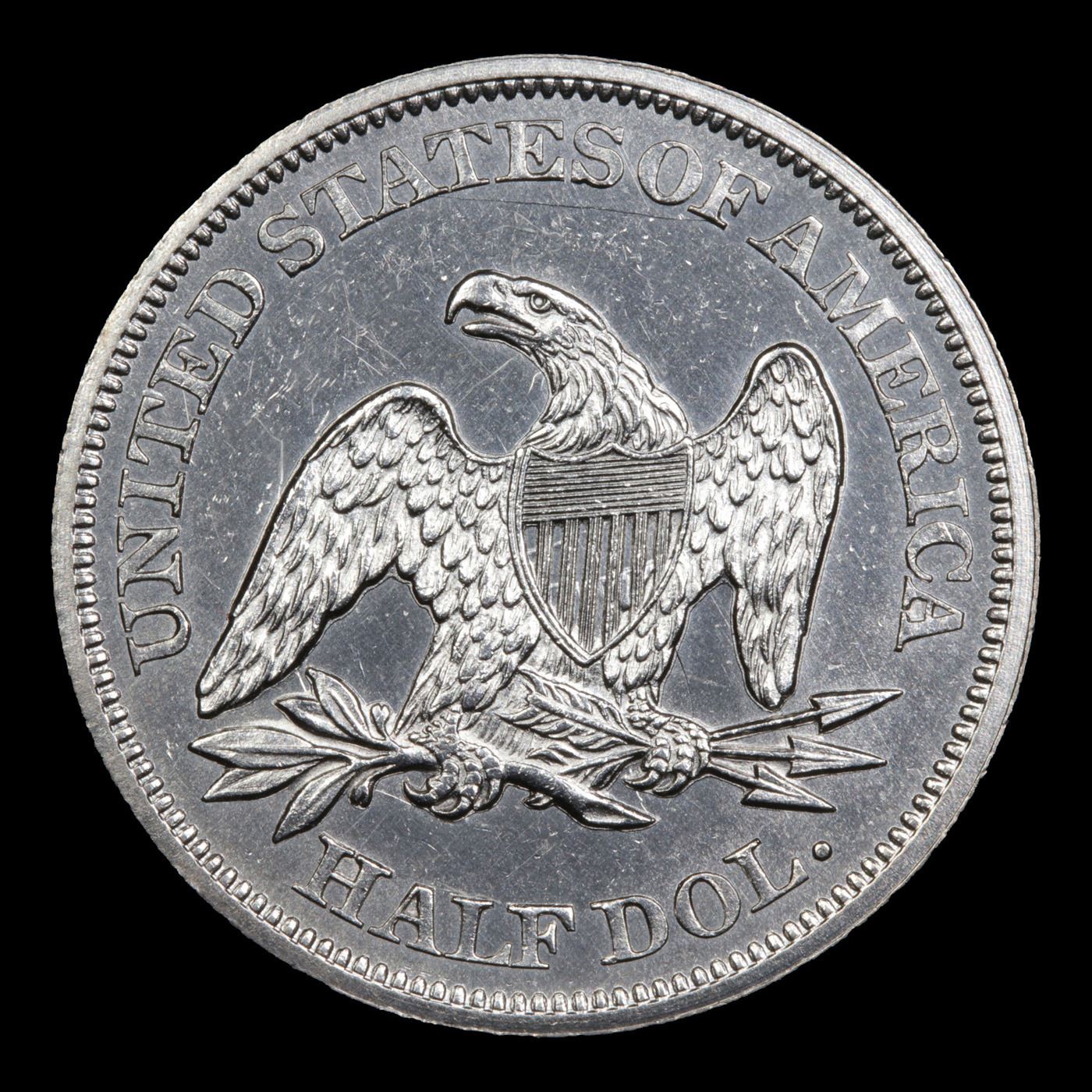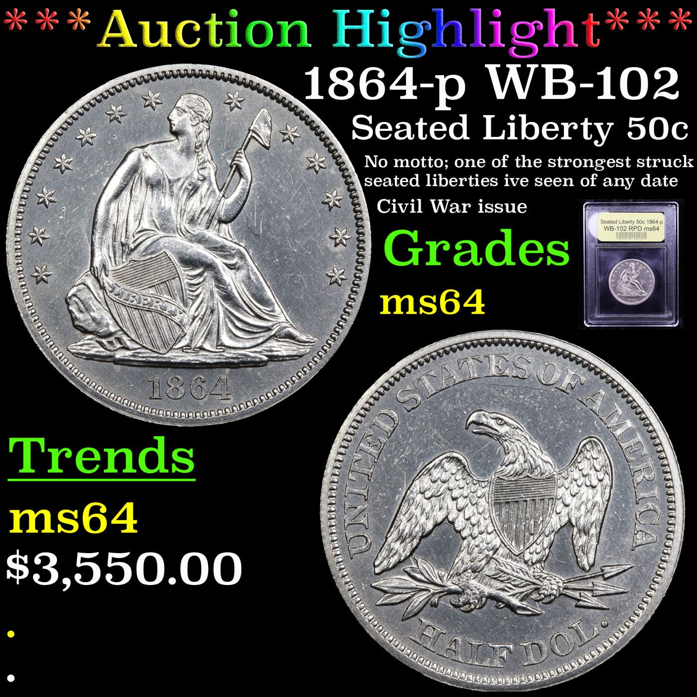 ***Auction Highlight*** 1864-p WB-102 RPD Seated Half Dollar 50c Graded Choice Unc By USCG. Superb example of the Civil War issue. This is the WB-102 Variety. The WB-102 Shows Repunching that is evident on the base of the 1 and the crossbar of the 4. A thin die crack runs along the outer edge of the reverse legends. Heavy clash marks appear throughout. Wiley-Bugert rate this die marriage High R.6 in Mint State. The surfaces appear semi Proof Like, but the highlight of this spectacular coin has to be the razor sharp, deep strike. One of the best strikes I’ve ever seen on any Seated Half. A Corey's Pick, Bid to Win, Don't let it get Away Coin
