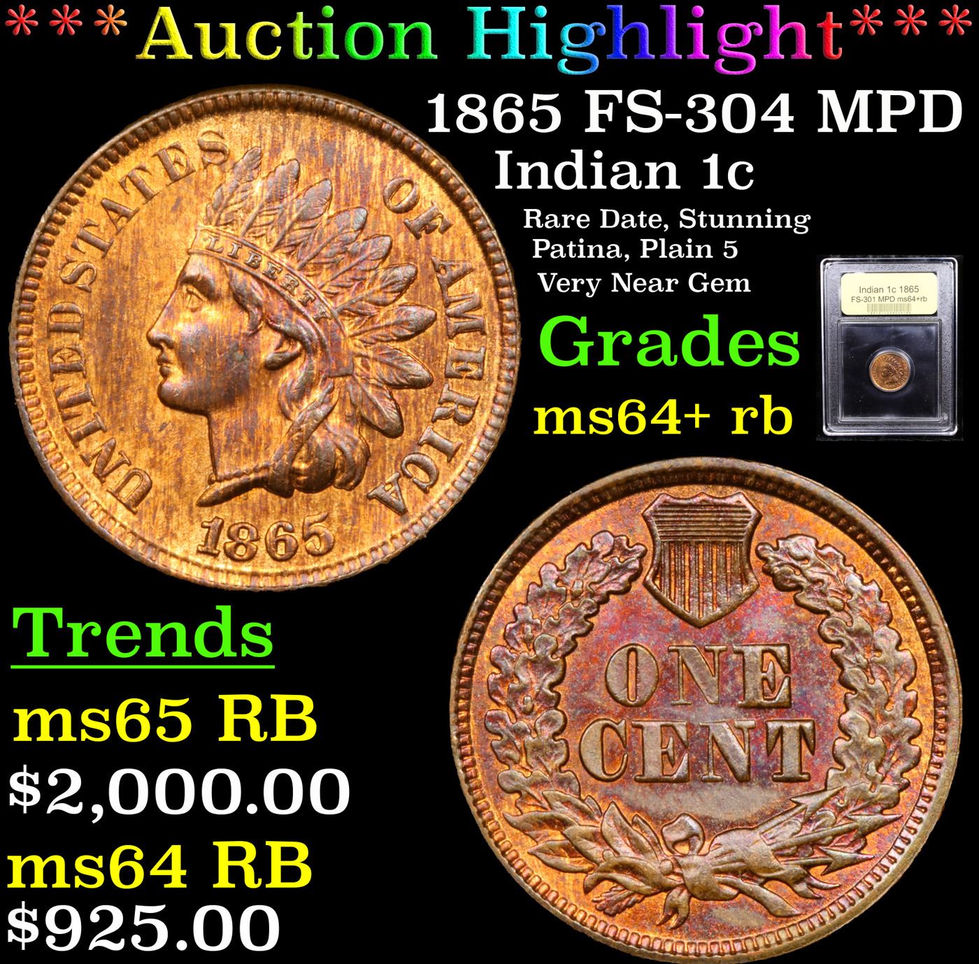 ***Auction Highlight*** 1865 FS-304 MPD Indian Cent 1c Graded Choice+ Unc RB By USCG (fc)