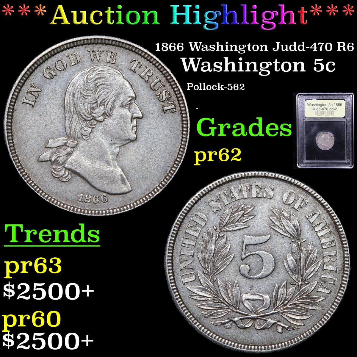 ***Auction Highlight*** 1866 Washington Judd-470 R6 Washington Nickel 5c Graded Select Proof By USCG.