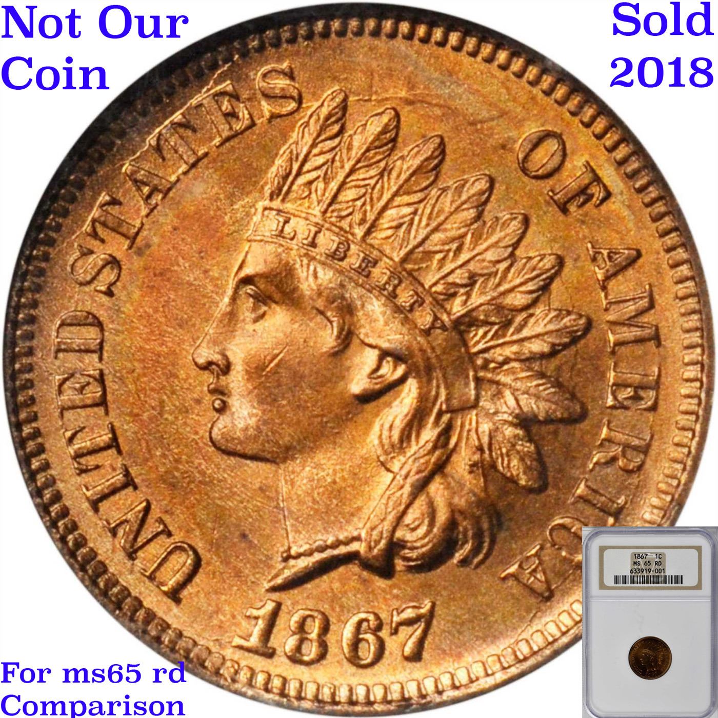 ***Auction Highlight*** 1867 Indian Cent 1c Graded ms65 rd BY SEGS. PCGS estimates only 5000 survive in all grades. A very tough date. Splendid vivid orange surfaces are sharply to fully defined in virtually all areas. Satiny, smooth and very appealing, this is a remarkable 1867 Indian cent. A semi-key date issue in this popular series, the 1867 was produced to the extent of just 9,821,000 pieces. With many examples redeemed and melted during the 1870s, survivors are scarce in circulated grades and rare in Mint State. With the typical Uncirculated coin Brown or Red and Brown in color, this fully lustrous Red Gem is particularly desirable for an advanced Indian cent collection. I’ve included 2 examples for your comparison. A Corey's Pick, Bid to Win, Don't let it get Away, you might not find its equal Coin. I give this coin my highest recommendation