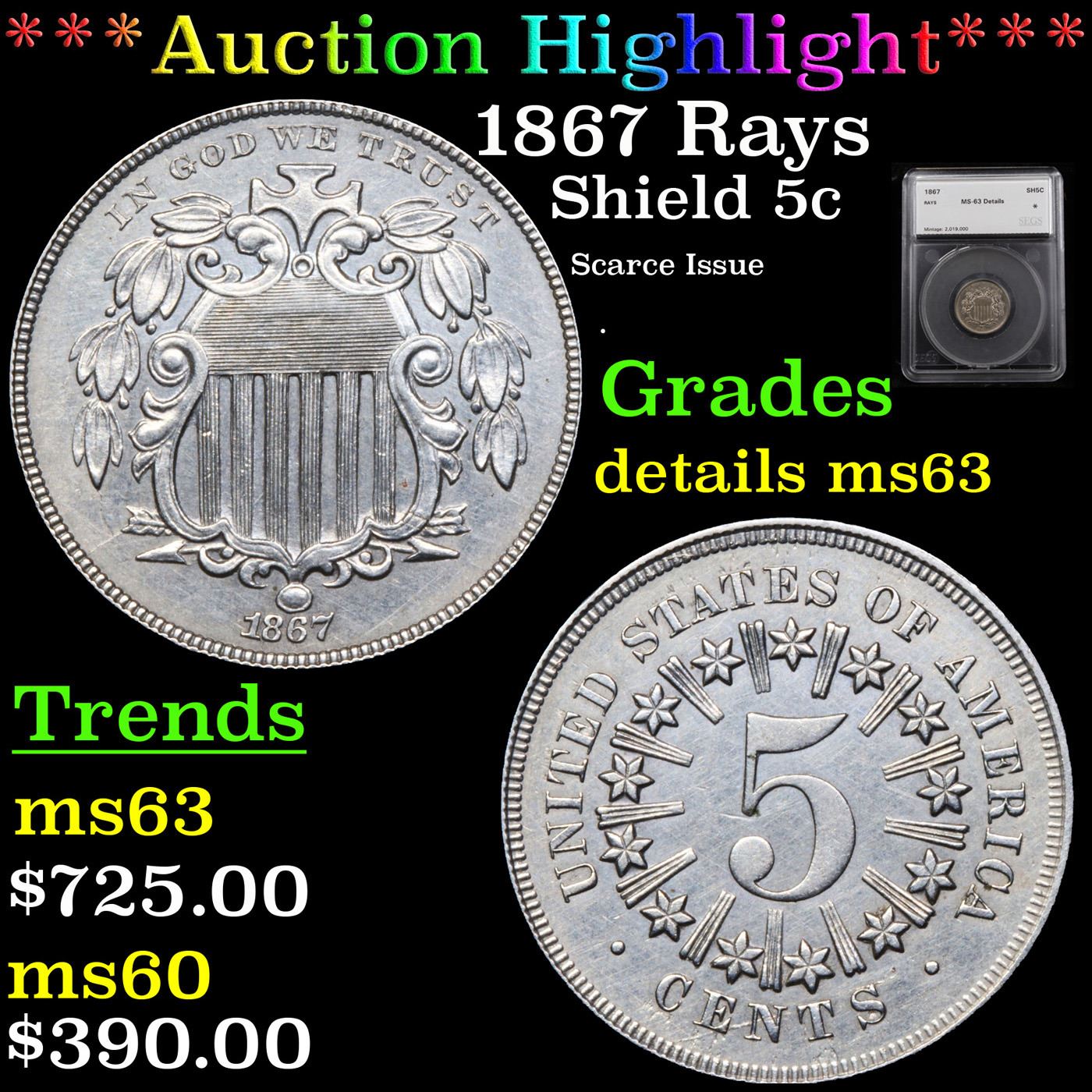 ***Auction Highlight*** 1867 Rays Shield Nickel 5c Graded unc details ms63 By SEGS.
