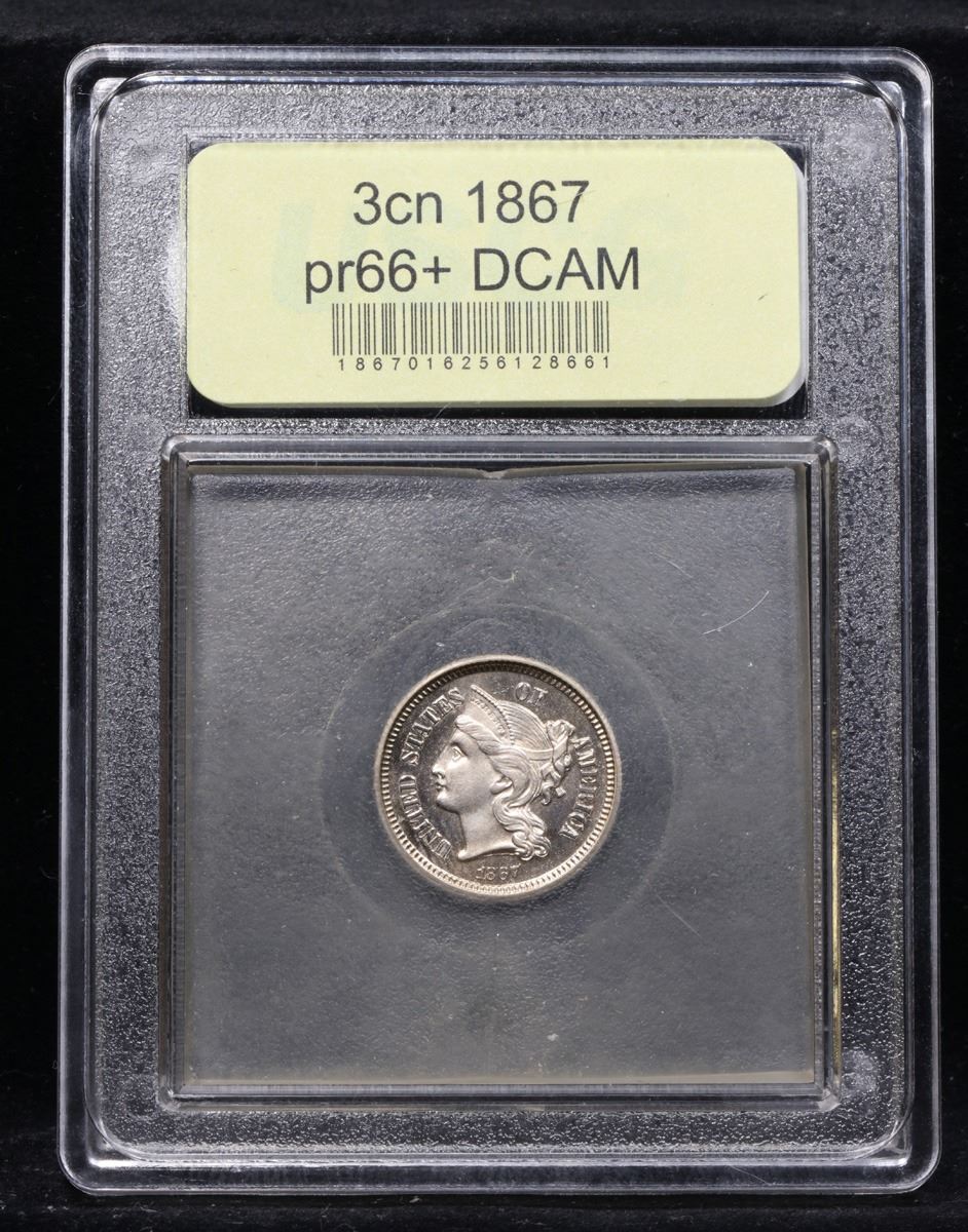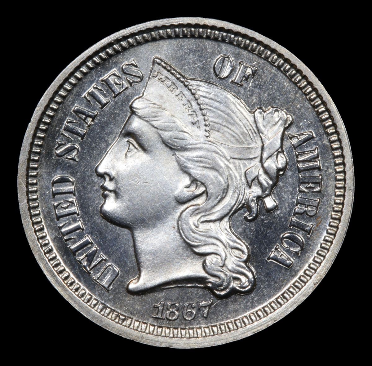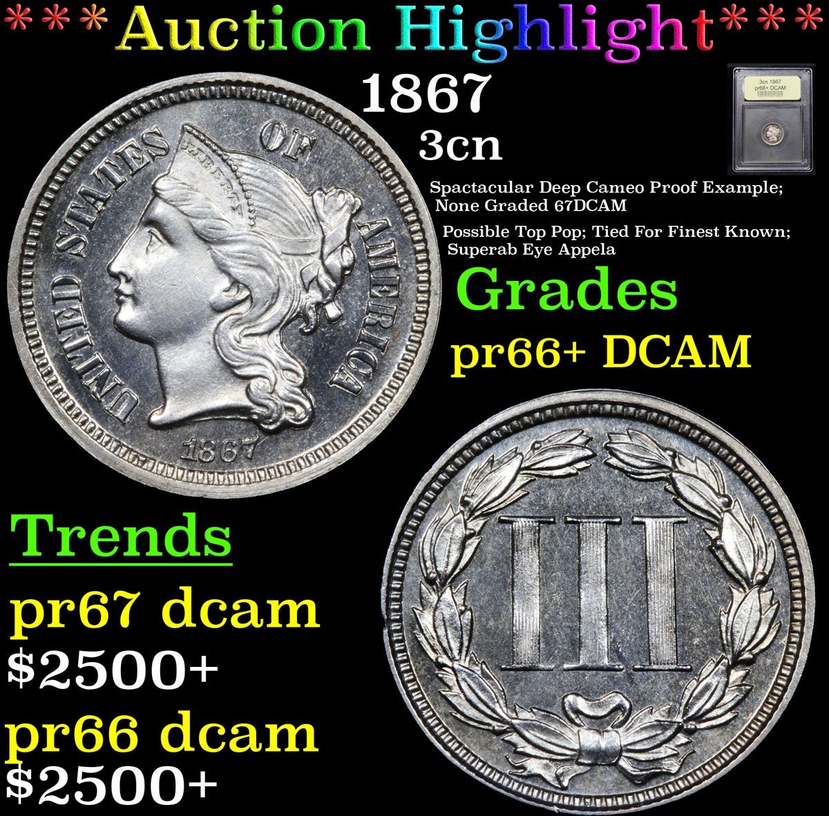 ***Auction Highlight*** 1867 Spectacular Deep Cameo Proof Example; None Graded 67DCAM Possible Top Pop; Tied For Finest Known; Superb Eye Appeal Three Cent Copper Nickel 3cn Graded GEM++ Proof Deep Cameo By USCG. A Corey's Pick, Bid to Win, Don't let it get Away Coin