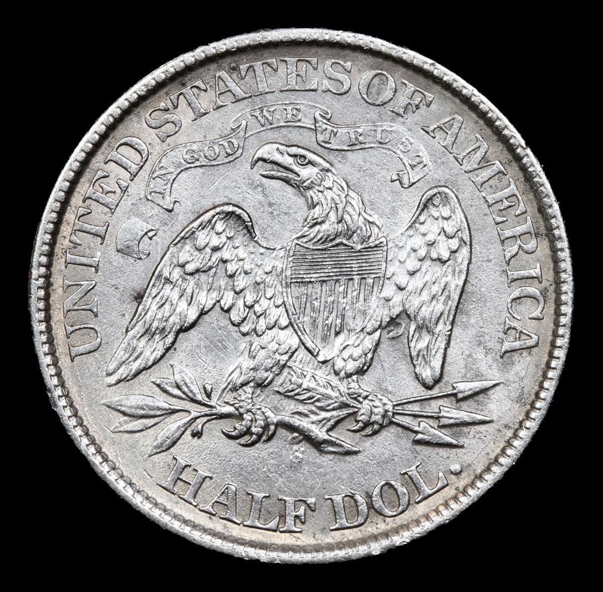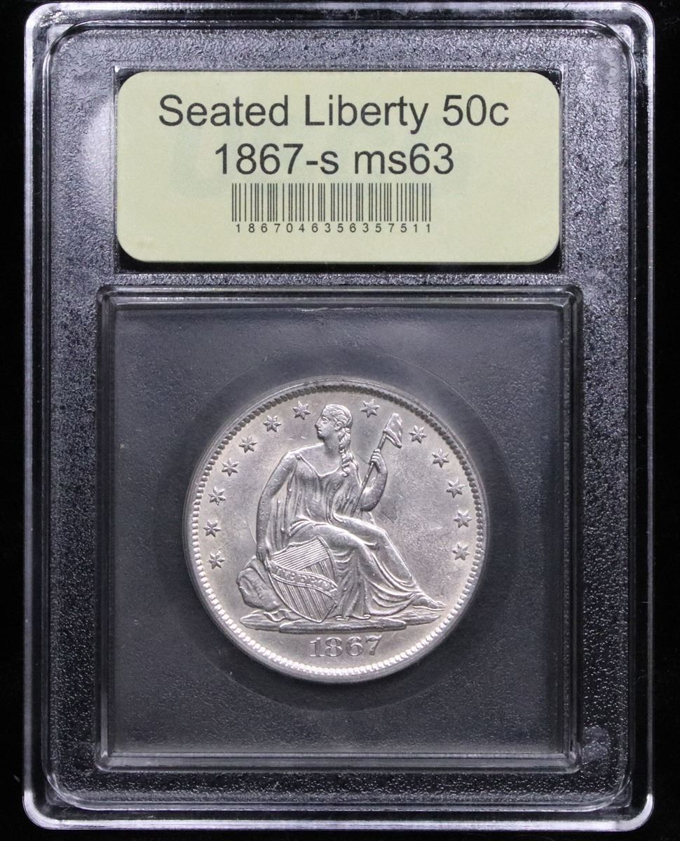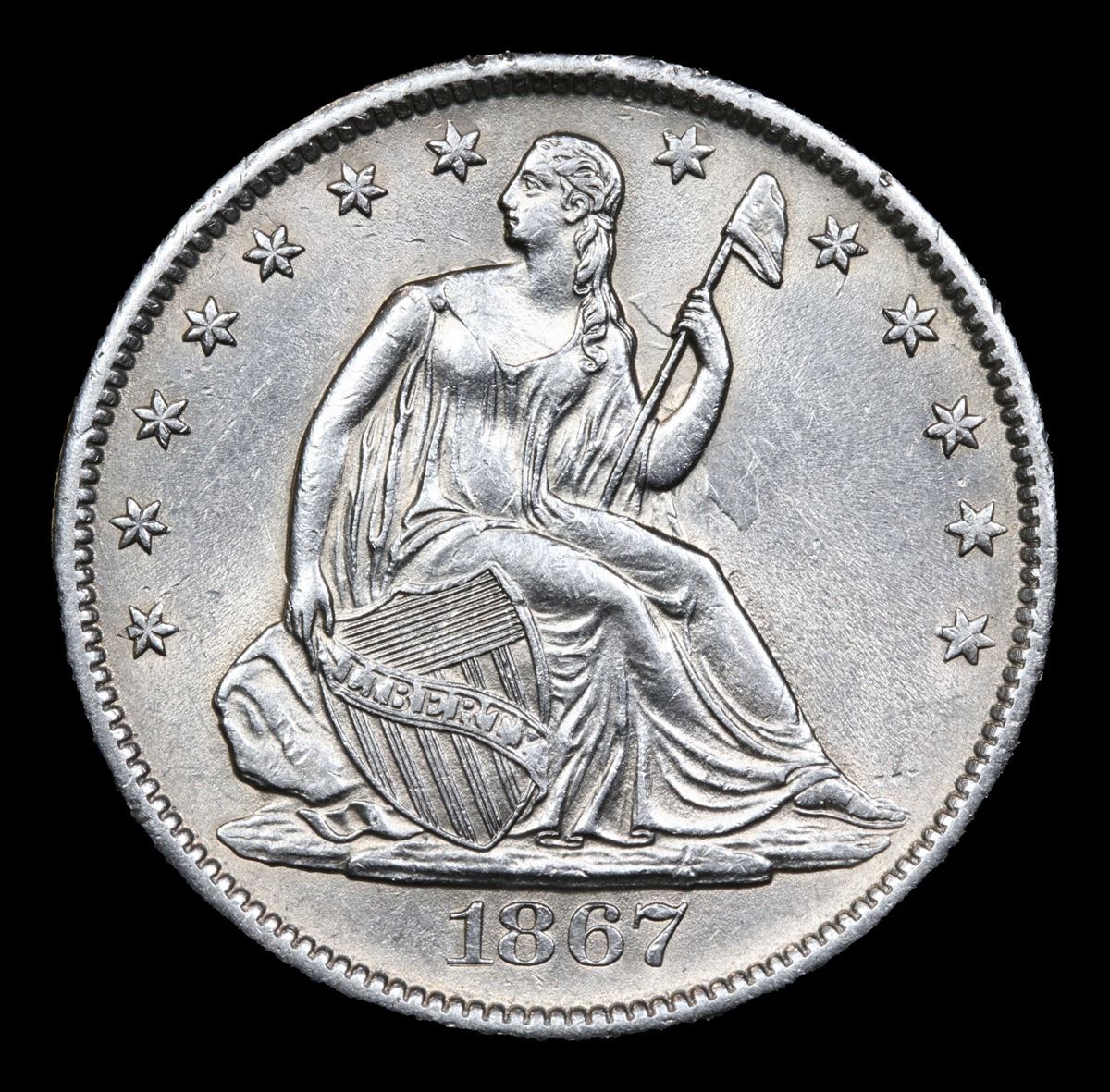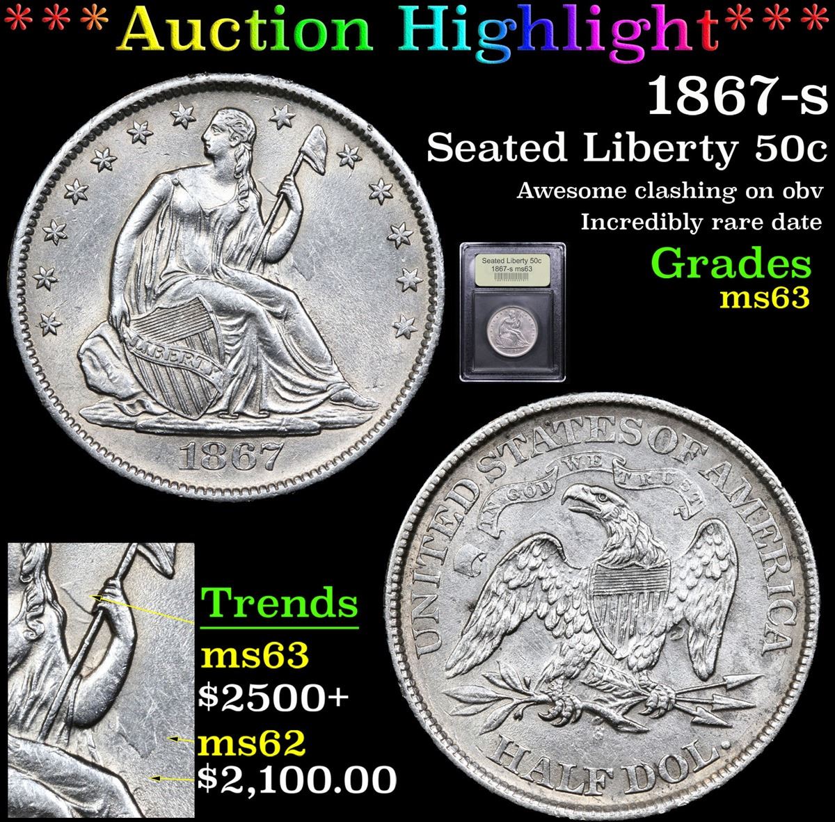 ***Auction Highlight*** 1867-s Awesome clashing on obv Incredibly rare date Seated Half Dollar 50c Graded Select Unc By USCG. 0 Per Ron Guth of PCGS "the 1869-s half dollar have a scant group of mint state survivors" PCGS estimates that only 30 examples survive in uncirculated condition