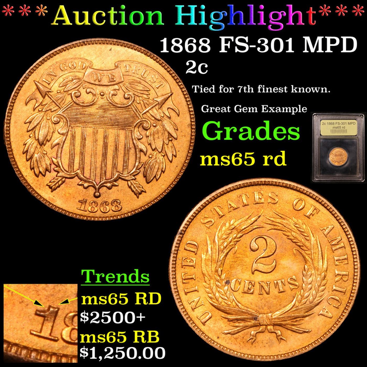 ***Auction Highlight*** 1868 FS-301 MPD Two Cent Piece 2c Graded GEM Unc RD By USCG (fc)
